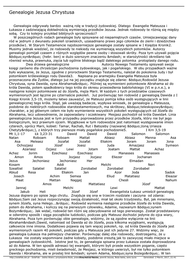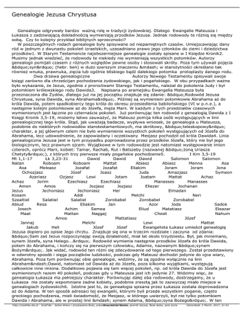 Genealogie Jezusa Chrystusa Genealogie odgrywały bardzo ważną rolę w tradycji żydowskiej. Dlatego Ewangelie Mateusza i Łukasza z zadziwiającą dokładnością wymieniają przodków Jezusa. Jednak rodowody te różnią się między sobą. Czy to kolejny przykład biblijnych sprzeczności? W poszczególnych rodach genealogie były spisywane od niepamiętnych czasów. Umiejscawiając dany ród w jednym z dwunastu pokoleń izraelskich, uzasadniano prawo jego członków do ziemi i dziedzictwa przodków1. W Starym Testamencie najobszerniejsze genealogie zostały spisane w I Księdze Kronik2. Musimy jednak wiedzieć, że rodowody te niekiedy nie wymieniają wszystkich potomków. Autorzy genealogii pomijali czasem z różnych względów pewne osoby i stosowali skróty. Poza tym używali pojęcia „syn” (hebr. ben) w dużo szerszym znaczeniu — w starożytności określano tak również wnuka, prawnuka, zięcia lub ogólnie bliskiego bądź dalekiego potomka protoplasty danego rodu. Dwa drzewa genealogiczne Autorzy Nowego Testamentu spisywali swoje księgi zarówno dla chrześcijan pochodzenia żydowskiego, jak i pogańskiego. W obu przypadkach ważne było wykazanie, że Jezus, zgodnie z proroctwami Starego Testamentu, należał do pokolenia Judy i był potomkiem królewskiego rodu Dawida3. Napisana po aramejsku Ewangelia Mateusza była przeznaczona dla Żydów, dlatego już na jej początku znajduje się zdanie: „Rodowód Jezusa Chrystusa, syna Dawida, syna Abrahama”. Później są wymienieni potomkowie Abrahama aż do króla Dawida, potem spadkobiercy tego króla do okresu przesiedlenia babilońskiego (VI w p.n.e.), a następnie kolejni potomkowie aż do Józefa, męża Marii. W każdym z tych przedziałów czasowych wymienionych jest łącznie po czternaście pokoleń. Już porównując ten rodowód z genealogią Dawida z I Księgi Kronik 3,5-19, możemy łatwo zauważyć, że Mateusz pomija kilka osób występujących w linii genealogicznej tego króla. Stąd, jak uważają badacze, wypływa wniosek, że genealogia u Mateusza, podobnie do niektórych rodowodów starotestamentowych, ma skrótowy, „teleskopowy” charakter, a jej głównym celem nie było wymienienie wszystkich pokoleń występujących od Józefa do Abrahama, lecz udowodnienie, że zapowiadany i oczekiwany Mesjasz pochodził od króla Dawida4. Linia genealogiczna Jezusa jest w tym przypadku poprowadzona przez przodków Józefa, który nie był jego biologicznym, lecz prawnym ojcem. Wyjątkowe w tym rodowodzie jest natomiast występowanie imion czterech, oprócz Marii, kobiet: Tamar, Rachab, Rut i Batszeby (nazwanej „żoną Uriasza Chetyty”), z których trzy pierwsze miały pogańskie pochodzenie5. I Krn 3,5-19 Mt 1,1-17 Łk 3,23-31 Dawid Dawid Dawid Salomon Salomon Natan Roboam Roboam Mattat Abiasz Abiasz Menna Asa Asa Meleasz Jozafat Jozafat Eliakim Joram Joram Jona Ochozjasz Józef Joasz Juda Amazjasz Symeon Azariasz Ozjasz Lewi Jotam Joatam Mattat Achaz Achaz Jorim Ezechiasz Ezechiasz Manasses Manasses Amon Amos Jozjasz Jozjasz Eliezer Jochanan Jezus Jechoniasz Jechoniasz Her Elmadan Kosam Addi Melchi Neri Szealtiel Salatiel Salatiel Zorobabel Zorobabel Zorobabel Abiud Resa Eliakim Jan Azor Joda Sadok Josech Achim Semea Eliud Matatiasz Eleazar Maat Mattan Naggaj Chesli Nahum Amos Mattatiasz Józef Jannaj Melchi Lewi Mattat Jakub Heli Józef Józef Ewangelista Łukasz umieścił genealogię Jezusa dopiero po opisie Jego chrztu. Znajduje się ona w trzecim rozdziale i zaczyna od zdania: „Sam zaś Jezus rozpoczynając swoją działalność, miał lat około trzydziestu. Był, jak mniemano, synem Józefa, syna Helego...”. Rodowód wymienia następnie przodków Józefa do króla Dawida, potem do Abrahama, i kończy się na pierwszym człowieku, Adamie, nazwanym „synem Bożym”. Jak widać, rodowód ten różni się zdecydowanie od tego pierwszego. Został przedstawiony w odwrotny sposób i sięga początków ludzkości, podczas gdy Mateusz dochodzi jedynie do ojca wiary, Abrahama. Poza tym porównując obie genealogie, widzimy, że są zgodne wyłącznie na linii Abraham–Dawid, natomiast od Dawida aż do Józefa, poza kilkoma wyjątkami, występują całkowicie inne imiona. Dodatkowo pojawia się tam więcej pokoleń, np. od króla Dawida do Józefa jest wymienionych razem 40 pokoleń, podczas gdy u Mateusza jest ich jedynie 27. Widzimy więc, że genealogia Łukasza ma pełniejszy charakter. Porównując dalej oba rodowody, dostrzegamy, że u Łukasza nie zostały wspomniane żadne kobiety, podobnie zresztą jak to zazwyczaj miało miejsce w genealogiach żydowskich6. Istotne jest to, że genealogia spisana przez Łukasza została doprowadzona aż do Adama. W ten sposób adresaci tej ewangelii, którymi byli przede wszystkim poganie, często greckiego pochodzenia, mieli świadomość, że Mesjasz, w którego uwierzyli, był nie tylko potomkiem Dawida i Abrahama, ale w prostej linii — synem Adama, „syna Bożego”. W ten http://solafide.dei.pl - SolaFide - Jedna Wiara | przykazania Boże, prawdziwy Powered kościół by Mambo Jezusa, powrót Jezusa, Boża łaska, sens życia Generated: 2 March, 2017, 21:41 sposób Jezus miał podwójną godność Syna Bożego — jako osoba zrodzona z Ducha Świętego w łonie kobiety oraz jako potomek Adama7. Genealogia Jezusa wg Ew. Mateusza i Drzewo Jessego, Cappuchin’s Bible, 1180 r. (Paryż) Czy rodowody Jezusa są sprzeczne? Jak możemy przypuszczać, wymienione niezgodności pomiędzy rodowodami Jezusa stanowią pożywkę dla wielu krytyków chrześcijaństwa8. Jakie są więc próby teologicznego wyjaśnienia tych sprzeczności? Porównując oba rodowody, widzimy, że u Mateusza linia potomków króla Dawida jest prezentowana przez Salomona (którego matką była Batszeba), natomiast u Łukasza ciągnie się ona przez innego z synów Dawida — Natana9. Stąd biorą się dalsze różnice. Wśród potomków Salomona występują pokolenia królewskie, a