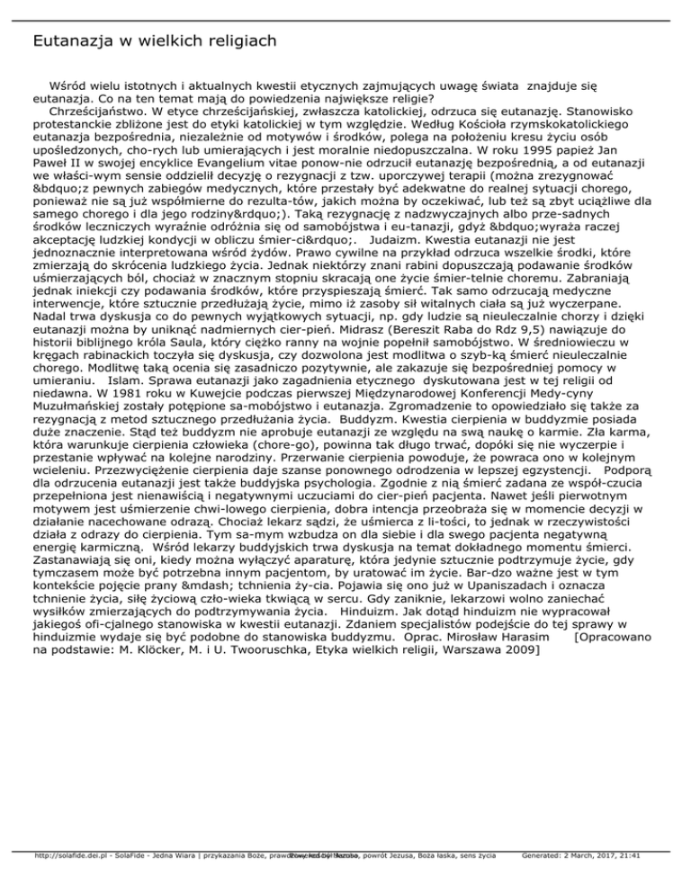 Eutanazja w wielkich religiach Wśród wielu istotnych i aktualnych kwestii etycznych zajmujących uwagę świata znajduje się eutanazja. Co na ten temat mają do powiedzenia największe religie? Chrześcijaństwo. W etyce chrześcijańskiej, zwłaszcza katolickiej, odrzuca się eutanazję. Stanowisko protestanckie zbliżone jest do etyki katolickiej w tym względzie. Według Kościoła rzymskokatolickiego eutanazja bezpośrednia, niezależnie od motywów i środków, polega na położeniu kresu życiu osób upośledzonych, cho-rych lub umierających i jest moralnie niedopuszczalna. W roku 1995 papież Jan Paweł II w swojej encyklice Evangelium vitae ponow-nie odrzucił eutanazję bezpośrednią, a od eutanazji we właści-wym sensie oddzielił decyzję o rezygnacji z tzw. uporczywej terapii (można zrezygnować „z pewnych zabiegów medycznych, które przestały być adekwatne do realnej sytuacji chorego, ponieważ nie są już współmierne do rezulta-tów, jakich można by oczekiwać, lub też są zbyt uciążliwe dla samego chorego i dla jego rodziny”). Taką rezygnację z nadzwyczajnych albo prze-sadnych środków leczniczych wyraźnie odróżnia się od samobójstwa i eu-tanazji, gdyż „wyraża raczej akceptację ludzkiej kondycji w obliczu śmier-ci”. Judaizm. Kwestia eutanazji nie jest jednoznacznie interpretowana wśród żydów. Prawo cywilne na przykład odrzuca wszelkie środki, które zmierzają do skrócenia ludzkiego życia. Jednak niektórzy znani rabini dopuszczają podawanie środków uśmierzających ból, chociaż w znacznym stopniu skracają one życie śmier-telnie choremu. Zabraniają jednak iniekcji czy podawania środków, które przyspieszają śmierć. Tak samo odrzucają medyczne interwencje, które sztucznie przedłużają życie, mimo iż zasoby sił witalnych ciała są już wyczerpane. Nadal trwa dyskusja co do pewnych wyjątkowych sytuacji, np. gdy ludzie są nieuleczalnie chorzy i dzięki eutanazji można by uniknąć nadmiernych cier-pień. Midrasz (Bereszit Raba do Rdz 9,5) nawiązuje do historii biblijnego króla Saula, który ciężko ranny na wojnie popełnił samobójstwo. W średniowieczu w kręgach rabinackich toczyła się dyskusja, czy dozwolona jest modlitwa o szyb-ką śmierć nieuleczalnie chorego. Modlitwę taką ocenia się zasadniczo pozytywnie, ale zakazuje się bezpośredniej pomocy w umieraniu. Islam. Sprawa eutanazji jako zagadnienia etycznego dyskutowana jest w tej religii od niedawna. W 1981 roku w Kuwejcie podczas pierwszej Międzynarodowej Konferencji Medy-cyny Muzułmańskiej zostały potępione sa-mobójstwo i eutanazja. Zgromadzenie to opowiedziało się także za rezygnacją z metod sztucznego przedłużania życia. Buddyzm. Kwestia cierpienia w buddyzmie posiada duże znaczenie. Stąd też buddyzm nie aprobuje eutanazji ze względu na swą naukę o karmie. Zła karma, która warunkuje cierpienia człowieka (chore-go), powinna tak długo trwać, dopóki się nie wyczerpie i przestanie wpływać na kolejne narodziny. Przerwanie cierpienia powoduje, że powraca ono w kolejnym wcieleniu. Przezwyciężenie cierpienia daje szanse ponownego odrodzenia w lepszej egzystencji. Podporą dla odrzucenia eutanazji jest także buddyjska psychologia. Zgodnie z nią śmierć zadana ze współ-czucia przepełniona jest nienawiścią i negatywnymi uczuciami do cier-pień pacjenta. Nawet jeśli pierwotnym motywem jest uśmierzenie chwi-lowego cierpienia, dobra intencja przeobraża się w momencie decyzji w działanie nacechowane odrazą. Chociaż lekarz sądzi, że uśmierca z li-tości, to jednak w rzeczywistości działa z odrazy do cierpienia. Tym sa-mym wzbudza on dla siebie i dla swego pacjenta negatywną energię karmiczną. Wśród lekarzy buddyjskich trwa dyskusja na temat dokładnego momentu śmierci. Zastanawiają się oni, kiedy można wyłączyć aparaturę, która jedynie sztucznie podtrzymuje życie, gdy tymczasem może być potrzebna innym pacjentom, by uratować im życie. Bar-dzo ważne jest w tym kontekście pojęcie prany — tchnienia ży-cia. Pojawia się ono już w Upaniszadach i oznacza tchnienie życia, siłę życiową czło-wieka tkwiącą w sercu. Gdy zaniknie, lekarzowi wolno zaniechać wysiłków zmierzających do podtrzymywania życia. Hinduizm. Jak dotąd hinduizm nie wypracował jakiegoś ofi-cjalnego stanowiska w kwestii eutanazji. Zdaniem specjalistów podejście do tej sprawy w hinduizmie wydaje się być podobne do stanowiska buddyzmu. Oprac. Mirosław Harasim [Opracowano na podstawie: M. Klöcker, M. i U. Twooruschka, Etyka wielkich religii, Warszawa 2009] http://solafide.dei.pl - SolaFide - Jedna Wiara | przykazania Boże, prawdziwy Powered kościół by Mambo Jezusa, powrót Jezusa, Boża łaska, sens życia Generated: 2 March, 2017, 21:41