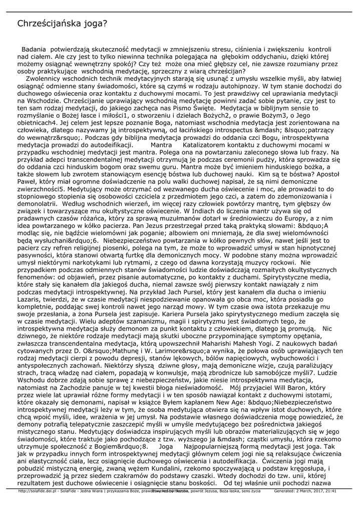 Chrześcijańska joga? Badania potwierdzają skuteczność medytacji w zmniejszeniu stresu, ciśnienia i zwiększeniu kontroli nad ciałem. Ale czy jest to tylko niewinna technika polegająca na głębokim oddychaniu, dzięki której możemy osiągnąć wewnętrzny spokój? Czy też może ona mieć głębszy cel, nie zawsze rozumiany przez osoby praktykujące wschodnią medytację, sprzeczny z wiarą chrześcijan? Zwolennicy wschodnich technik medytacyjnych starają się usunąć z umysłu wszelkie myśli, aby łatwiej osiągnąć odmienne stany świadomości, które są czymś w rodzaju autohipnozy. W tym stanie dochodzi do duchowego oświecenia oraz kontaktu z duchowymi mocami. To jest prawdziwy cel uprawiania medytacji na Wschodzie. Chrześcijanie uprawiający wschodnią medytację powinni zadać sobie pytanie, czy jest to ten sam rodzaj medytacji, do jakiego zachęca nas Pismo Święte. Medytacja w biblijnym sensie to rozmyślanie o Bożej łasce i miłości1, o stworzeniu i dziełach Bożych2, o prawie Bożym3, o Jego obietnicach4. Jej celem jest lepsze poznanie Boga, natomiast wschodnia medytacja jest zorientowana na człowieka, dlatego nazywamy ją introspektywną, od łacińskiego introspectus — ‘patrzący do wewnątrz’. Podczas gdy biblijna medytacja prowadzi do oddania czci Bogu, introspektywna medytacja prowadzi do autodeifikacji. Mantra Katalizatorem kontaktu z duchowymi mocami w przypadku wschodniej medytacji jest mantra. Polega ona na powtarzaniu zaleconego słowa lub frazy. Na przykład adepci transcendentalnej medytacji otrzymują je podczas ceremonii pudży, która sprowadza się do oddania czci hinduskim bogom oraz swemu guru. Mantra może być imieniem hinduskiego bożka, a także słowem lub zwrotem stanowiącym esencję bóstwa lub duchowej nauki. Kim są te bóstwa? Apostoł Paweł, który miał ogromne doświadczenie na polu walki duchowej napisał, że są nimi demoniczne zwierzchności5. Medytujący może otrzymać od wezwanego ducha oświecenie i moc, ale prowadzi to do stopniowego stopienia się osobowości czciciela z przedmiotem jego czci, a zatem do zdemonizowania i demonolatrii. Według wschodnich wierzeń, im więcej razy człowiek powtórzy mantrę, tym głębszy ów związek i towarzyszące mu okultystyczne oświecenie. W Indiach do liczenia mantr używa się od pradawnych czasów różańca, który za sprawą muzułmanów dotarł w średniowieczu do Europy, a z nim idea powtarzanego w kółko pacierza. Pan Jezus przestrzegał przed taką praktyką słowami: „A modląc się, nie bądźcie wielomówni jak poganie; albowiem oni mniemają, że dla swej wielomówności będą wysłuchani”6. Niebezpieczeństwo powtarzania w kółko pewnych słów, nawet jeśli jest to pacierz czy refren religijnej piosenki, polega na tym, że może to wprowadzić umysł w stan hipnotycznej pasywności, która stanowi otwartą furtkę dla demonicznych mocy. W podobne stany można wprowadzić umysł niektórymi narkotykami lub rytmami, z czego od dawna korzystają muzycy rockowi. Nie przypadkiem podczas odmiennych stanów świadomości ludzie doświadczają rozmaitych okultystycznych fenomenów: od objawień, przez pisanie automatyczne, po kontakty z duchami. Spirytystyczne media, które stały się kanałem dla jakiegoś ducha, niemal zawsze swój pierwszy kontakt nawiązały z nim podczas medytacji introspektywnej. Na przykład Jach Pursel, który jest kanałem dla ducha o imieniu Lazaris, twierdzi, że w czasie medytacji niespodziewanie opanowała go obca moc, która posiadła go kompletnie, poddając swej kontroli nawet jego narząd mowy. W tym czasie owa istota przekazuje mu swoje przesłania, a żona Pursela jest zapisuje. Kariera Pursela jako spirytystycznego medium zaczęła się w czasie medytacji. Wielu adeptów szamanizmu, magii i spirytyzmu jest świadomych tego, że introspektywna medytacja służy demonom za punkt kontaktu z człowiekiem, dlatego ją promują. Nic dziwnego, że niektóre rodzaje medytacji mają skutki uboczne przypominające symptomy opętania, zwłaszcza transcendentalna medytacja, którą upowszechnił Maharishi Mahesh Yogi. Z naukowych badań cytowanych przez D. O’Mathunę i W. Larimore’a wynika, że połowa osób uprawiających ten rodzaj medytacji cierpi z powodu depresji, stanów lękowych, bólów napięciowych, wybuchowości i antyspołecznych zachowań. Niektórzy słyszą dziwne głosy, mają demoniczne wizje, czują paraliżujący strach, tracą władzę nad ciałem, popadają w konwulsje, mają zbrodnicze lub samobójcze myśli7. Ludzie Wschodu dobrze zdają sobie sprawę z niebezpieczeństw, jakie niesie introspektywna medytacja, natomiast na Zachodzie panuje w tej kwestii błoga nieświadomość. Mój przyjaciel Will Baron, który przez wiele lat uprawiał różne formy medytacji i w ten sposób nawiązał kontakt z duchowymi istotami, które okazały się demonami, napisał w książce Byłem kapłanem New Age: „Niebezpieczeństwo introspektywnej medytacji leży w tym, że osoba medytująca otwiera się na wpływ istot duchowych, które chcą wpoić myśli, idee, wrażenia w jej umysł. Na podstawie własnego doświadczenia mogę powiedzieć, że demony potrafią telepatycznie zaszczepić myśli w umyśle medytującego bez pośrednictwa jakiegoś mistycznego stanu. Medytujący doświadcza inspirujących myśli lub obrazów materializujących się w jego świadomości, które traktuje jako pochodzące z tzw. wyższego ja — cząstki umysłu, która rzekomo utrzymuje społeczność z Bogiem”8. Joga Najpopularniejszą formą medytacji jest joga. Tak jak w przypadku innych form introspektywnej medytacji głównym celem jogi nie są relaksujące ćwiczenia ani elastyczność ciała, lecz osiągnięcie duchowego oświecenia i autodeifikacja. Ćwiczenia jogi mają pobudzić mistyczną energię, zwaną wężem Kundalini, rzekomo spoczywającą u podstaw kręgosłupa, i przeprowadzić ją przez siedem czakramów do podstaw