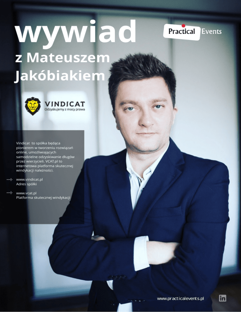 wywiad z Mateuszem Jakóbiakiem Vindicat to spółka będąca pionierem w tworzeniu rozwiązań online, umożliwiających samodzielne odzyskiwanie długów przez wierzycieli. VCAT.pl to internetowa platforma skutecznej windykacji należności. www.vindicat.pl Adres spółki www.vcat.pl Platforma skutecznej windykacji www.practicalevents.pl Vindicat to spółka będąca pionierem w tworzeniu rozwiązań online, umożliwiających samodzielne odzyskiwanie długów przez wierzycieli. VCAT.pl to internetowa platforma skutecznej windykacji należności. www.vindicat.pl Strona spółki www.vcat.pl Platforma skutecznej windykacji A : Jak działa samodzielna windykacja online? Mateusz: Bardzo prosto. Przedsiębiorca posiadający zaległą fakturę wprowadza dane z tej faktury do sytemu lub jednym kliknięciem importuje je ze swojego systemu księgowego. Dalej już system podpowiadam mu jakie kroki ma podjąć, żeby szybko odzyskać należność. Dobry system oferuje nie tylko wysłanie wezwań do zapłaty w każdej możliwej formie (email, SMS, pisemnie) ale także daje możliwość generacji pozwów czy wniosków egzekucyjnych bez potrzeby angażowania zewnętrznej firmy windykacyjnej czy prawników. Nieodzowna jest też giełda wierzytelności i możliwości jakie dają negocjacje online. A: Jakie są korzyści korzystania z tego rozwiązania? M: Aplikacja zdecydowanie obniża koszty windykacji i czas. Można sobie wyobrazić jak dużo czasu oszczędzamy w momencie, gdy krótka chwila wystarczy żeby wysłać dłużnikowi wezwania do zapłaty z systemu, a sama generacja pozwu wraz ze złożeniem go w e-sądzie to kwestia kilku minut. Nie musimy tracić czasu na szukanie prawnika czy firmy windykacyjnej, podpisywać umowy i czekać aż firma windykacyjna podejmie pierwsze kroki. Oprócz oczywistych korzyści finansowych i czasowych dzięki aplikacji do windykacji online mamy dostęp też do nowoczesnych narzędzi np.: do negocjacji online. Z naszych statystyk wynika, że prawie połowę spraw użytkownicy odzyskują w drodze negocjacji z dłużnikiem na etapie przedsądowym. A: Jak to działa? To proste. Wierzyciel rozpoczyna w systemie negocjacje. Strony mają tyle czasu ile chcą żeby się dogadać, zazwyczaj jest to 7 dni. Moduł jest bardzo wygodny i nie naraża dłużnika i wierzyciela na stresujące rozmowy na żywo czy telefonicznie. Nie trzeba także nic wysyłać pocztą. Dostęp do panelu negocjacji dłużnik może otrzymać na email. Dłużnicy i nasi użytkownicy bardzo chętnie korzystają z tego rozwiązania, szczególnie że finalnie system generuje umowę ugody którą strony mogą podpisać żeby mieć zabezpieczenie rozłożenia płatności na raty czy umorzenie części zobowiązania. A: Czy są potwierdzone opinie o zwiększeniu i poprawie procesu odzyskiwania należności? M: Zdecydowanie tak. Nasi użytkownicy nie tylko odzyskują wierzytelności samodzielnie ale też pierwszy raz windykują kwoty które zawsze były za niskie żeby je windykować. Weźmy pod uwagą sprawy np.: poniżej 2000 zł. Czy taką sprawę weźmie do obsługi firma windykacyjna czy kancelaria prawna? Niestety nikomu się to nie opłaca, a przecież takich spraw jest najwięcej na rynku. Nikt też nie będzie współpracował z przedsiębiorcą który ma kilka takich spraw. Firmy windykacyjne mogły by obsługiwać takie sprawy ale pod warunkiem, iż taki przedsiębiorca przekazywałbym dziesiątki taki spraw miesięcznie. W przeciwnym wypadku firmy wymagają dużych opłat wstępnych za przyjęcie takiej sprawy, a najczęściej w ogóle nie obsługują takich spraw. A: Kto może zastosować windykacje online? M: Każdy przedsiębiorca mający dostęp do Internetu. Nasz przeciętny użytkownik to średnia firma obsługująca po 5-8 spraw w systemie. Rekordziści mają ponad 150 spraw w windykacji. A: Jakie środki należy przeznaczyć na wprowadzenie tego procesu do swojej firmy? M: Cały proces począwszy od negocjacji, wezwania do zapłaty poprzez pozew do sądu czy e-sądu po postępowanie egzekucyjne to koszt około 80 zł. Niebawem jednak uprościmy model rozliczeniowy i nie będzie już płatności za czynność a jedna zryczałtowana opłata za całą sprawę. To zdecydowanie uprości cennik i będzie taniej, bo koszt kompleksowej obsługi spraw będzie grubo później 50 zł. Tak wiec to nie tylko rewolucja technologiczna ale także cenowa. Pamiętajmy też o ustawie o transakcjach handlowych która pozwana nam na obciążanie dłużnika kwotą będącą równowartością 40 euro za koszty windykacji nawet jeżeli takich kosztów nie ponieśliśmy. Oznacza to, iż w ostatecznym rozliczeniu przedsiębiorca może nawet zyskać na procedurze windykacyjnej. W większości jednak przypadków ta kwota zostaje częściowo umorzona przez wierzyciela. Mateusz Jakóbiak Prezes Zarządu Infografiki: http://vindicat.pl/faq Tworzymy Poradnik Wierzyciela: http://poradnikwierzyciela.pl