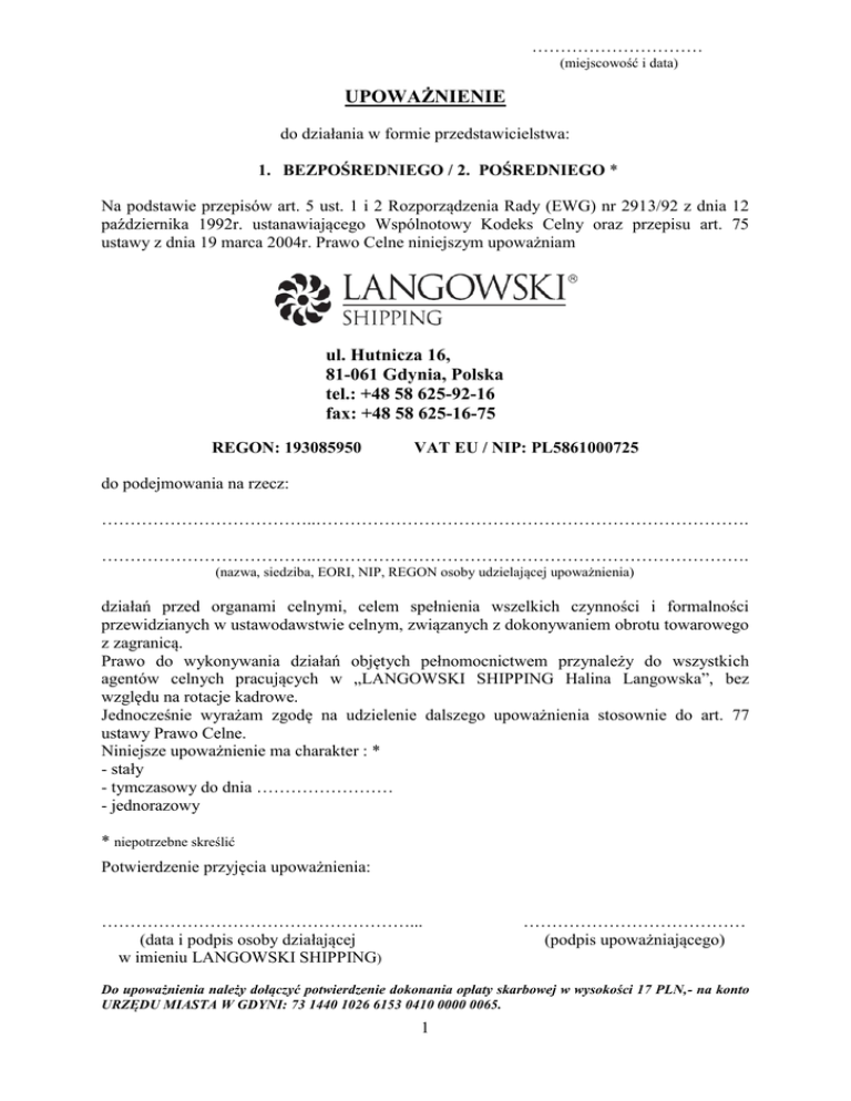 ………………………… (miejscowość i data) UPOWAŻNIENIE do działania w formie przedstawicielstwa: 1. BEZPOŚREDNIEGO / 2. POŚREDNIEGO * Na podstawie przepisów art. 5 ust. 1 i 2 Rozporządzenia Rady (EWG) nr 2913/92 z dnia 12 października 1992r. ustanawiającego Wspólnotowy Kodeks Celny oraz przepisu art. 75 ustawy z dnia 19 marca 2004r. Prawo Celne niniejszym upoważniam Halina ul. Hutnicza 16, 81-061 Gdynia, Polska tel.: +48 58 625-92-16 fax: +48 58 625-16-75 REGON: 193085950 VAT EU / NIP: PL5861000725 do podejmowania na rzecz: ………………………………..…………………………………………………………………. ………………………………..…………………………………………………………………. (nazwa, siedziba, EORI, NIP, REGON osoby udzielającej upoważnienia) działań przed organami celnymi, celem spełnienia wszelkich czynności i formalności przewidzianych w ustawodawstwie celnym, związanych z dokonywaniem obrotu towarowego z zagranicą. Prawo do wykonywania działań objętych pełnomocnictwem przynależy do wszystkich agentów celnych pracujących w „LANGOWSKI SHIPPING Halina Langowska”, bez względu na rotacje kadrowe. Jednocześnie wyrażam zgodę na udzielenie dalszego upoważnienia stosownie do art. 77 ustawy Prawo Celne. Niniejsze upoważnienie ma charakter : * - stały - tymczasowy do dnia …………………… - jednorazowy * niepotrzebne skreślić Potwierdzenie przyjęcia upoważnienia: ………………………………………………... (data i podpis osoby działającej w imieniu LANGOWSKI SHIPPING) ………………………………… (podpis upoważniającego) Do upoważnienia należy dołączyć potwierdzenie dokonania opłaty skarbowej w wysokości 17 PLN,- na konto URZĘDU MIASTA W GDYNI: 73 1440 1026 6153 0410 0000 0065. 1 1. Jeżeli zaistnieje konieczność wystąpienia w imieniu mocodawcy w sprawach dotyczących podatku od towarów i usług lub podatku akcyzowego, mocodawca udzieli wskazanemu przez LANGOWSKI SHIPPING agentowi celnemu odrębnego pełnomocnictwa do działania w imieniu mocodawcy, zgodnie z przepisem art. 137 § 1a ustawy ordynacja podatkowa w zw. z art. 79 ustawy prawo celne. 2. W przypadku ograniczenia upoważnienia wyłącznie do wybranych czynności wynikających bądź to z zakresu działania LANGOWSKI SHIPPING albo też z woli upoważnionego, należy określić czynności, których nie obejmuje niniejsze upoważnienie. 3. O cofnięciu niniejszego upoważnienia mocodawca zobowiązuje się niezwłocznie powiadomić pełnomocnika oraz właściwe organy administracji celnej. W przeciwnym przypadku LANGOWSKI SHIPPING będzie nadal skutecznie działać w imieniu mocodawcy. 4. Złożenie niniejszego upoważnienia oraz jego odpisu, wypisu lub kopii w organach celnych skutkuje obowiązkiem zapłaty opłaty skarbowej w kwocie wynikającej z obowiązujących przepisów. Każdorazowo Mocodawca zobowiązuje się uiścić należną opłatę skarbową. 5. Mocodawca niniejszego upoważnienia oświadcza ponadto, że bierze na siebie odpowiedzialność: a ) za rzetelność tłumaczenia faktury na język polski , b ) za faktyczną zgodność towaru z dokumentami co do ilości, wagi, rodzaju i wartości, c ) za dotrzymanie terminów ustanowionych w toku postępowania. 6. W przypadku udzielenia zabezpieczenia należności celno-podatkowych, zabezpieczone płatności powinny być dokonywane na konto LANGOWSKI SHIPPING na podstawie noty obciążeniowej doręczonej w dniu jej wystawienia. W przypadku niedotrzymania terminu płatności mocodawca zostanie obciążony ustawowymi odsetkami za zwłokę. 7. W przypadku upoważnienia do działania w formie przedstawicielstwa pośredniego, a w szczególności przy stosowaniu procedury uproszczonej zgodnie z normami Wspólnotowego Kodeksu Celnego: celem zabezpieczenia roszczeń LANGOWSKI SHIPPING o zapłatę mogących powstać z przyczyn nieleżących po stronie LANGOWSKI SHIPPING należności celno - podatkowych oświadczamy, że zobowiązujemy się należności te zapłacić na pierwsze wezwanie LANGOWSKI SHIPPING, a po otrzymaniu takiego wezwania złożymy oświadczenie, że zrzekamy się korzystania z zarzutu przedawnienia roszczeń LANGOWSKI SHIPPING, wynikających z umowy spedycji / przewozu. 8. Do upoważnienia należy dołączyć dokumenty założycielskie firmy: a) Wydruk odpisu z Krajowego Rejestru Sądowego lub wydruk zaświadczenia o wpisie do ewidencji działalności gospodarczej (CEiDG) b) Zaświadczenie o nadaniu numeru statystycznego REGON, c) Zaświadczenie o nadaniu numeru ewidencji podatkowej NIP, 9. Dokumenty wymienione w pkt. 8 lit. a i b powinny zawierać aktualne dane tzn. nie starsze jak sprzed trzech miesięcy, a w przypadku zaistnienia zmian winny być aktualizowane. Po wypełnieniu i podpisaniu upoważnienia prosimy przesłać je na nasz adres tj. LANGOWSKI SHIPPING, ul. Hutnicza 16, 81-061 Gdynia …………....................................................................... ( podpis i stanowisko osoby lub osób upoważnionych do reprezentowania firmy ) Dane Podmiotu dokonującego obrotu towarowego z państwami trzecimi: 1. Nazwa banku i numer konta ..................................................................................................................................................................................... ..................................................................................................................................................................................... ..................................................................................................................................................................................... 2. Numer telefonu / faxu / e- mail .....................................................................................................................................................................................