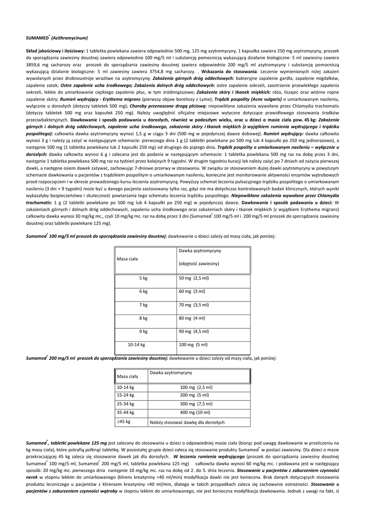 SUMAMED® (Azithromycinum) Skład jakościowy i ilościowy: 1 tabletka powlekana zawiera odpowiednio 500 mg, 125 mg azytromycyny, 1 kapsułka zawiera 250 mg azytromycyny, proszek do sporządzania zawiesiny doustnej zawiera odpowiednio 100 mg/5 ml i substancję pomocniczą wykazującą działanie biologiczne: 5 ml zawiesiny zawiera 3859,6 mg sacharozy oraz proszek do sporządzania zawiesiny doustnej zawiera odpowiednio 200 mg/5 ml azytromycyny i substancję pomocniczą wykazującą działanie biologiczne: 5 ml zawiesiny zawiera 3754,8 mg sacharozy. . Wskazania do stosowania: Leczenie wymienionych niżej zakażeń wywołanych przez drobnoustroje wrażliwe na azytromycynę. Zakażenia górnych dróg oddechowych: bakteryjne zapalenie gardła, zapalenie migdałków, zapalenie zatok; Ostre zapalenie ucha środkowego; Zakażenia dolnych dróg oddechowych: ostre zapalenie oskrzeli, zaostrzenie przewlekłego zapalenia oskrzeli, lekkie do umiarkowanie ciężkiego zapalenie płuc, w tym śródmiąższowe; Zakażenia skóry i tkanek miękkich: róża, liszajec oraz wtórne ropne zapalenie skóry; Rumień wędrujący - Erythema migrans (pierwszy objaw boreliozy z Lyme); Trądzik pospolity (Acne vulgaris) o umiarkowanym nasileniu, wyłącznie u dorosłych (dotyczy tabletek 500 mg); Choroby przenoszone drogą płciową: niepowikłane zakażenia wywołane przez Chlamydia trachomatis (dotyczy tabletek 500 mg oraz kapsułek 250 mg). Należy uwzględnić oficjalne miejscowe wytyczne dotyczące prawidłowego stosowania środków przeciwbakteryjnych. Dawkowanie i sposób podawania u dorosłych, również w podeszłym wieku, oraz u dzieci o masie ciała pow. 45 kg: Zakażenia górnych i dolnych dróg oddechowych, zapalenie ucha środkowego, zakażenia skóry i tkanek miękkich (z wyjątkiem rumienia wędrującego i trądziku pospolitego): całkowita dawka azytromycyny wynosi 1,5 g w ciągu 3 dni (500 mg w pojedynczej dawce dobowej). Rumień wędrujący: dawka całkowita wynosi 3 g i należy ją zażyć w następującym schemacie: pierwszego dnia 1 g (2 tabletki powlekane po 500 mg lub 4 kapsułki po 250 mg jednorazowo), a następnie 500 mg (1 tabletka powlekana lub 2 kapsułki 250 mg) od drugiego do piątego dnia. Trądzik pospolity o umiarkowanym nasileniu – wyłącznie u dorosłych: dawka całkowita wynosi 6 g i zalecana jest do podania w następującym schemacie: 1 tabletka powlekana 500 mg raz na dobę przez 3 dni, następnie 1 tabletka powlekana 500 mg raz na tydzień przez kolejnych 9 tygodni. W drugim tygodniu kuracji lek należy zażyć po 7 dniach od zażycia pierwszej dawki, a następne osiem dawek zażywać, zachowując 7-dniowe przerwy w stosowaniu. W związku ze stosowaniem dużej dawki azytromycyny w powyższym schemacie dawkowania u pacjentów z trądzikiem pospolitym o umiarkowanym nasileniu, konieczne jest monitorowanie aktywności enzymów wątrobowych przed rozpoczęciem i w okresie prowadzonego kursu leczenia azytromycyną. Powyższy schemat leczenia pulsacyjnego trądziku pospolitego o umiarkowanym nasileniu (3 dni + 9 tygodni) może być u danego pacjenta zastosowany tylko raz, gdyż nie ma dotychczas kontrolowanych badań klinicznych, których wyniki wykazałyby bezpieczeństwo i skuteczność powtarzania tego schematu leczenia trądziku pospolitego. Niepowikłane zakażenia wywołane przez Chlamydia trachomatis: 1 g (2 tabletki powlekane po 500 mg lub 4 kapsułki po 250 mg) w pojedynczej dawce. Dawkowanie i sposób podawania u dzieci: W zakażeniach górnych i dolnych dróg oddechowych, zapaleniu ucha środkowego oraz zakażeniach skóry i tkanek miękkich (z wyjątkiem Erythema migrans) całkowita dawka wynosi 30 mg/kg mc., czyli 10 mg/kg mc. raz na dobę przez 3 dni (Sumamed® 100 mg/5 ml i 200 mg/5 ml proszek do sporządzania zawiesiny doustnej oraz tabletki powlekane 125 mg). Sumamed® 100 mg/5 ml proszek do sporządzania zawiesiny doustnej: dawkowanie u dzieci zależy od masy ciała, jak poniżej: Dawka azytromycyny Masa ciała (objętość zawiesiny) 5 kg 50 mg (2,5 ml) 6 kg 60 mg (3 ml) 7 kg 70 mg (3,5 ml) 8 kg 80 mg (4 ml) 9 kg 90 mg (4,5 ml) 10-14 kg 100 mg (5 ml) Sumamed® 200 mg/5 ml proszek do sporządzania zawiesiny doustnej: dawkowanie u dzieci zależy od masy ciała, jak poniżej: Masa ciała 10-14 kg Dawka azytromycyny (objętość zawiesiny) 100 mg (2,5 ml) 15-24 kg 200 mg (5 ml) 25-34 kg 300 mg (7,5 ml) 35-44 kg 400 mg (10 ml) ≥45 kg Należy stosować dawkę dla dorosłych Sumamed®, tabletki powlekane 125 mg jest zalecany do stosowania u dzieci o odpowiedniej masie ciała (biorąc pod uwagę dawkowanie w przeliczeniu na kg masy ciała), które potrafią połknąć tabletkę. W pozostałej grupie dzieci zaleca się stosowanie produktu Sumamed® w postaci zawiesiny. Dla dzieci o masie przekraczającej 45 kg zaleca się stosowanie dawek jak dla dorosłych. W leczeniu rumienia wędrującego (proszek do sporządzania zawiesiny doustnej Sumamed® 100 mg/5 ml, Sumamed® 200 mg/5 ml, tabletka powlekana 125 mg) całkowita dawka wynosi 60 mg/kg mc. i podawana jest w następujący sposób: 20 mg/kg mc. pierwszego dnia następnie 10 mg/kg mc. raz na dobę od 2. do 5. dnia leczenia. Stosowanie u pacjentów z zaburzeniem czynności nerek w stopniu lekkim do umiarkowanego (klirens kreatyniny >40 ml/min) modyfikacja dawki nie jest konieczna. Brak danych dotyczących stosowania produktu leczniczego u pacjentów z klirensem kreatyniny <40 ml/min, dlatego w takich przypadkach zaleca się zachowanie ostrożności. Stosowanie u pacjentów z zaburzeniem czynności wątroby w stopniu lekkim do umiarkowanego, nie jest konieczna modyfikacja dawkowania. Jednak z uwagi na fakt, iż azytromycyna jest metabolizowana w wątrobie i wydalana z żółcią, produktu leczniczego nie należy stosować u pacjentów z ciężką niewydolnością wątroby. Nie przeprowadzono badań dotyczących stosowania azytromycyny u tych pacjentów. Sposób podawania: Azytromycynę należy podawać doustnie, raz na