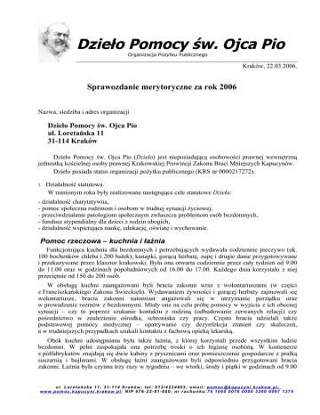 Dzieło Pomocy św. Ojca Pio Organizacja Pożytku Publicznego Kraków, 22.03.2006. Sprawozdanie merytoryczne za rok 2006 Nazwa, siedziba i adres organizacji Dzieło Pomocy św. Ojca Pio ul. Loretańska 11 31-114 Kraków Dzieło Pomocy św. Ojca Pio (Dzieło) jest nieposiadającą osobowości prawnej wewnętrzną jednostką kościelnej osoby prawnej Krakowskiej Prowincji Zakonu Braci Mniejszych Kapucynów. Dzieło posiada status organizacji pożytku publicznego (KRS nr 0000217272). 1. Działalność statutowa. W minionym roku były realizowane następujące cele statutowe Dzieła: - działalność charytatywna, - pomoc społeczna rodzinom i osobom w trudnej sytuacji życiowej, - przeciwdziałanie patologiom społecznym zwłaszcza problemom osób bezdomnych, - fundusz stypendialny dla dzieci z rodzin ubogich, - działalność wspierająca naukę, edukację, oświatę i wychowanie. Pomoc rzeczowa – kuchnia i łaźnia Funkcjonująca kuchnia dla bezdomnych i potrzebujących wydawała codziennie pieczywo (ok. 100 bochenków chleba i 200 bułek), kanapki, gorącą herbatę, zupę i drugie danie przygotowywane i przekazywane przez klasztor krakowski. Była ona otwarta codziennie przez cały tydzień od 9.00 do 11.00 oraz w godzinach popołudniowych od 16.00 do 17.00. Każdego dnia korzystało z niej przeciętnie od 150 do 200 osób. W obsługę kuchni zaangażowani byli bracia zakonni wraz z wolontariuszami (w części z Franciszkańskiego Zakonu Świeckich). Wydawaniem żywności i gorącej herbaty zajmowali się wolontariusze, bracia zakonni natomiast angażowali się w utrzymanie porządku oraz w prowadzenie rozmów z bezdomnymi. Miały one na celu próbę pomocy w wyjściu z ich obecnej sytuacji – czy to poprzez szukanie kontaktu z rodziną (odbudowanie zerwanych relacji) czy pośrednictwo w znalezieniu ośrodka, schroniska czy pracy. Często bracia udzielali także podstawowej pomocy medycznej – opatrywanie czy dezynfekcja zranień czy skaleczeń, a w trudniejszych przypadkach szukali kontaktu z fachową opieką lekarską. Obok kuchni udostępniana była także łaźnia, z której korzystali przede wszystkim ludzie bezdomni. W pełni zaspokajała ona potrzebę troski o ich higienę osobistą. W kontenerze z półfabrykatów znajdują się dwie kabiny z prysznicami oraz pomieszczenie gospodarcze z pralką suszarnią i bojlerami. W obsługę łaźni zaangażowani byli odpowiednio przygotowani bracia zakonni. Łaźnia była czynna trzy razy w tygodniu – we wtorki, środy i piątki w godzinach od 9.00 ul. Loretańska 11; 31-114 Kraków; tel: 012/4224803; email: [email protected]; www.pomoc.kapucyni.krakow.pl; NIP 676-22-81-650; nr rachunku:76 1060 0076 0000 3200 0097 1374 do 11.00 (kobiety we wtorki, w pozostałe dni mężczyźni). Jednorazowo korzystało z niej 10-15 osób. W Niedzielę Wielkanocną, w Wigilię Bożego Narodzenia, a także w sam dzień Bożego Narodzenia zostały zorganizowane obiady świąteczne dla ubogich i bezdomnych, w którym uczestniczyło od 150 (Boże Narodzenie) do ok. 350 osób (Wielkanoc). Oprócz ciepłego posiłku wszyscy otrzymali paczki żywnościowe. Wartość świadczonej pomocy – 75.658,22 zł Koszty utrzymania kuchni i łaźni, dowóz żywności – 8.958,36 zł Bank Żywności - PEAD We współpracy z Bankiem Żywności w Krakowie kontynuowana była dystrybucja produktów żywnościowych w ramach programu PEAD (mleko, mąka, ryż, makaron, cukier, kasza, sery). Łączna ilość wydanych produktów to 7.426,2 kg. W tym projekcie uczestniczyło łącznie 233 osoby (tj. 104 rodziny) z terenu Krakowa. Wartość pomocy rzeczowej - 14.443,46 zł. Dofinansowanie posiłków W porozumieniu z Dyrekcją Państwowej Ogólnokształcącej Szkoły Muzycznej II st. im. F. Chopina w Krakowie rozpoczęliśmy w roku szkolnym 2006/2007 finansowanie obiadów dla wytypowanych przez szkołę 10 uczniów z rodzin o trudnej sytuacji materialnej. Koszt jednego obiadu – 5,50 zł. Wartość przekazanej pomocy do grudnia 2006 – 726 zł. Pomoc rzeczowa – dopłaty do leków i mediów Inną formą pomocy były również przyjmowanie potrzebujących, którzy przychodzą na furtę klasztorną prosząc o różnego rodzaju pomoc: dopłaty do leków, do mediów, pomoc w szczególnych, trudnych sytuacjach życiowych – w każdym przypadku decyzja o udzieleniu bądź odmowie pomocy była poprzedzona wywiadem środowiskowym, rozmową i próbą weryfikacji informacji w oparciu o dostarczone nam dokumenty, zaświadczenia od innych instytucji. W większości były to osoby starsze, samotne czy też rodziny będące w trudnej sytuacji materialnej. Opłaty za realizację recept i opłaty za media dokonywane były zawsze bezpośrednio przez wolontariuszy Dzieła. Wartość pomocy finansowej (opłaty za leki) – 11.200,72 zł Wartość pomocy finansowej (opłaty za media) – 9.049,80 zł Fundusz stypendialny Kontynuowano działalność powstałego w 2005 roku funduszu stypendialnego przeznaczonego dla zdolnych dzieci z rodzin ubogich i wielodzietnych. Program ten składał się z trzech pakietów: – pakiet socjalny - pokrywający koszty utrzymania, wyżywienia, dojazdów do szkoły, wycieczek szkolnych, składek obowiązkowych, inne potrzeby socjalne i zdrowotne – 100-150 zł miesięcznie, – pakiet naukowy – pokrywający wydatki wynikające z projektu rozwoju talentów dziecka – pomoce naukowe, dodatkowe lekcje, kursy językowe, inne szkolenia, treningi – 200-300 zł miesięcznie, – pakiet rzeczowy – jednorazowa dotacja celowa przeznaczona na zakup np.: pomocy naukowych, instrumentu muzycznego – wynikająca z projektu rozwoju dziecka – 600-3.000 zł jednorazowo. - 2 - W 2005 roku uruchomiona została pierwsza transza funduszu. Do drugiej transzy stypendium w roku 2006 zakwalifikowali się jedynie ci stypendyści, którzy rozliczyli się z całości otrzymanych środków i przedstawili program rozwoju talentów na drugie półrocze. W ramach realizacji tego fundusz