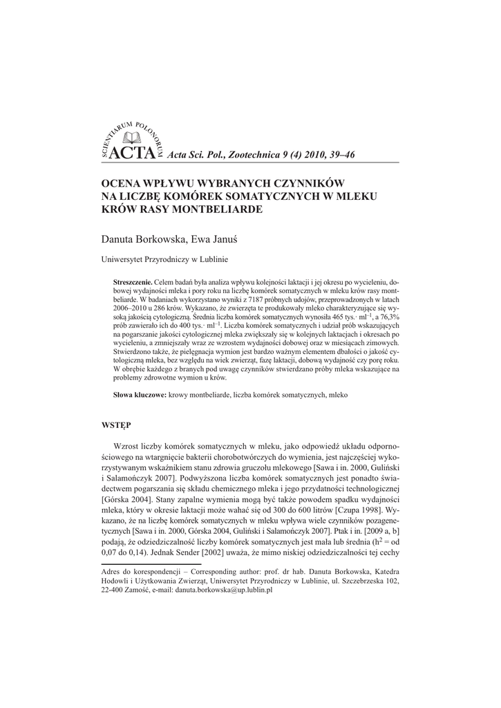 Acta Sci. Pol., Zootechnica 9 (4) 2010, 39–46 OCENA WPŁYWU WYBRANYCH CZYNNIKÓW NA LICZBĘ KOMÓREK SOMATYCZNYCH W MLEKU KRÓW RASY MONTBELIARDE Danuta Borkowska, Ewa Januś Uniwersytet Przyrodniczy w Lublinie Streszczenie. Celem badań była analiza wpływu kolejności laktacji i jej okresu po wycieleniu, dobowej wydajności mleka i pory roku na liczbę komórek somatycznych w mleku krów rasy montbeliarde. W badaniach wykorzystano wyniki z 7187 próbnych udojów, przeprowadzonych w latach 2006–2010 u 286 krów. Wykazano, że zwierzęta te produkowały mleko charakteryzujące się wysoką jakością cytologiczną. Średnia liczba komórek somatycznych wynosiła 465 tys.· ml–1, a 76,3% prób zawierało ich do 400 tys.· ml–1. Liczba komórek somatycznych i udział prób wskazujących na pogarszanie jakości cytologicznej mleka zwiększały się w kolejnych laktacjach i okresach po wycieleniu, a zmniejszały wraz ze wzrostem wydajności dobowej oraz w miesiącach zimowych. Stwierdzono także, że pielęgnacja wymion jest bardzo ważnym elementem dbałości o jakość cytologiczną mleka, bez względu na wiek zwierząt, fazę laktacji, dobową wydajność czy porę roku. W obrębie każdego z branych pod uwagę czynników stwierdzano próby mleka wskazujące na problemy zdrowotne wymion u krów. Słowa kluczowe: krowy montbeliarde, liczba komórek somatycznych, mleko WSTĘP Wzrost liczby komórek somatycznych w mleku, jako odpowiedź układu odpornościowego na wtargnięcie bakterii chorobotwórczych do wymienia, jest najczęściej wykorzystywanym wskaźnikiem stanu zdrowia gruczołu mlekowego [Sawa i in. 2000, Guliński i Salamończyk 2007]. Podwyższona liczba komórek somatycznych jest ponadto świadectwem pogarszania się składu chemicznego mleka i jego przydatności technologicznej [Górska 2004]. Stany zapalne wymienia mogą być także powodem spadku wydajności mleka, który w okresie laktacji może wahać się od 300 do 600 litrów [Czupa 1998]. Wykazano, że na liczbę komórek somatycznych w mleku wpływa wiele czynników pozagenetycznych [Sawa i in. 2000, Górska 2004, Guliński i Salamończyk 2007]. Ptak i in. [2009 a, b] podają, że odziedziczalność liczby komórek somatycznych jest mała lub średnia (h2 = od 0,07 do 0,14). Jednak Sender [2002] uważa, że mimo niskiej odziedziczalności tej cechy Adres do korespondencji – Corresponding author: prof. dr hab. Danuta Borkowska, Katedra Hodowli i Użytkowania Zwierząt, Uniwersytet Przyrodniczy w Lublinie, ul. Szczebrzeska 102, 22-400 Zamość, e-mail: [email protected] 40 D. Borkowska i E. Januś możliwe jest jej doskonalenie poprzez uwzględnienie liczby komórek somatycznych w indeksie selekcyjnym. Liczba komórek somatycznych w mleku była w Polsce przedmiotem wielu badań [Sawa i in. 2000, Górska 2004, Guliński i Salamończyk 2007, Ptak i in. 2009 a, b], dotyczyły one jednak głównie rasy polskiej holsztyńsko-fryzyjskiej. Od kilkunastu lat jedną z ras utrzymywanych w Polsce i objętych oceną użytkowości mlecznej jest francuskie bydło montbeliarde. W 2008 roku w Polsce oceną wartości użytkowej były objęte 952 krowy montbeliarde, a średnia ich wydajność wynosząca 7092 kg mleka ustępowała tylko produkcyjności krów rasy phf odmiany cb. W 2009 roku liczba krów tej rasy w populacji aktywnej liczyła już 1312, a wydajność mleka 7125 kg [PFHBiPM 2009, 2010]. Na podstawie przeprowadzonych w latach 1998–2001 obserwacji Trela [2003] stwierdził, że bydło montbeliarde importowane z Francji do Polski dobrze przystosowuje się do nowych warunków środowiskowych. Uważa ponadto, że zwierząt tych nie należy traktować jako konkurencyjnych w stosunku do użytkowanych w kraju. Rasę tę można wykorzystywać w produkcji mleka, szczególnie cenionego w przetwórstwie serowarskim. Gołębiewski i Brzozowski [2007] podają, że krowy rasy montbeliarde charakteryzuje duża odporność na mastitis, ponieważ w porównaniu z rasą hf cechowała je niższa (od 23 do 38%) liczba komórek somatycznych. W związku ze zwiększaniem się w naszym kraju pogłowia krów montbeliarde uznano za celowe podjęcie badań nad różnymi aspektami ich użytkowości. Celem pracy była analiza wpływu wybranych czynników pozagenetycznych na liczbę komórek somatycznych w mleku krów rasy montbeliarde. MATERIAŁ I METODY W badaniach wykorzystano wyniki z 7187 próbnych udojów, przeprowadzonych w latach 2006–2010 u 286 krów rasy montbeliarde. Zwierzęta te utrzymywano w jednym z gospodarstw Lubelszczyzny, do którego w 2005 roku sprowadzono z Francji jałowice cielne. Stado w kolejnych latach powiększane było głównie w oparciu na własnym materiale. Pogłowie krów w 2008 roku wynosiło 185 osobników, a przeciętna wydajność 8813 kg mleka. W następnym roku zwiększyła się zarówno liczba krów (do 213), jak i ich wydajność (do 9445 kg mleka). Krowy były utrzymywane w oborze ściołowej, wolnostanowiskowej, żywiono je w systemie TMR, a mleko pozyskiwano dwukrotnie w ciągu doby w hali udojowej „bok w bok”. Liczbę komórek somatycznych (LKS) wyrażoną w tys. · ml–1 mleka przetransformowano w programie Excel® na logarytm naturalny (LnLKS), co pozwoliło na spełnienie warunków rozkładu normalnego tej cechy. Obliczenia statystyczne wykonano w programie SAS®, a istotność różnic pomiędzy średnimi oceniono testem Duncana. Zastosowano następujący model matematyczny: Y = µ + ai + bj + ck + dl + (ab)ij + (bd)jl + eijkl gdzie: µ – średnia populacji; ai – wpływ i-tej laktacji (I, II, III oraz IV–V); Acta Sci. Pol. Ocena wpływu wybranych czynników na liczbę komórek somatycznych w mleku krów... 41 bj – wpływ j-tej wydajności dobowej (do 15,0 kg; 15,1–25,0; 25,1–35,0; > 35,0); ck – wpływ k-tego sezonu pozyskiwania mleka (letni obejmował miesiące V–X; zimowy – IX–IV); dl – wpływ i-tego okresu laktacji (1.–3. m-c po wycieleniu; 4.–7.; 8.–10.; 11.–