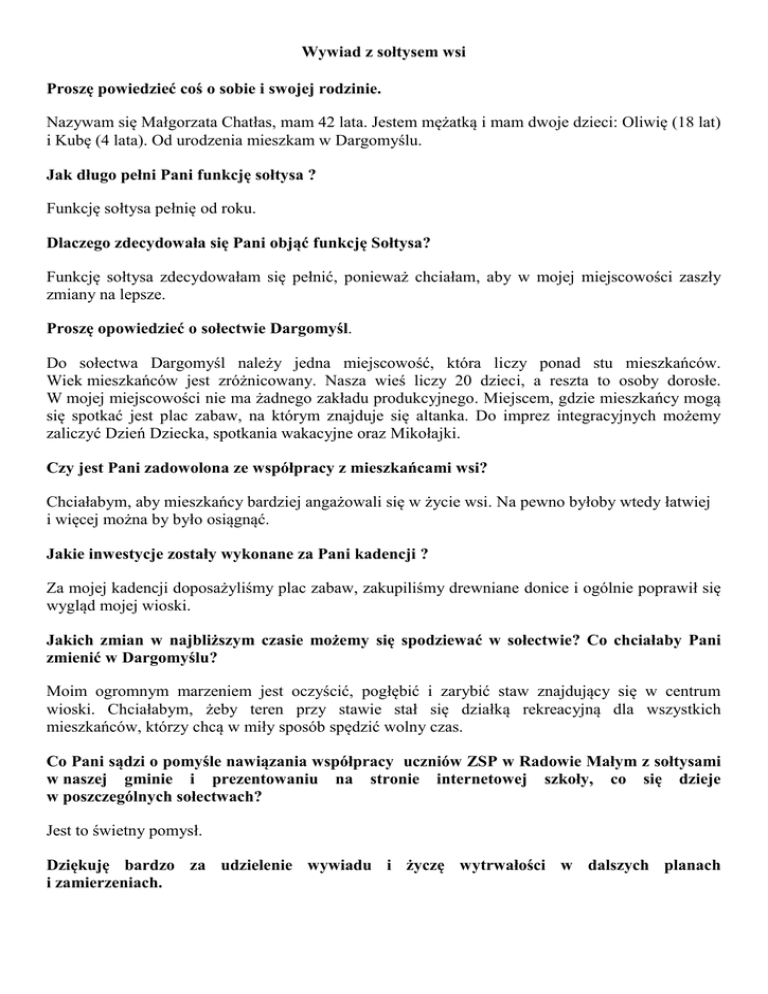 Wywiad z sołtysem wsi Proszę powiedzieć coś o sobie i swojej rodzinie. Nazywam się Małgorzata Chatłas, mam 42 lata. Jestem mężatką i mam dwoje dzieci: Oliwię (18 lat) i Kubę (4 lata). Od urodzenia mieszkam w Dargomyślu. Jak długo pełni Pani funkcję sołtysa ? Funkcję sołtysa pełnię od roku. Dlaczego zdecydowała się Pani objąć funkcję Sołtysa? Funkcję sołtysa zdecydowałam się pełnić, ponieważ chciałam, aby w mojej miejscowości zaszły zmiany na lepsze. Proszę opowiedzieć o sołectwie Dargomyśl. Do sołectwa Dargomyśl należy jedna miejscowość, która liczy ponad stu mieszkańców. Wiek mieszkańców jest zróżnicowany. Nasza wieś liczy 20 dzieci, a reszta to osoby dorosłe. W mojej miejscowości nie ma żadnego zakładu produkcyjnego. Miejscem, gdzie mieszkańcy mogą się spotkać jest plac zabaw, na którym znajduje się altanka. Do imprez integracyjnych możemy zaliczyć Dzień Dziecka, spotkania wakacyjne oraz Mikołajki. Czy jest Pani zadowolona ze współpracy z mieszkańcami wsi? Chciałabym, aby mieszkańcy bardziej angażowali się w życie wsi. Na pewno byłoby wtedy łatwiej i więcej można by było osiągnąć. Jakie inwestycje zostały wykonane za Pani kadencji ? Za mojej kadencji doposażyliśmy plac zabaw, zakupiliśmy drewniane donice i ogólnie poprawił się wygląd mojej wioski. Jakich zmian w najbliższym czasie możemy się spodziewać w sołectwie? Co chciałaby Pani zmienić w Dargomyślu? Moim ogromnym marzeniem jest oczyścić, pogłębić i zarybić staw znajdujący się w centrum wioski. Chciałabym, żeby teren przy stawie stał się działką rekreacyjną dla wszystkich mieszkańców, którzy chcą w miły sposób spędzić wolny czas. Co Pani sądzi o pomyśle nawiązania współpracy uczniów ZSP w Radowie Małym z sołtysami w naszej gminie i prezentowaniu na stronie internetowej szkoły, co się dzieje w poszczególnych sołectwach? Jest to świetny pomysł. Dziękuję bardzo za udzielenie wywiadu i życzę wytrwałości w dalszych planach i zamierzeniach.
