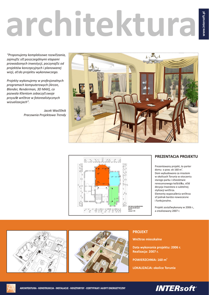 “Proponujemy kompleksowe rozwiązania, zajmując się poszczególnymi etapami prowadzonych inwestycji, poczynając od projektów koncepcyjnych i planowanej wizji, aż do projektu wykonawczego. Projekty wykonujemy w profesjonalnych programach komputerowych (Arcon, Blender, Renderman, 3D MAX), co pozwala Klientom zobaczyć swoje przyszłe wnętrze w fotorealistycznych wizualizacjach”. Jacek Wasążnik Pracownia Projektowa Trendy PREZENTACJA PROJEKTU Prezentowany projekt, to parter domu o pow. ok 160 m2. Dom wybudowano za miastem w okolicach Torunia w otoczeniu starego parku i sąsiedztwie renesansowego kościółka, stąd decyzja Inwestora o subtelnej stylizacji wnętrza. Elementy wyposażenia wnętrza są jednak bardzo nowoczesne i funkcjonalne. Projekt został wykonany w 2006 r., a zrealizowany 2007 r. PROJEKT Wnętrze mieszkalne Data wykonania projektu: 2006 r. Realizacja: 2007 r. POWIERZCHNIA: 160 m2 LOKALIZACJA: okolice Torunia ARCHITEKTURA - KONSTRUKCJA - INSTALACJE - KOSZTORYSY - CERTYFIKAT I AUDYT ENERGETYCZNY www.intersoft.pl architektura www.intersoft.pl NARZĘDZIA PROJEKTOWE ARCON-WIZUALNA ARCHITEKTURA, WERSJA 9, 3D STUDIO MAX FIRMA Pracownia projektowa Trendy - projektowanie wnętrz, J.A.Wasążnik, mieści się w Mokrem k. Grudziądza. Od 2001 roku projektuje, modernizuje oraz wyposaża mieszkania, domy, sklepy i biura. Od 2005 roku projekty wykonuje w programie Arcon, obecnie w wersji Arcon 9 +. Część wizualizacji po wykonaniu w programie ArCon dodatkowo jest obrabiana w innych profesjonalnych programach komputerowych jak Blender, Renderman, 3Dmax. Propozycje firmy uwzględniają różnorodne gusty oraz możliwości finansowe klientów. Dodatkową ofertą TRENDY jest też wyposażanie wnętrza w meble, elementy dekoracyjne oraz oświetleniowe. Firma działa na terenie całej Polski i Europy. [email protected], www.trendypro.pl INTERsoft, 90-057 Łódź, Sienkiewicza 85/87, Tel. +48 42 689 11 11