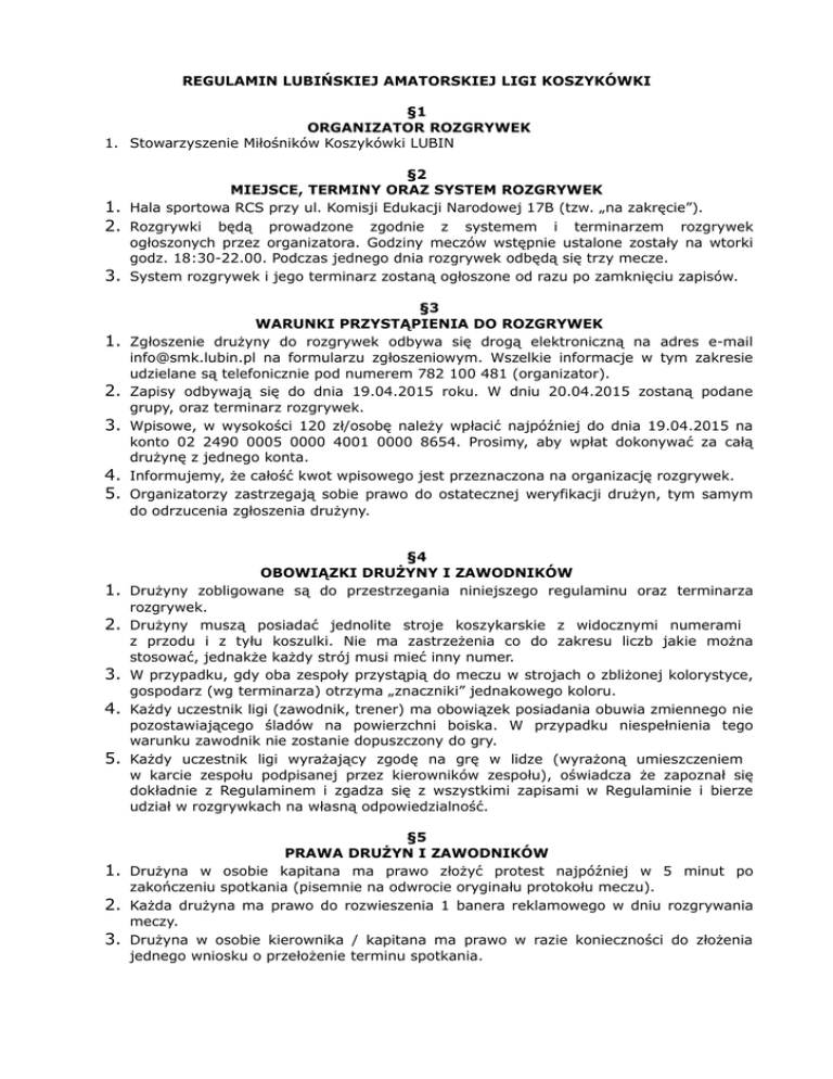 REGULAMIN LUBIŃSKIEJ AMATORSKIEJ LIGI KOSZYKÓWKI §1 ORGANIZATOR ROZGRYWEK 1. Stowarzyszenie Miłośników Koszykówki LUBIN 1. 2. 3. 1. 2. 3. 4. 5. 1. 2. 3. 4. 5. 1. 2. 3. §2 MIEJSCE, TERMINY ORAZ SYSTEM ROZGRYWEK Hala sportowa RCS przy ul. Komisji Edukacji Narodowej 17B (tzw. „na zakręcie”). Rozgrywki będą prowadzone zgodnie z systemem i terminarzem rozgrywek ogłoszonych przez organizatora. Godziny meczów wstępnie ustalone zostały na wtorki godz. 18:30-22.00. Podczas jednego dnia rozgrywek odbędą się trzy mecze. System rozgrywek i jego terminarz zostaną ogłoszone od razu po zamknięciu zapisów. §3 WARUNKI PRZYSTĄPIENIA DO ROZGRYWEK Zgłoszenie drużyny do rozgrywek odbywa się drogą elektroniczną na adres e-mail [email protected] na formularzu zgłoszeniowym. Wszelkie informacje w tym zakresie udzielane są telefonicznie pod numerem 782 100 481 (organizator). Zapisy odbywają się do dnia 19.04.2015 roku. W dniu 20.04.2015 zostaną podane grupy, oraz terminarz rozgrywek. Wpisowe, w wysokości 120 zł/osobę należy wpłacić najpóźniej do dnia 19.04.2015 na konto 02 2490 0005 0000 4001 0000 8654. Prosimy, aby wpłat dokonywać za całą drużynę z jednego konta. Informujemy, że całość kwot wpisowego jest przeznaczona na organizację rozgrywek. Organizatorzy zastrzegają sobie prawo do ostatecznej weryfikacji drużyn, tym samym do odrzucenia zgłoszenia drużyny. §4 OBOWIĄZKI DRUŻYNY I ZAWODNIKÓW Drużyny zobligowane są do przestrzegania niniejszego regulaminu oraz terminarza rozgrywek. Drużyny muszą posiadać jednolite stroje koszykarskie z widocznymi numerami z przodu i z tyłu koszulki. Nie ma zastrzeżenia co do zakresu liczb jakie można stosować, jednakże każdy strój musi mieć inny numer. W przypadku, gdy oba zespoły przystąpią do meczu w strojach o zbliżonej kolorystyce, gospodarz (wg terminarza) otrzyma „znaczniki” jednakowego koloru. Każdy uczestnik ligi (zawodnik, trener) ma obowiązek posiadania obuwia zmiennego nie pozostawiającego śladów na powierzchni boiska. W przypadku niespełnienia tego warunku zawodnik nie zostanie dopuszczony do gry. Każdy uczestnik ligi wyrażający zgodę na grę w lidze (wyrażoną umieszczeniem w karcie zespołu podpisanej przez kierowników zespołu), oświadcza że zapoznał się dokładnie z Regulaminem i zgadza się z wszystkimi zapisami w Regulaminie i bierze udział w rozgrywkach na własną odpowiedzialność. §5 PRAWA DRUŻYN I ZAWODNIKÓW Drużyna w osobie kapitana ma prawo złożyć protest najpóźniej w 5 minut po zakończeniu spotkania (pisemnie na odwrocie oryginału protokołu meczu). Każda drużyna ma prawo do rozwieszenia 1 banera reklamowego w dniu rozgrywania meczy. Drużyna w osobie kierownika / kapitana ma prawo w razie konieczności do złożenia jednego wniosku o przełożenie terminu spotkania. 1. 2. 3. 4. 5. 6. 7. 8. 1. 2. a) b) 3. 4. 5. a) b) c) d) e) f) 6. a) §6 DRUŻYNY Drużyna musi składać się z minimum 9 zawodników wpisanych do karty zespołu.. Członkami drużyny (zawodnikami) mogą być wyłącznie amatorzy nie zgłoszeni do rozgrywek prowadzonych przez PZKosz (II liga i wyższe). Status amatora uzyskują osoby, u których okres od ostatniego oficjalnego meczu zespołu, w którym była zgłoszona do w/w rozgrywek jest dłuższy niż pół roku kalendarzowego. Nie ma ograniczeń wiekowych zawodników. Zawodnicy, którzy nie ukończyli 18-ego roku życia muszą dostarczyć organizatorom pisemną zgodę rodziców. Jeden zawodnik może reprezentować tylko 1 drużynę jednocześnie. Do dnia zamknięcia zgłoszeń istnieje możliwość zmian w zgłaszanym składzie drużyny bez żadnych ograniczeń. Po zamknięciu zgłoszeń drużyny posiadają prawo uzupełniania składu zespołu w przypadku posiadania wakatów w liście zawodników. Prawo to dotyczy tylko rundy zasadniczej. Transfery między drużynami są możliwe tylko i wyłączenie między sezonami. §7 WERYFIKACJA I PROTESTY Weryfikację zawodów oraz rozpatrywanie protestów przeprowadza organizator na podstawie protokołu spotkań, a także opinii swoich przedstawicieli będących na meczu, sędziów spotkania i zainteresowanych stron. W przypadku, gdy drużyna wycofa się w trakcie rozgrywek weryfikacja meczy będzie następująca: jeżeli drużyna nie odbyła do chwili wycofania więcej niż połowy zaplanowanych spotkań, wyniki wszystkich spotkań zostają anulowane, a tabelę klasyfikacji rozgrywek sporządza się bez tej drużyny, jeżeli drużyna odbyła do chwili wycofania więcej niż połowę zaplanowanych spotkań, wyniki odbytych spotkań zostają utrzymane, natomiast kolejne spotkania zostaną zweryfikowane jako walkowery 20:0 na korzyść przeciwników z punktacją w tabeli klasyfikacji rozgrywek 0 dla zespołu, który się wycofał, natomiast 2 punkty dla przeciwników tego zespołu. W przypadku, gdy drużyna zostanie wykluczona w trakcie rozgrywek wszystkie mecze tej drużyny zostają anulowane, a tabelę klasyfikacji rozgrywek sporządza się bez tej drużyny. Kolejność w tabeli będzie ustalana na podstawie: a) punktów b) wyników bezpośrednich spotkań c) różnicy rzuconych koszy d) koszy zdobytych między drużynami z małej tabeli e) koszy zdobytych ogółem Zawody zostaną zweryfikowane jako walkower gdy: drużyna z własnej winy i bez wcześniejszego poinformowania nie stawi się na mecz drużyna stawi się do rozpoczęcia spotkania z mniejszą liczbą zawodników niż 5, drużyna odmawia gry pomimo poinstruowania przez sędziego głównego, aby grę podjęła, drużyna zejdzie z boiska i odmówi dalszej gry, drużyna nie posiada jednolitych strojów koszykarskich i odmawia wypożyczenia „znaczników”, w drużynie wystąpi zawodnik nieuprawniony. W momencie gdy na parkiecie pozostanie mniejsza ilość zawodników niż 2 jednej drużyny mecz zostaje PRZERWANY (nie jest traktowany jak walkower) z następującymi konsekwencjami: jeśli w momencie przerwania meczu prowad