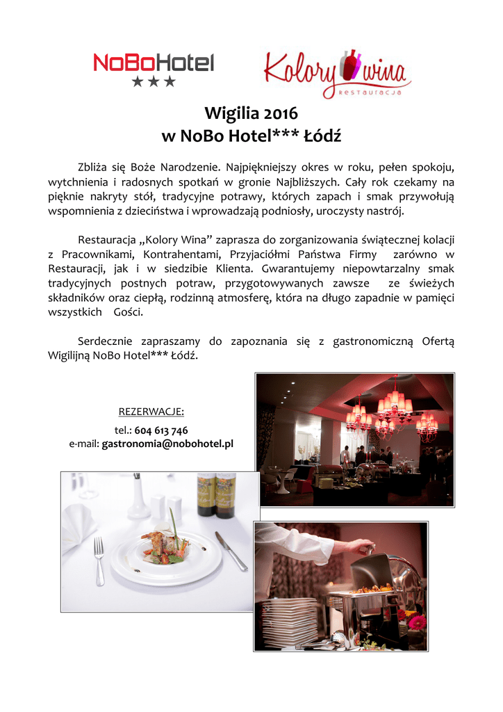 Wigilia 2016 w NoBo Hotel*** Łódź Zbliża się Boże Narodzenie. Najpiękniejszy okres w roku, pełen spokoju, wytchnienia i radosnych spotkań w gronie Najbliższych. Cały rok czekamy na pięknie nakryty stół, tradycyjne potrawy, których zapach i smak przywołują wspomnienia z dzieciństwa i wprowadzają podniosły, uroczysty nastrój. Restauracja „Kolory Wina” zaprasza do zorganizowania świątecznej kolacji z Pracownikami, Kontrahentami, Przyjaciółmi Państwa Firmy zarówno w Restauracji, jak i w siedzibie Klienta. Gwarantujemy niepowtarzalny smak tradycyjnych postnych potraw, przygotowywanych zawsze ze świeżych składników oraz ciepłą, rodzinną atmosferę, która na długo zapadnie w pamięci wszystkich Gości. Serdecznie zapraszamy do zapoznania się z gastronomiczną Ofertą Wigilijną NoBo Hotel*** Łódź. REZERWACJE: tel.: 604 613 746 e-mail: [email protected] MENU WIGILIJNE I UROCZYSTA KOLACJA SERWOWANA cena zestawu z aperitifem i przystawką: 99 PLN /os. cena zestawu bez aperitifu, bez przystawki: 79 PLN /os. Apéritif Świąteczne grzane wino z pomarańczową nutą doprawione przyprawami korzennymi, 100 ml Przystawka Tradycyjny, domowy pasztet z grzybów podany z gorącym pieczywem, 40 g Zupa Wigilijna zupa grzybowa z łazankami, muśnięta słodką śmietaną, 220 g Trzyelementowe danie główne Karp smażony ‘sauté’ wzbogacony pieczarką, 100 g Pierogi z kapustą i grzybami, 4 szt. Kapusta z grochem okraszona cebulką, 60 g Deser Sernik gotowany w niskiej temperaturze z frużeliną wiśniową, 120 g Napoje zawarte w cenie menu Wigilijny kompot z suszonych owoców, 100 ml Woda gazowana i niegazowana, soki owocowe (jabłkowy, pomarańczowy), bez ograniczeń Świeżo parzona kawa Piacetto, selekcja herbat Sir Henry, bez ograniczeń *** OPCJE DODATKOWE Zakąski zimne cena zestawu: 55 PLN / os. Ryba po grecku, 60 g Tuszka śledzia w trzech odsłonach; po kaszubsku, w oliwie i w śmietanie, 60 g Karp w galarecie z migdałami i rodzynkami, 60 g Tatar z wędzonego łososia z kaparami, 50 g Pstrąg po florentyńsku, 50 g Wigilijne makiełki, 50 g Oferta specjalna sprzedaży win: Wino białe, wytrawne Chardonnay-Semillon (Brookford, Australia) Wino czerwone, wytrawne Shiraz-Cabernet Sauvignon (Brookford, Australia) 0,75 l w cenie 65 PLN MENU WIGILIJNE II UROCZYSTA KOLACJA BUFETOWA dla grup powyżej 40 osób cena zestawu: 149 PLN / os. Apéritif Świąteczne grzane wino z pomarańczową nutą doprawione przyprawami korzennymi, 100 ml Bufet gorący Aksamitny grzybowy krem, 110 g Barszcz czerwony z grzybowymi pasztecikami, 110 g Pierogi z kapustą i podgrzybkami w asyście śmietanowych grzybów, 80 g / 50 g Kapusta z grochem wraz z kapustą i podgrzybkiem oraz cebulą, 60 g / 50 g Karp smażony ‘sauté’ z pieczarkami, 100 g Bufet zimny Karp w galarecie z migdałami i rodzynkami, 60 g Śledź w trzech odsłonach; słodkiej, kwaśnej i ostrej, 60 g Pstrąg ze szpinakiem i musem chrzanowym, 40 g Teryna z łososia i sandacza gotowana w niskiej temperaturze, 40 g Tatar z wędzonego łososia z czerwoną cebulą i marynowanym kaparem, 50 g Wigilijny pasztet z mieszanych grzybów z wytrawną konfiturą, 40 g Ryba ‘sauté’ pod płaszczem warzyw i pomidorów, 80 g Sałatka śledziowa podana na pieczonych ziemniakach, 50 g Stół deserowy Ciasto cynamonowe Piernik tradycyjny Sernik z rodzynkami i brzoskwinią Strucla makowa Szarlotka cynamonowa Wigilijne makiełki łącznie 150 g Stacja napojów zimnych i gorących Wigilijny kompot z suszonych owoców, 100 ml Woda gazowana i niegazowana, soki owocowe (jabłkowy, pomarańczowy), bez ograniczeń Świeżo parzona kawa Piacetto, selekcja herbat Sir Henry, bez ograniczeń *** Oferta specjalna sprzedaży win: Wino białe, wytrawne Chardonnay-Semillon (Brookford, Australia) Wino czerwone, wytrawne Shiraz-Cabernet Sauvignon (Brookford, Australia) 0,75 l w cenie 65 PLN MENU WIGILIJNE III UROCZYSTA KOLACJA SERWOWANA MENU DEGUSTACYJNE dla grup do 20 osób cena zestawu: 149 PLN / os. Menu Apéritif Świąteczne grzane wino z pomarańczową nutą doprawione przyprawami korzennymi, 100 ml Przystawka zimna Śledź z buraczkami pieczonymi w śmietanie, 60 g Przystawka ciepła Wigilijne grzyby zakrapiane słodką śmietaną, podane z ciepłym pieczywem, 80 g Zupa ‘Velouté’ grzybowe z pianką z kwaśnej śmietany, 150 g Pierwsze danie gorące Domowe pierogi z kapustą i grzybami w dwóch odsłonach; gotowane i pieczone, okraszone cebulką, 100 g Intermezzo Sorbet limonkowy, 60 g Drugie danie gorące Karp smażony w pieczarkach, ozłocony cytryną podany z czerwonym barszczem, 100 g / 150 ml Deser Degustacja świątecznych ciast, 100 g *** Napoje zawarte w cenie menu Wigilijny kompot z suszonych owoców, 100 ml Woda gazowana i niegazowana, soki owocowe (jabłkowy, pomarańczowy), bez ograniczeń Świeżo parzona kawa Piacetto, selekcja herbat Sir Henry, bez ograniczeń *** Oferta specjalna sprzedaży win: Wino białe, wytrawne Chardonnay-Semillon (Brookford, Australia) Wino czerwone, wytrawne Shiraz-Cabernet Sauvignon (Brookford, Australia) 0,75 l w cenie 65 PLN