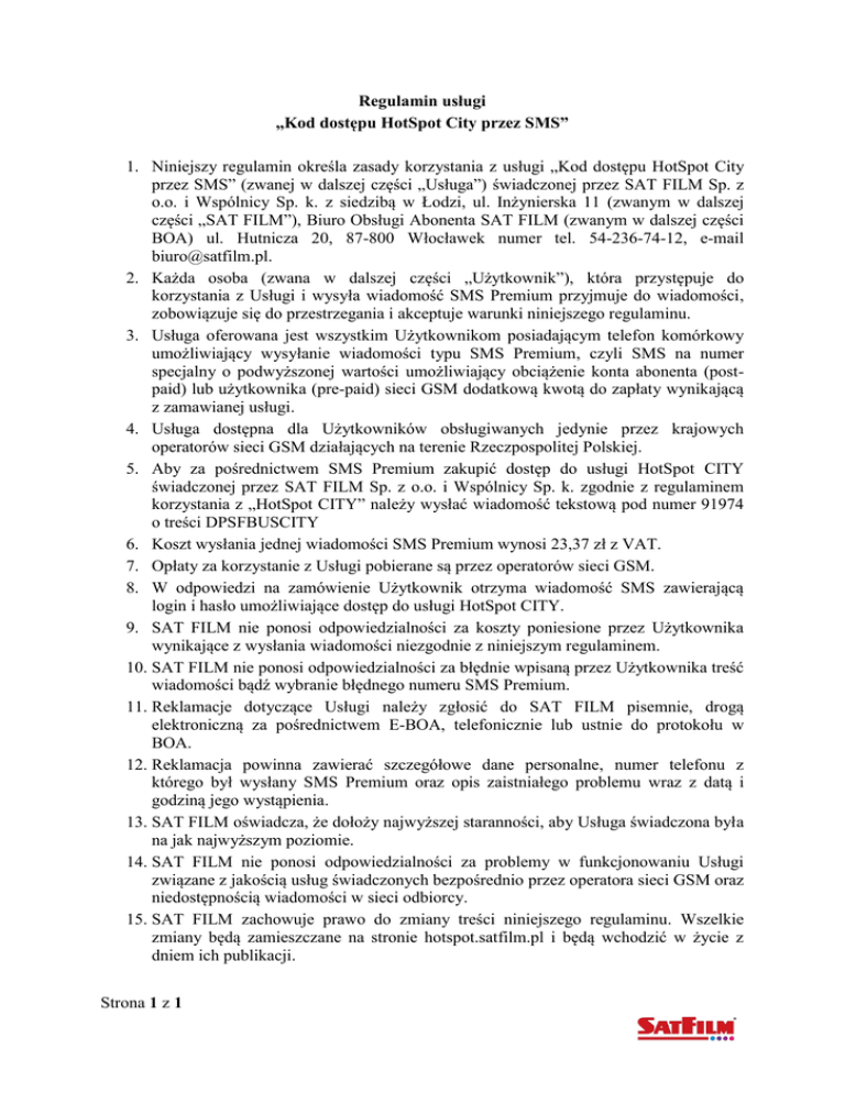 Regulamin usługi „Kod dostępu HotSpot City przez SMS” 1. Niniejszy regulamin określa zasady korzystania z usługi „Kod dostępu HotSpot City przez SMS” (zwanej w dalszej części „Usługa”) świadczonej przez SAT FILM Sp. z o.o. i Wspólnicy Sp. k. z siedzibą w Łodzi, ul. Inżynierska 11 (zwanym w dalszej części „SAT FILM”), Biuro Obsługi Abonenta SAT FILM (zwanym w dalszej części BOA) ul. Hutnicza 20, 87-800 Włocławek numer tel. 54-236-74-12, e-mail [email protected]. 2. Każda osoba (zwana w dalszej części „Użytkownik”), która przystępuje do korzystania z Usługi i wysyła wiadomość SMS Premium przyjmuje do wiadomości, zobowiązuje się do przestrzegania i akceptuje warunki niniejszego regulaminu. 3. Usługa oferowana jest wszystkim Użytkownikom posiadającym telefon komórkowy umożliwiający wysyłanie wiadomości typu SMS Premium, czyli SMS na numer specjalny o podwyższonej wartości umożliwiający obciążenie konta abonenta (postpaid) lub użytkownika (pre-paid) sieci GSM dodatkową kwotą do zapłaty wynikającą z zamawianej usługi. 4. Usługa dostępna dla Użytkowników obsługiwanych jedynie przez krajowych operatorów sieci GSM działających na terenie Rzeczpospolitej Polskiej. 5. Aby za pośrednictwem SMS Premium zakupić dostęp do usługi HotSpot CITY świadczonej przez SAT FILM Sp. z o.o. i Wspólnicy Sp. k. zgodnie z regulaminem korzystania z „HotSpot CITY” należy wysłać wiadomość tekstową pod numer 91974 o treści DPSFBUSCITY 6. Koszt wysłania jednej wiadomości SMS Premium wynosi 23,37 zł z VAT. 7. Opłaty za korzystanie z Usługi pobierane są przez operatorów sieci GSM. 8. W odpowiedzi na zamówienie Użytkownik otrzyma wiadomość SMS zawierającą login i hasło umożliwiające dostęp do usługi HotSpot CITY. 9. SAT FILM nie ponosi odpowiedzialności za koszty poniesione przez Użytkownika wynikające z wysłania wiadomości niezgodnie z niniejszym regulaminem. 10. SAT FILM nie ponosi odpowiedzialności za błędnie wpisaną przez Użytkownika treść wiadomości bądź wybranie błędnego numeru SMS Premium. 11. Reklamacje dotyczące Usługi należy zgłosić do SAT FILM pisemnie, drogą elektroniczną za pośrednictwem E-BOA, telefonicznie lub ustnie do protokołu w BOA. 12. Reklamacja powinna zawierać szczegółowe dane personalne, numer telefonu z którego był wysłany SMS Premium oraz opis zaistniałego problemu wraz z datą i godziną jego wystąpienia. 13. SAT FILM oświadcza, że dołoży najwyższej staranności, aby Usługa świadczona była na jak najwyższym poziomie. 14. SAT FILM nie ponosi odpowiedzialności za problemy w funkcjonowaniu Usługi związane z jakością usług świadczonych bezpośrednio przez operatora sieci GSM oraz niedostępnością wiadomości w sieci odbiorcy. 15. SAT FILM zachowuje prawo do zmiany treści niniejszego regulaminu. Wszelkie zmiany będą zamieszczane na stronie hotspot.satfilm.pl i będą wchodzić w życie z dniem ich publikacji. Strona 1 z 1