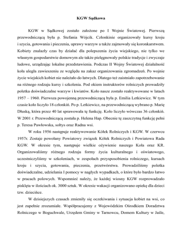 KGW Sądkowa KGW w Sądkowej zostało założone po I Wojnie Światowej. Pierwszą przewodniczącą była p. Stefania Wójcik. Członkinie organizowały kursy kroju i szycia, gotowania i pieczenia, uprawy warzyw a także zajmowały się koronkarstwem. Kobiety znalazły czas by działać dla polepszenia życia wiejskiego, nie tylko we własnym gospodarstwie domowym ale także pielęgnowały polskie tradycje i zwyczaje ludowe, urządzając lokalne przedstawienia. Podczas II Wojny Światowej działalność koła uległa zawieszeniu ze względu na zakaz organizowania zgromadzeń. Po wojnie życie wiejskich kobiet nie należało do łatwych. Dlatego też zaistniało zapotrzebowanie na różnego rodzaju kursy i szkolenia. Pod okiem instruktorów rolniczych prowadziły poletka doświadczalne warzyw i kwiatów. Koło nasze zostało reaktywowane w latach 1957 – 1960. Pierwsza powojenną przewodniczącą była p. Emilia Letkiewicz. W tym czasie koło liczyło 18 członkiń. Po p. Letkiewicz, na przewodniczącą wybrano p. Marię Dłuską, która przez 40 lat sprawowała tę funkcję. Koło liczyło wówczas 36 członkiń. W 2001 r. Przewodniczącą została p. Helena Hap. Obecnie tę zaszczytną funkcję pełni p. Teresa Pawłowska, sołtys oraz Radna wsi. W roku 1956 następuje reaktywowanie Kółek Rolniczych i KGW. W czerwcu 1957r. Zostaje powołany Powiatowy związek Kółek Rolniczych i Powiatowa Rada KGW. W okresie tym, następuje wielkie ożywienie naszego Koła oraz KR. Organizowaliśmy różnego rodzaju formy życia kulturalnego i oświatowego, uczestniczyliśmy w szkoleniach, w zespołach przysposobienia rolniczego, kursach kroju i szycia, gotowania, pieczenia, przetwórstwa. Prowadziliśmy poletka doświadczalne, udzielania I pomocy w nagłych wypadkach, o które było bardzo łatwo w pracach polowych. Wspomnieć należy, że każdej wiosny KGW rozprowadzało pisklęta w ilościach ok. 3000 sztuk. W okresie wakacji organizowano opiekę dla dzieci tzw. dziecińce. W dzisiejszych czasach zmieniły się oczekiwania i sytuacja kobiet na wsi, co jest zupełnie zrozumiałe. Współpracujemy z Wojewódzkim Ośrodkiem Doradztwa Rolniczego w Boguchwale, Urzędem Gminy w Tarnowcu, Domem Kultury w Jaśle, Gminnym Ośrodkiem Kultury w Tarnowcu, jak również ze wszystkimi kołami z terenu całej naszej gminy. Na pochwałę zasługuje dobra współpraca z KGW z Roztok, gdzie wspólnie organizowałyśmy różne uroczystości. Na przestrzeni tych 80-ciu lat mogłyśmy liczyć na życzliwą pomoc Koła Rolniczego na czele z prezesem p. Marianem Kobakiem. Dzięki Wojewódzkiemu Ośrodkowi Rolniczemu w Boguchwale uczestniczyłyśmy w wielu szkoleniach i wykładach. Były to między innymi szkolenia: – Nowe odmiany i uprawa ekologiczna warzyw, – Estetyczne zagospodarowanie zagrody wiejskiej, – Zioła w kuchni i leczeniu, – Jak założyć własną działalność gospodarczą?, – Możliwość pozyskiwania środków unijnych. Na wielka pochwałę zasługuje współpraca i pomoc naszej OSP. Jako jedno z nielicznych KGW założyłyśmy drużynę żeńska OSP, gdzie często wyjeżdżałyśmy na różnego rodzaju szkolenia, konkursy i gaszenie pożarów, zdobywając liczne nagrody i dyplomy. Bardzo dużo w tym okresie pomógł nam nieżyjący komendant gminny OSP p. Władysław Hap, który pełnił tę funkcję przez 50 lat. Po nim funkcję te pełnił p. Stanisław Hap. Współpraca z OSP układała się i układa do dnia dzisiejszego bardzo dobrze. Nasze KGW brało czynny udział przy budowie garażu, basenu strażackiego i przystanku PKS. KGW podjęło się zainstalowania światła elektrycznego na swój koszt, z uzyskanych pieniędzy z zabaw i festynów. Nie sposób pominąć wielkiego działacza Związku Samopomocy Chłopskiej i przyjaciela naszego Koła p. Stanisława Tomasika oraz Stanisława Polaka, którzy poświęcili wiele pracy w rozwój naszej wsi i Kółka Rolniczego. Na przestrzeni tych 80-ciu lat nasze Koło brało czynny udział w Dożynkach Gminnych, Powiatowych i Wojewódzkich,a w 1973 roku 8 członkiń naszego Koła było na Centralnych Dożynkach w Warszawie. Każdego roku po zakończeniu żniw kobiety z KGW przygotowują wieńce dożynkowe ze zbóż, ziół i kwiatów, z którym jadą do kościoła na Święto Matki Bożej Zielnej. Nasze koło często wyjeżdżało na wycieczki do ośrodków postępu rolniczego, do zakładów w Albigowej, do Krakowa, do Częstochowy, Łańcuta i wielu innych atrakcyjnych miejscowości. Koło od 80-ciu lat było ostoją kultury i tradycji ludowej, pielęgnowałyśmy obyczaje i zwyczaje panujące w naszej wsi w zakresie kultury. Corocznie bierzemy udział w wigilii organizowanej dla mieszkańców powiatu i miasta w Domu Kultury w Jaśle. Do tradycji należą spotkania z okazji Dnia Kobiet, wieńcowiny, zabawy karnawałowej z kotylionami. Delegacja z naszego Koła brała udział w jarmarku regionalnym oraz w Żarnowcu z okazji 100 rocznicy powstania Roty Marii Konopnickiej. W minionych latach jak i obecnie koło nasze organizowało Gminne Święto Kobiet, dzień Dziecka i Mikołajki. Wielokrotnie byłyśmy zapraszane na dzień matki oraz inne jubileusze zaprzyjaźnionych kół. Brałyśmy udział w festynach parafialnych, w biesiadzie w Mrukowej, w biesiadzie w Brzyskach na górze Liwocz z okazji 140-tu lat powstania KGW pod hasłem „Rodzinie, Wsi i Ojczyźnie”). W roku 2010 gościłyśmy w kole w Sądkowej delegację i zespół kabaretowoobrzędowy z Białoboki, a później nasze członkinie pojechały z rewizytą na jubileusz 15-lecia tamtego zespołu. Uczestniczyłyśmy w biesiadzie połączonej z Powiatowym Dniem Matki w Skalniku, Tarnowcu, Dębowcu i Skołyszynie. Mamy w swoim gronie 2 laureatki Orderu Serca matka Wsi. Są to koleżanki: p. Maria Dłuska i p. Maria Tomasik. Order Serca Matka Wsi jest symbolem uznania za matczyny trud włożony w wychowanie młodego pokolenia. Wśród nas mamy również poetkę ludową p. Marię Tomasik i t