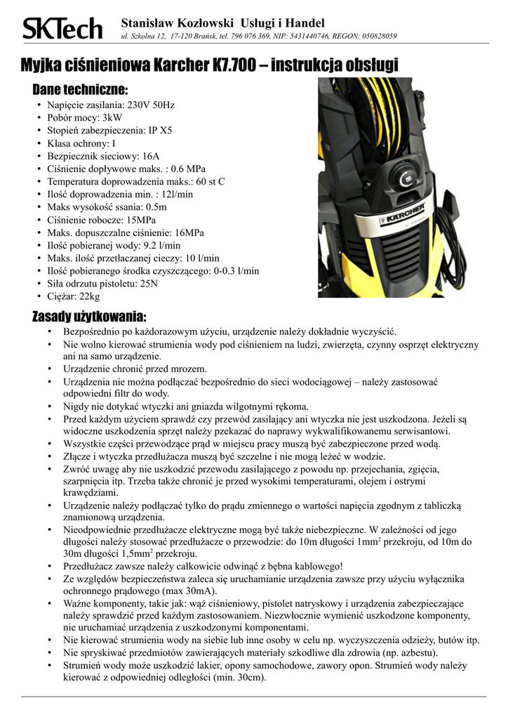 Stanisław Kozłowski Usługi i Handel ul. Szkolna 12, 17-120 Brańsk, tel. 796 076 369, NIP: 5431440746, REGON: 050828059 Myjka ciśnieniowa Karcher K7.700 – instrukcja obsługi Dane techniczne: • • • • • • • • • • • • • • • • Napięcie zasilania: 230V 50Hz Pobór mocy: 3kW Stopień zabezpieczenia: IP X5 Klasa ochrony: I Bezpiecznik sieciowy: 16A Ciśnienie dopływowe maks. : 0.6 MPa Temperatura doprowadzenia maks.: 60 st C Ilość doprowadzenia min. : 12l/min Maks wysokość ssania: 0.5m Ciśnienie robocze: 15MPa Maks. dopuszczalne ciśnienie: 16MPa Ilość pobieranej wody: 9.2 l/min Maks. ilość przetłaczanej cieczy: 10 l/min Ilość pobieranego środka czyszczącego: 0-0.3 l/min Siła odrzutu pistoletu: 25N Ciężar: 22kg Zasady użytkowania: • • • • • • • • • • • • • • • • • Bezpośrednio po każdorazowym użyciu, urządzenie należy dokładnie wyczyścić. Nie wolno kierować strumienia wody pod ciśnieniem na ludzi, zwierzęta, czynny osprzęt elektryczny ani na samo urządzenie. Urządzenie chronić przed mrozem. Urządzenia nie można podłączać bezpośrednio do sieci wodociągowej – należy zastosować odpowiedni filtr do wody. Nigdy nie dotykać wtyczki ani gniazda wilgotnymi rękoma. Przed każdym użyciem sprawdź czy przewód zasilający ani wtyczka nie jest uszkodzona. Jeżeli są widoczne uszkodzenia sprzęt należy pzekazać do naprawy wykwalifikowanemu serwisantowi. Wszystkie części przewodzące prąd w miejscu pracy muszą być zabezpieczone przed wodą. Złącze i wtyczka przedłużacza muszą być szczelne i nie mogą leżeć w wodzie. Zwróć uwagę aby nie uszkodzić przewodu zasilającego z powodu np. przejechania, zgięcia, szarpnięcia itp. Trzeba także chronić je przed wysokimi temperaturami, olejem i ostrymi krawędziami. Urządzenie należy podłączać tylko do prądu zmiennego o wartości napięcia zgodnym z tabliczką znamionową urządzenia. Nieodpowiednie przedłużacze elektryczne mogą być także niebezpieczne. W zależności od jego długości należy stosować przedłużacze o przewodzie: do 10m długości 1mm2 przekroju, od 10m do 30m długości 1,5mm2 przekroju. Przedłużacz zawsze należy całkowicie odwinąć z bębna kablowego! Ze względów bezpieczeństwa zaleca się uruchamianie urządzenia zawsze przy użyciu wyłącznika ochronnego prądowego (max 30mA). Ważne komponenty, takie jak: wąż ciśnieniowy, pistolet natryskowy i urządzenia zabezpieczające należy sprawdzić przed każdym zastosowaniem. Niezwłocznie wymienić uszkodzone komponenty, nie uruchamiać urządzenia z uszkodzonymi komponentami. Nie kierować strumienia wody na siebie lub inne osoby w celu np. wyczyszczenia odzieży, butów itp. Nie spryskiwać przedmiotów zawierających materiały szkodliwe dla zdrowia (np. azbestu). Strumień wody może uszkodzić lakier, opony samochodowe, zawory opon. Strumień wody należy kierować z odpowiedniej odległości (min. 30cm). Stanisław Kozłowski Usługi i Handel ul. Szkolna 12, 17-120 Brańsk, tel. 796 076 369, NIP: 5431440746, REGON: 050828059 • • • • • • • • • • • • • • • Obsługa urządzenia przez dzieci i osoby nieprzyuczone jest zabroniona. Urządzenie nie jest przewidziane do użytku przez osoby o ograniczonych możliwościach fizycznych, sensorycznych czy mentalnych, którym brakuje wiedzy, doświadczenia, umiejętności użytkownia tego urządzenia, chyba ze są one nadzorowane przez osobę za nie odpowiedzialną i zostały przez tą osobę odpowiednio przyuczone i przygotowane do tej pracy. Użytkownik zobligowany jest do wykorzystania urządzenia zgodnie z jego przeznaczeniem i obserwowania otoczenia w kierunku zbliżających się niebezpieczeństw lub osób trzecich. Stosować wyłącznie węże wysokociśnieniowe i złączki zalecane przez producenta. Nie używać urządzenia jeżeli w pobliżu znajdują się inne osoby. Przy dłuższych przerwach w użytkowaniu wyłączyć zasilanie i dopływ wody. Działającego urządzenia nigdy nie pozostawiać bez nadzoru. Nie stosować poniżej 0st C. Nie rozpylać cieczy palnych. Nie zasysać płynów zawierających rozpuszczalniki, kwasów nierozcieńczonych do odpowiedniego stężenia, względnie rozpuszczalników. Mają one negatywny wpływ na materiały zastosowane w urządzeniu i mogą doprowadzić do jego uszkodzenia. Są także substancjami palnymi i mgiełka powstała z ich rozpylenia jest wysoce łatwopalna. Praca w obszarach zagrożonych wybuchem jest zabroniona. Podczas użytkowania urządzenia w obszarach niebezpiecznych należy stosować się do właściwych przepisów bezpieczeństwa. W celu ochrony przed rozpryskującą się wodą i brudem należy nosić odpowiednią odzież ochronną i okulary ochronne bhp. Przed użyciem urządzenia należy je ustawić na równej powierzchni aby zapewnić urządzeniu stateczność. Wąż wysokociśnieniowy odłączać wyłącznie kiedy układ jest pozbawiony ciśnienia. Użytkowanie urządzenia: Myjka wysokociśnieniowa Karcher przeznaczona jest wyłącznie do użytku w gospodarstwach domowych: • do czyszczenia: budynków, narzędzi, fasad, maszyn, pojazdów, tarasów, narzędzi ogrodowych itp. przy użyciu strumienia wody pod wysokim ciśnieniem (w razie potrzeby z użyciem detergentu) • w połączeniu z akcesoriami, częściami zamiennymi i środkami chemicznymi dopuszczonymi przez firmę Karcher. Należy stosować się do wskazówek dołączonych do środków czyszczących. Obsługa urządzenia: • Wyłącznik urządzenia – zapobiega niepożądanemu włączeniu się urządzenia • Blokada pistoletu natryskowego – blokuje dźwignię pistoletu natryskowego i zapobiega niepożądanemu włączeniu urządzenia. • Zawór przelewowy z wyłącznikiem ciśnieniowym – zapobiega przekroczeniu dopuszczalnego ciśnienia roboczego. Po zwolnieniu dźwigni pistoletu natryskowego wyłącznik ciśnieniowy wyłącza pomp