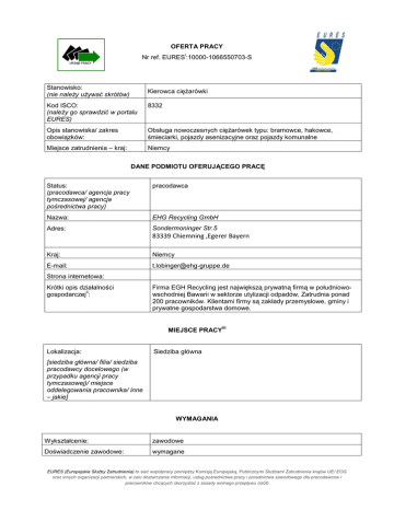 OFERTA PRACY i Nr ref. EURES :10000-1066550703-S Stanowisko: (nie naleŜy uŜywać skrótów) Kierowca cięŜarówki Kod ISCO: (naleŜy go sprawdzić w portalu EURES) 8332 Opis stanowiska/ zakres obowiązków: Obsługa nowoczesnych cięŜarówek typu: bramowce, hakowce, śmieciarki, pojazdy asenizacyjne oraz pojazdy komunalne Miejsce zatrudnienia – kraj: Niemcy DANE PODMIOTU OFERUJĄCEGO PRACĘ Status: (pracodawca/ agencja pracy tymczasowej/ agencja pośrednictwa pracy) pracodawca Nazwa: EHG Recycling GmbH Adres: Sondermoninger Str.5 83339 Chiemning ,Egerer Bayern Kraj: Niemcy E-mail: [email protected] Strona internetowa: Krótki opis działalności ii gospodarczej : Firma EGH Recycling jest największą prywatną firmą w południowowschodniej Bawarii w sektorze utylizacji odpadów, Zatrudnia ponad 200 pracowników. Klientami firmy są zakłady przemysłowe, gminy i prywatne gospodarstwa domowe. MIEJSCE PRACY Lokalizacja: iii Siedziba główna [siedziba główna/ filia/ siedziba pracodawcy docelowego (w przypadku agencji pracy tymczasowej)/ miejsce oddelegowania pracownika/ inne – jakie] WYMAGANIA Wykształcenie: zawodowe Doświadczenie zawodowe: wymagane EURES (Europejskie SłuŜby Zatrudnienia) to sieć współpracy pomiędzy Komisją Europejską, Publicznymi SłuŜbami Zatrudnienia krajów UE/ EOG oraz innych organizacji partnerskich, w celu dostarczania informacji, usług pośrednictwa pracy i poradnictwa zawodowego dla pracodawców i pracowników chcących skorzystać z zasady wolnego przepływu osób Znajomość języków: Uprawnienia/ dyplomy/ dokumenty (np. prawo jazdy): Język Poziom 1.niemiecki rozumienie 1.B1 2.niemieki w mowie i piśmie 2.A2 Prawo jazdy C+E, Dobra kondycja fizyczna, rzetelność i punktualność Inne istotne wymagania: WYNAGRODZENIE I WARUNKI ZATRUDNIENIA Wysokość pensji brutto: 1560 Wysokość pensji netto: 1126 Waluta, w jakiej wypłacana jest pensja: Euro Rodzaj stawki wynagrodzenia: (godzinowa/ tygodniowa/ miesięczna/ roczna/ inna) miesięczna Dodatkowe świadczenia (zakwaterowanie, wyŜywienie, koszty związane ze zmianą miejsca zamieszkania, koszty podróŜy itp.): Firma pomaga w znalezieniu zakwaterowania i załatwieniu formalności w urzędach UmoŜliwia korzystanie z kursu języka niemieckiego Nazwa firmy, z którą zostanie podpisana umowa: EHG Recycling GmbH Rodzaj umowy: Kontrakt na 12 miesięcy (umowa o pracę, umowa zlecenia, wolontariat, praktyka zawodowa/ staŜ, praca zdalna, agencja pracy tymczasowej, inne): Wymiar czasu pracy (praca na pełen etat/ część etatu): Praca na pełen etat Liczba godzin tygodniowo: 40 Data rozpoczęcia: Od zaraz SPOSÓB SKŁADANIA WNIOSKU Wymagane dokumenty (list motywacyjny, CV itp.): CV Język, w którym muszą być sporządzone przedkładane dokumenty: niemiecki Do kogo naleŜy wysłać dokumenty: (do pracodawcy/ doradcy EURES) Do pracodawcy Gdzie naleŜy wysłać dokumenty: (adres, adres e-mail, nr faksu z kodem kraju itp.) EHG Recycling GmbH Herr Tobias Lobinger Sondermoninger Str.5 83339 Chiemning ,Egerer Bayern EURES (Europejskie SłuŜby Zatrudnienia) to sieć współpracy pomiędzy Komisją Europejską, Publicznymi SłuŜbami Zatrudnienia krajów UE/ EOG oraz innych organizacji partnerskich, w celu dostarczania informacji, usług pośrednictwa pracy i poradnictwa zawodowego dla pracodawców i pracowników chcących skorzystać z zasady wolnego przepływu osób Dane teleadresowe doradcy EURES lub przedstawiciela pracodawcy: (nazwisko, adres, telefon, fax, e-mail itp.) Andreas Steinbacher Personalvermittler | EURES-Berater Arbeitgeberservice Berchtesgadener Land Telefon: +49 (0)8651 7637-326 Telefax: +49 (0)8651 7637-334 Mobil: +49 (0)175 2265158 E-Mail: [email protected] Internet: [email protected] www.arbeitsagentur.de Więcej informacji: Tel. 85 7497 235, fax 85 7497 209 WAśNOŚĆ Termin przedkładania podań o pracę / zakończenia waŜności oferty: Do odwołania Uprzejmie informujemy, Ŝe skontaktujemy się wyłącznie z wybranymi kandydatami. UWAGA: 1. Umowa z zagranicznym pracodawcą zostanie zawarta zgodnie z prawem kraju zatrudnienia. Oznacza to, Ŝe wszystkie roszczenia odnośnie do warunków, które obejmuje umowa, moŜna kierować wyłącznie do odpowiedniego sądu w kraju zatrudnienia. Publiczne słuŜby zatrudnienia (EURES) nie mogą pośredniczyć ani reprezentować pracownika w sądzie kraju zatrudnienia w przypadku sporu z pracodawcą. 2. Publiczne słuŜby zatrudnienia (EURES) dokładają wszelkich starań, aby zapewnić rzetelność i wiarygodność ofert pracy zgłoszonych w lokalnym urzędzie pracy. NaleŜy wyjaśnić, Ŝe oferta pracy została zgłoszona przez stronę trzecią i EURES nie odpowiada za ewentualne rozbieŜności między warunkami pracy określonymi w ofercie pracy i warunkami oferowanymi przez potencjalnego pracodawcę. 3. Publiczne słuŜby zatrudnienia (EURES) informują, Ŝe będą zbierać, przetwarzać i przekazywać potencjalnym pracodawcom zgodnie z przepisami dotyczącymi ochrony danych osobowych wszystkie dane osobowe dostarczone przez osoby poszukujące pracy. i Nr ref. na portalu EURES www.eures.europa.eu . Dotyczy ofert pracy publicznych słuŜb zatrudnienia, których bazy danych ofert pracy nie są połączone z portalem EURES. ii Informacje o firmie, takie jak: status prawny, sektor, typ działalności, rodzaj produktów lub świadczonych usług, data rozpoczęcia działalności gospodarczej, liczba pracowników itp. iii Miejsce, w którym będzie wykonywana praca. NaleŜy wypełnić w przypadku gdy: 1) miejsce wykonywania pracy jest inne niŜ siedziba podmiotu oferującego pracę, 2) pracę oferuje agencja pośrednictwa pracy/ agencja pracy tymczasowej. 3) EURES (Europejskie SłuŜby Zatrudnienia) to sieć współpracy pomiędzy Komisją Europejską, Publicznymi SłuŜbami Zatrudnienia krajów UE/ EOG oraz innych organizacji partnerskich, w celu dostarczania informacji, usług pośrednictwa pracy i poradnictwa zawodowego dla pracodawców i pra