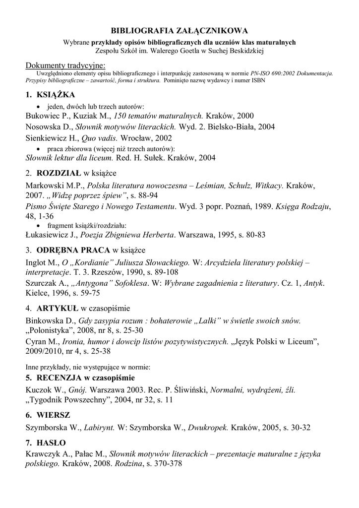 BIBLIOGRAFIA ZAŁĄCZNIKOWA Wybrane przykłady opisów bibliograficznych dla uczniów klas maturalnych Zespołu Szkół im. Walerego Goetla w Suchej Beskidzkiej Dokumenty tradycyjne: Uwzględniono elementy opisu bibliograficznego i interpunkcję zastosowaną w normie PN-ISO 690:2002 Dokumentacja. Przypisy bibliograficzne – zawartość, forma i struktura. Pominięto nazwę wydawcy i numer ISBN 1. KSIĄŻKA jeden, dwóch lub trzech autorów: Bukowiec P., Kuziak M., 150 tematów maturalnych. Kraków, 2000 Nosowska D., Słownik motywów literackich. Wyd. 2. Bielsko-Biała, 2004 Sienkiewicz H., Quo vadis. Wrocław, 2002 praca zbiorowa (więcej niż trzech autorów): Słownik lektur dla liceum. Red. H. Sułek. Kraków, 2004 2. ROZDZIAŁ w książce Markowski M.P., Polska literatura nowoczesna – Leśmian, Schulz, Witkacy. Kraków, 2007. „Widzę poprzez śpiew”, s. 88-94 Pismo Święte Starego i Nowego Testamentu. Wyd. 3 popr. Poznań, 1989. Księga Rodzaju, 48, 1-36 fragment książki/rozdziału: Łukasiewicz J., Poezja Zbigniewa Herberta. Warszawa, 1995, s. 80-83 3. ODRĘBNA PRACA w książce Inglot M., O „Kordianie” Juliusza Słowackiego. W: Arcydzieła literatury polskiej – interpretacje. T. 3. Rzeszów, 1990, s. 89-108 Szurczak A., „Antygona” Sofoklesa. W: Wybrane zagadnienia z literatury. Cz. 1, Antyk. Kielce, 1996, s. 59-75 4. ARTYKUŁ w czasopiśmie Binkowska D., Gdy zasypia rozum : bohaterowie „Lalki” w świetle swoich snów. „Polonistyka”, 2008, nr 8, s. 25-30 Cyran M., Ironia, humor i dowcip listów pozytywistycznych. „Język Polski w Liceum”, 2009/2010, nr 4, s. 25-38 Inne przykłady, nie występujące w normie: 5. RECENZJA w czasopiśmie Kuczok W., Gnój. Warszawa 2003. Rec. P. Śliwiński, Normalni, wydrążeni, źli. „Tygodnik Powszechny”, 2004, nr 32, s. 11 6. WIERSZ Szymborska W., Labirynt. W: Szymborska W., Dwukropek. Kraków, 2005, s. 30-32 7. HASŁO Krawczyk A., Pałac M., Słownik motywów literackich – prezentacje maturalne z języka polskiego. Kraków, 2008. Rodzina, s. 370-378 8. ILUSTRACJA / REPRODUKCJA Caspar D.F., Wędrowiec nad morzem mgieł [il.]. W: Historia piękna. Red. U. Eco. Poznań, 2005, s. 283 9. UTWÓR MUZYCZNY Bach J. S., Brandenburg Contertos [dokument dźwiękowy]. Warszawa, 2008 10. FILM Lawa - opowieść o „Dziadach” Adama Mickiewicza [film]. Reż. T. Konwicki. Warszawa, 1989 Dokumenty elektroniczne: Uwzględniono elementy opisu bibliograficznego i interpunkcję zastosowaną w normie PN-ISO 690-2:1999 Informacja i dokumentacja. Przypisy bibliograficzne - dokumenty elektroniczne i ich części. Pominięto nazwę wydawcy i numer ISBN 11. KSIĄŻKA na płycie CD-ROM Kopaliński W., Słownik wyrazów obcych i zwrotów obcojęzycznych [CD-ROM]. Wersja 1.03.16. Łódź, 1998 12. KSIĄŻKA w Internecie Kochanowski J., Odprawa posłów greckich [online]. Wrocław, 1962 [dostęp 1 grudnia 2011]. Dostępny w Internecie: http://literat.ug.edu.pl/odprawa/index.htm 13. ARTYKUŁ w czasopiśmie internetowym Wróblewski J., Arcydzieło Kertesza. „Polityka” [online]. 2002, nr 11 [dostęp 1 grudnia 2011]. Dostępny w Internecie: http://archiwum.polityka.pl/art/arcydzielo-kertesza,373011.html 14. ARTYKUŁ na stronie WWW Baczewski S., Idea szlachectwa w twórczości Mikołaja Reja [online]. [dostęp 30 listopada 2011]. Dostępny w Internecie: http://staropolska.pl/renesans/opracowania/Baczewski.html Szkolne Centrum Informacji Zespołu Szkół im. W. Goetla