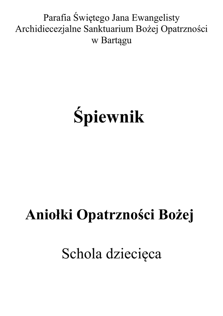 Parafia Świętego Jana Ewangelisty Archidiecezjalne Sanktuarium Bożej Opatrzności w Bartągu Śpiewnik Aniołki Opatrzności Bożej Schola dziecięca Spis treści: strona 1. Oto jest dzień 1 2. Kocham Cię Jezu 1 3. Nie samym Chlebem 1 4. Ofiaruje Tobie Panie 1 5. Bądź z nami w kontakcie 1 6. Jesteś Panie winnym krzewem 2 7. Jesteś Królem 2 8. W kruszynie chleba 3 9. Bóg nie umarł 3 10. Na jeziorze 3 11. Bóg i tylko On 3 12. Taki duży, taki mały 4 13. Dotknij Panie moich oczu 4 14. Chcę przestąpić 5 15. Chwalę Ciebie Panie 5 16. Nie bój się, wypłyń na głębię 5 17. Już teraz we mnie kwitną Twe ogrody 5 18. Barka 6 19. Duchu Święty przyjdź/ niech wiara... 6 20. Alleluja/Amen, Alleluja 7 21. Maryjo Śliczna Pani 7 22. Magnificat 8 23. Uwielbiam Imię Twoje Panie 8 24. Jak łania 8 25. Jesteś radością 8 26. Jezus daje nam zbawienie 9 27. Pan jest Pasterzem moim 9 28. Dotknął mnie dziś mój Pan 9 29. Jezus Chrystus moim Panem jest 9 30. Przyjaciela mam 10 31. Tyś jak skała 10 32. Dzielmy się wiarą 10 33. Bóg tak umiłował świat 11 34. Oto stoję u drzwi 11 35. Idzie mój Pan 11 36. Pan mnie strzeże 11 37. Panie dobry jak chleb 12 38. Mój Zbawiciel 12 39. Wszystkie moje troski i kłopoty 13 40. Bóg kocha mnie 13 41. Pan blisko jest 13 42. Przyjdź Panie Jezu 13 43. Ziemia 14 44. Tak mnie skrusz 14 45. Tyle dobrego 15 46. Przychodzisz Panie 15 47. Przyjdź Panie Jezu 15 48. Abba Ojcze 16 49. Gdyby wiara Twa 16 50. Kiedyś wino i chleb 17 51. Jeden jest tylko Pan 17 52. O Panie Ty nam dajesz 18 53. Ci, co zaufali Panu 18 54. Bo góry mogą ustąpić 18 55. Przyjdźcie do stołu Miłosierdzia 19 56. Oblubieniec 19 57. Doszły wieści 19 58. Niedziella 20 59. Jest na świecie miłość 20 60. O piękności niestworzona 21 61. Bliskie jest Królestwo Boże 21 62. Marana tha 22 63. Gdy srebrników w garść 22 64. Nad Jordanem 23 65. Pewnej nocy 23 66. Zbawienie przyszło przez krzyż 24 67. Albowiem Tak Bóg 24 68. Golgota 25 69. Niebiosa, deszcz z góry spuśćcie 26 70. KRZYŻU CHRYSTUSA 26 1. OTO JEST DZIEŃ OTO JEST DZIEŃ,/X2 Który dał nam Pan./x2 Weselmy się./x2 I radujmy się w nim./x2 Oto jest dzień, który dał nam Pan! Weselmy się i radujmy się w nim. Oto jest dzień, oto jest dzień, Który dał nam Pan! 2. KOCHAM CIĘ JEZU CAŁYM SERCEM SWYM KOCHAM CIĘ JEZU CAŁYM SERCEM SWYM KOCHAM CIĘ JEZU CAŁYM SERCEM SWYM KOCHAM CIĘ CAŁYM SERCEM CAŁYM SERCEM SWYM. 3. NIE SAMYM CHLEBEM ŻYJE CZŁOWIEK Nie samym chlebem żyje człowiek, LECZ KAŻDYM SŁOWEM, KTÓRE POCHODZI Z UST BOŻYCH. 4. OFIARUJĘ TOBIE PANIE MÓJ Ofiaruję Tobie Panie mój Całe życie me, cały jestem twój, aż na wieki. Oto moje serce przecież wiesz Tyś miłością mą, jedyną jest. 5. BĄDŹ Z NAMI W KONTAKCIE Bądź z nami w kontakcie Panie Boże Chociaż diabeł Robi nam zwarcie Niech iskra miłości Między nami przez skoczy Niech zapalą się nasze latarnie. 6.JESTEŚ PANIE WINNYM KRZEWEM 1. Jesteś Panie winnym krzewem, A my jego latorośle, Moc czerpiemy tylko z Ciebie, Ty w nas żyjesz Swą miłością. Ref: Panie (Panie), Panie (Panie) Naucz nas w miłości Twojej trwać. Ref: Panie (Panie), Panie (Panie) Naucz nas w miłości Twojej trwać. 2. Cóż trwałego poza Tobą, Człowiek zdziała sam za siebie. Któż potrafi własne dobro Oblec w kształty nieśmiertelne. 3. Ty przyjaźnią nas ogarniasz, Tak wspaniałą i szeroką, Że wyzwala pełną radość W Sercu, które ciebie kocha. 4. Wejdź o Jezu, w nasze życie, Głębią łaski, mocą słowa, Byśmy mogli owoc przynieść Cześć i chwałę Ojcu oddać. 7. JESTEŚ KRÓLEM Jesteś Królem /x2 Królem jest Bóg. Podnieśmy wszyscy nasze serca, Podnieśmy wszyscy nasze dłonie. Stawajmy przed obliczem Boga Wielbiąc Go! /x2 8. W KRUSZYNIE CHLEBA W kruszynie chleba Panie jesteś, Schowany, wielki, Ty Pan. Przychodzisz do nas już przez wieki, By ofiarować siebie nam. W tych kroplach wina - Twoja Krew. Przelana za nas, Panie mój. Tak wiele jej na krzyżu było, Aby odkupić nas od win. Ty Panie, Miłością jesteś. Ty Panie, kochasz nas. I proszę Ciebie, by tak było Wciąż, przez wiele lat. 9. BÓG NIE UMARŁ, JEZUS ŻYJE /3X daj Mu ręce swe, daj Mu nogi swe, daj Mu serce swe daj Mu duszę swą, On Twoim Panem jest. 10. NA JEZIORZE WIELKA BURZA NA JEZIORZE WIELKA BURZA Jezus ze mną w łodzi jest Mocno za rękę trzyma mnie łódka nie kołysze się. 11. BÓG I TYLKO ON Bóg i tylko on Bóg i tylko on Panem moim jest jedynym Panem moim jest na wieki. 12. TAKI DUŻY TAKI MAŁY MOŻE ŚWIĘTYM BYĆ TAKI DUŻY TAKI MAŁY MOŻE ŚWIĘTYM BYĆ Taki gruby taki chudy może Świętym być Taki ja i taki ty może Świętym być Taki ja i taki ty może Świętym być Święty kocha Boga życia mu nie szkoda Kocha Bliźniego jak siebie samego Święty kocha Boga życia mu nie szkoda Kocha Bliźniego jak siebie samego Taki duży taki mały ... Kto się nawróci ten się nie smuci Każdy Święty chodzi uśmiechnięty Tylko nawrócona jest zadowolona Każda Święta chodzi uśmiechnięta Taki duży taki mały... Nic nie potrzebuje zawsze się raduje bo święta załoga kocha tylko Boga /x2 Taki duży taki mały ... Gdzie można dzisiaj Świętych zobaczyć są między nami w szkole i w pracy /x2 13.DOTKNIJ PANIE MOICH OCZU, ABYM PRZEJRZAŁ Dotknij Panie moich oczu, abym przejrzał Dotknij Panie moich warg, abym przemówił uwielbieniem. Dotknij Panie mego serca i oczyść je Niech Twój Święty Duch Dziś ogarnia mnie! 14. CHCĘ PRZESTĄPIĆ JEGO PRÓG Chcę przestąpić Jego próg Z dziękczynieniem w sercu mym. I w przedsionki Pana wejść, chwaląc Go. Bo kolejny nadszedł dzień, Który dał dla mnie Bóg. Chcę śpiewać Mu, bo Pan radością mą. Pan radością mą, Pan radością mą, Chcę śpiewać Mu, bo Pan radością moją jest, Pan radością mą, Pan radością mą, Chcę śpiewać Mu, bo Pan radością mą. 15. CHWALĘ CIEBIE PANIE Chwalę Ciebie Panie i uwielbiam Wznoszę w górę swoje ręce U