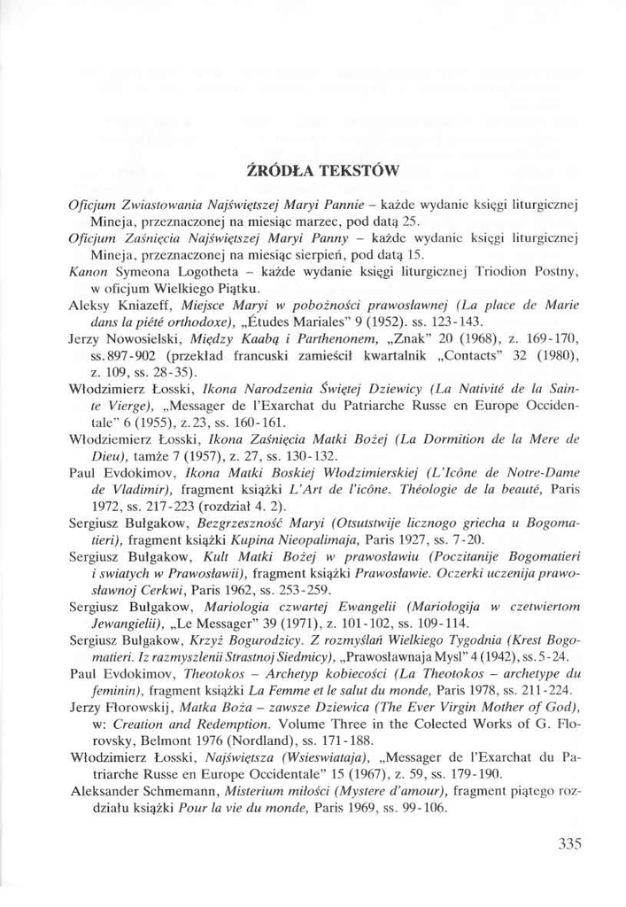 ŹRÓDŁA TEKSTÓW Oficjum Zwiastowania Najświętszej Maryi Pannie – każde wydanie księgi liturgicznej Mineja, przeznaczonej na miesiąc marzec, pod datą 25. Oficjum Zaśnięcia Najświętszej Maryi Panny – każde wydanie księgi liturgicznej Mineja, przeznaczonej na miesiąc sierpień, pod datą 15. Kanon Symeona Logotheta – każde wydanie księgi liturgicznej Triodion Postny, w oficjum Wielkiego Piątku. Aleksy Kniazeff, Miejsce Maryi w pobożności prawosławnej (La place de Marie dans la piété orthodoxe), „Études Mariales” 9 (1952). s . 123-143. Jerzy Nowosielski, Między Kaabą i Parthenonem, „Znak” 20 (1968), z. 169-170, s . 897-902 (przekład francuski zamieścił kwartalnik „Contacts” 32 (1980), z. 109, s . 28-35). Włodzimierz Łosski, Ikona Narodzenia Świętej Dziewicy (La Nativité de la Sain te Vierge), „Messager de ľ Exarchat du Patriarche Russe en Europe Occiden tale" 6 (1955), z. 23, s . 160-161. Włodziemierz Łosski, Ikona Zaśnięcia Matki Bożej (La Dormition de la Mere de Dieu), tamże 7 (1957), z. 27, s . 130-132. Paul Evdokimov, Ikona Matki Boskiej Włodzimierskiej (L’Icône de Notre-Dame de Vladimir), fragment książki Ľ Art de ľ icône. Théologie de la beauté, Paris 1972, s . 217-223 (rozdział 4. 2). Sergiusz Bułgakow, Bezgrzeszność Maryi (Otsutstwije licznogo griecha u Bogoma tieri), fragment książki Kupina Nieopalimaja, Paris 1927, s . 7-20. Sergiusz Bułgakow, Kult Matki Bożej w prawosławiu (Poczitanije Bogomatieri i swiatych w Prawosławii), fragment książki Prawosławie. Oczerki uczenija prawo sławnoj Cerkwi, Paris 1962, s . 253-259. Sergiusz Bułgakow, Mariologia czwartej Ewangelii (Mariołogija w czetwiertom Jewangielii), „Le Messager” 39 (1971), z. 101-102, s . 109-114. Sergiusz Bułgakow, Krzyż Bogurodzicy. Z rozmyślań Wielkiego Tygodnia (Krest Bogo matieri. Iz razmyszlenii StrastnojSiedmicy), „PrawosławnajaMysl” 4 (1942), s . 5-24. Paul Evdokimov, Theotokos – Archetyp kobiecości (La Theotokos – archetype du f eminin), fragment książki La Femme et le salut du monde, Paris 1978, s . 211-224. Jerzy Fłorowskij, Matka Boża – zawsze Dziewica (The Ever Virgin Mother o f God), w: Creation and Redemption. Volume Three in the Colected Works of G. Flo rovsky, Belmont 1976 (Nordland), s . 171-188. Włodzimierz Łosski, Najświętsza (Wsieswiataja), „Messager de ľExarchat du Pa triarche Russe en Europe Occidentale” 15 (1967), z. 59, s . 179-190. Aleksander Schmemann, Misterium miłości (Mystere ď amour), fragment piątego roz działu książki Pour la vie du monde, Paris 1969, s . 99-106. 335 Paweł Fłorenskij, Sofia (Sofija), fragment książki Stołp i utwierżdienije istiny. Opyt Prawosławnoj fieodicei w dwienadcati pismach, Moskwa 1914 s 349-370 762-766. Jerzy Fłorowskij, O kulcie Sofii-Mądrości Bożej w Bizancjum i na Rusi (O poczitanii Sofii, Priemudrosti Bożijej w Wizantii i na Rusi), w: Trudy V Sjezda Akadiemiczes kich Organizacji zagranicej, Sofia 1938, I, s . 498-500. Św. Grzegorz Palamas, Homilia na uroczystość Zaśnięcia Najświętszej Maryi Panny (Homilia XXXVII. In Sanctissimam Dormitionem Purrisimae Dominae nostrae Deiparae semperque Virginis Mariae), PG 151, 460-473. Mikołaj Kabasilas, Homilia na uroczystość Narodzenia Najświętszej Maryi Panny (Homilia in Nativitatem Dominae nostrae Deiparae semperque Virginis Mariae) PO 19, 465-484. Mikołaj Kabasilas, Homilia na uroczystość Zwiastowania Najświętszej Maryi Pannie (Homilia in Anuntiationem Dominae nostrae Deiparae), PO 19, 484-495. Mikołaj Kabasilas, Homilia na uroczystość Zaśnięcia Najświętszej Maryi Panny (Homilia in Dormitionem Dominae nostrae Deiparae), PO 19, 495-510. Filaret Drozdow, Homilia na uroczystość Narodzenia Najświętszej Maryi Panny (Słowo w dien’ Rożdiestwa Prieswiatyja Bogorodicy), Słowa i rieczi, Moskwa 1844 I, s . 375-383. Filaret Drozdow, Homilia na uroczystość Wprowadzenia Najświętszej Maryi Panny do Świątyni (Słowo w dien’ Wwiedienija wo chram Prieswiatyja Bogorodicy), tamże, s . 384-394. Filaret Drozdow, Homilia na uroczystość Zwiastowania Najświętszej Maryi Pannie (Słowo w dien’ Błagowieszczenija Prieswiatyja Bogorodicy), tamże, s . 395-409. Filaret Drozdow, Homilia na uroczystość Zaśnięcia Najświętszej Maryi Panny (Słowo w dien’ Uspienija Prieswiatyja Bogorodicy), tamże, s . 504-515. Sergiusz Bułgakow, Świetlista Opieka nad światem. Homilia na święto Opieki Matki Bożej (Swietłyj Pokrow nad mirom), Radosť Cerkownaja. Słowa i Pouczenija Paris 1938, s . 9-12. Sergiusz Bułgakow, Świątynia świątyni (Chram chrama), tamże, s . 12-14 Sergiusz Bułgakow, Nieskalane macierzyństwo (Prieczistoje matierinstwo), tam że, s . 14-17. Sergiusz Bułgakow, Głos archanioła (Archangielskij głas), tamże, s . 49-54. Sergiusz Bułgakow, Zwiastowanie i krzyż (Strastnoje Błagowieszczenije), tamże, s . 54-56. Paweł Fłorenskij, Ziemska droga Matki Bożej (Ziemnoj puť Bogomatieri), „Bogo słowskije trudy” 23 (1982), s . 312-316. 336