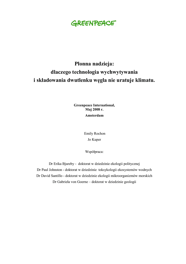 Płonna nadzieja: dlaczego technologia wychwytywania i składowania dwutlenku węgla nie uratuje klimatu. Greenpeace International, Maj 2008 r. Amsterdam Emily Rochon Jo Kuper Współpraca: Dr Erika Bjureby - doktorat w dziedzinie ekologii politycznej Dr Paul Johnston - doktorat w dziedzinie toksykologii ekosystemów wodnych Dr David Santillo - doktorat w dziedzinie ekologii mikroorganizmów morskich Dr Gabriela von Goerne – doktorat w dziedzinie geologii Płonna nadzieja: dlaczego technologia wychwytywania i składowania dwutlenku węgla nie uratuje klimatu. Streszczenie raportu Technologia wychwytywania i składowania dwutlenku węgla CCS (z ang. Carbon Capture and Storage) ma na celu zmniejszenie wpływu spalania paliw kopalnych na klimat poprzez przechwytywanie CO2 z kominów elektrowni i umieszczanie go pod ziemią. Przemysł węglowy uŜywa argumentu wdroŜenia tej technologii w przyszłości dla uzasadnienia budowy nowych elektrowni węglowych. Niniejszy raport oparty na naukowo recenzowanych niezaleŜnych badaniach dowodzi, Ŝe: • CCS nie będzie dostępne w porę, aby uniknąć niebezpiecznych zmian klimatycznych. CCS moŜe zostać wdroŜone na uŜyteczną skalę nie wcześniej niŜ w 2030 r.1. Aby uniknąć najpowaŜniejszych konsekwencji wynikających ze zmian klimatu, globalna emisja gazów cieplarnianych musi zacząć spadać po roku 2015 r., czyli juŜ za siedem lat. • CCS powoduje straty energii. Technologia CCS zuŜywa od 10 do 40 % energii wytwarzanej przez elektrownię2. Zastosowanie CCS na szeroką skalę prawdopodobnie zniweluje wzrost efektywności wytwarzania energii osiągnięty w ciągu ostatnich 50 lat i spowoduje zwiększenie zuŜycia surowców o jedną trzecią3. • Składowanie dwutlenku węgla pod ziemią jest ryzykowne. Nie moŜna zagwarantować Ŝe stałe składowanie CO2 jest całkowicie bezpieczne. Ulatnianie się nawet niewielkiego odsetka składowanych gazów moŜe zaprzepaścić wszelkie wysiłki podejmowane na rzecz ograniczenia zmian klimatycznych. • CCS jest drogie. Technologia ta moŜe prowadzić do podwojenia kosztów produkcji elektrowni i podnieść cenę energii elektrycznej od 21 do 91%4. Fundusze przeznaczone na CCS nie zasilą jednocześnie inwestycji, które trwale zapobiegają zmianom klimatycznym. • CCS wiąŜe się ze znacznym ryzykiem odpowiedzialności prawnej. Stanowi zagroŜenie dla zdrowia ludzkiego, ekosystemów i klimatu. Nie wiadomo jak wysoki jest poziom tego ryzyka. Kryzys klimatyczny wymaga podjęcia szybkich działań. Klimatolodzy ostrzegają, Ŝe aby uniknąć jego najgorszych skutków, po 2015 roku globalna emisja gazów cieplarnianych musi spaść – do 2050 roku - o co najmniej 50% w stosunku do poziomu z roku 1990. Węgiel to paliwo kopalne, które powoduje największe zanieczyszczenia i stanowi najpowaŜniejsze zagroŜenie dla klimatu. Jeśli zostaną zrealizowane aktualne plany wielomiliardowych inwestycji w elektrownie węglowe, to emisja CO2 spowodowana spalaniem węgla wzrośnie o 60% do roku 2030. Obawy związane z wykonalnością, kosztami, bezpieczeństwem i odpowiedzialnością prawną sprawiają, Ŝe CSS to powaŜne ryzyko. Wyniki ogólnoświatowej ankiety przeprowadzonej wśród 1000 osób podejmujących decyzje mające wpływ na klimat, rodzą powaŜne wątpliwości, co do uŜyteczności CCS. Jedynie 34% respondentów było pewnych, Ŝe zastosowanie „czystych technologii węglowych” w istniejących elektrowniach, moŜe w ciągu najbliŜszych 25 lat zmniejszyć emisję CO2 bez nadmiernych efektów 1 Greenpeace International Płonna nadzieja: dlaczego technologia wychwytywania i składowania dwutlenku węgla nie uratuje klimatu. ubocznych, a tylko 36% badanych było przekonanych, Ŝe pozwolą one nowym elektrowniom dostarczać energię wolną od dwutlenku węgla5. Realnym rozwiązaniem pozwalającym na zatrzymanie zmian niebezpiecznych dla klimatu jest wykorzystanie odnawialnych źródeł energii oraz efektywność energetyczna. Znaczne zmniejszenie zapotrzebowania na energię jest moŜliwe dzięki rozwiązaniom związanym z wydajnością, które przynoszą oszczędności przewyŜszające nakłady. Dostępne technicznie odnawialne źródła energii takie jak wiatr, fale i słońce mogą zapewnić sześć razy więcej energii niŜ wynosi współczesne zapotrzebowanie na całym świecie. [R]ewolucja Energetyczna Greenpeace wskazuje, w jaki sposób odnawialne źródła energii, w połączeniu ze zwiększoną wydajnością energetyczną, mogą zmniejszyć globalną emisję CO2 o 50% i zaspokoić połowę światowego zapotrzebowania na energię do roku 20506. Czym jest CCS? CCS to zintegrowany proces podzielony na trzy odrębne etapy: wychwytywanie dwutlenku węgla, jego transport i składowanie (wraz z pomiarami, monitoringiem i kontrolą). Technologia wychwytywania ma na celu wytworzenie skoncentrowanego strumienia CO2, który moŜna spręŜyć, przewieźć i przechowywać. Transport wychwyconego CO2do miejsc składowania odbywać się będzie najprawdopodobniej rurociągiem. Składowanie jest końcową częścią procesu. Znaczna większość CO2 ma być składowana geologicznie na lądzie lub pod dnem morskim. Proponowana metoda umieszczania CO2 w oceanach została porzucona w związku ze znacznym wpływem CO2 na ekosystem oceanu i ograniczenia prawne, które praktycznie wykluczają zastosowanie takich rozwiązań. CCS nie będzie dostępne na czas PoniewaŜ kryzys klimatyczny wymaga podjęcia natychmiastowych działań, realne rozwiązania muszą być gotowe do wdroŜenia na szeroką skalę najszybciej, jak to moŜliwe. CCS nie będzie dostępne wystarczająco wcześnie. Wg Programu Narodów Zjednoczonych ds. Rozwoju (UNDP) „CCS pojawi się duŜo za późno, aby pomóc światu uniknąć niebezpiecznych zmian klimatycznych”7. Brakuje obecnie duŜych elektrowni opalanych węglem, które wychwytywałyby dwutlenek węgla, nie mówiąc juŜ o tych, które miałyby gotowe miejsca do jego składow