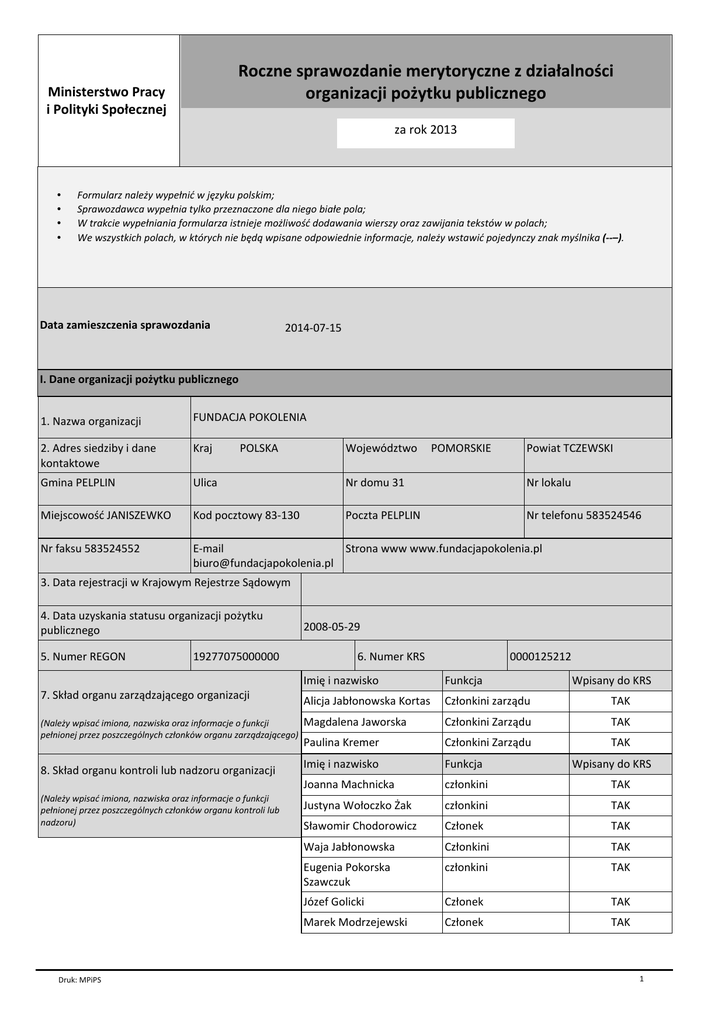 ZŽĐnjŶĞƐƉƌĂǁŽnjĚĂŶŝĞŵĞƌLJƚŽƌLJĐnjŶĞnjĚnjŝĂųĂůŶŽƑĐŝ ŽƌŐĂŶŝnjĂĐũŝƉŽǏLJƚŬƵƉƵďůŝĐnjŶĞŐŽ Ministerstwo Pracy ŝWŽůŝƚLJŬŝ^ƉŽųĞĐnjŶĞũ za rok 2013 • • • • &ŽƌŵƵůĂƌnjŶĂůĞǏLJǁLJƉĞųŶŝđǁũħnjLJŬƵƉŽůƐŬŝŵ͖ ^ƉƌĂǁŽnjĚĂǁĐĂǁLJƉĞųŶŝĂƚLJůŬŽƉƌnjĞnjŶĂĐnjŽŶĞĚůĂŶŝĞŐŽďŝĂųĞƉŽůĂ͖ tƚƌĂŬĐŝĞǁLJƉĞųŶŝĂŶŝĂĨŽƌŵƵůĂƌnjĂŝƐƚŶŝĞũĞŵŽǏůŝǁŽƑđĚŽĚĂǁĂŶŝĂǁŝĞƌƐnjLJŽƌĂnjnjĂǁŝũĂŶŝĂƚĞŬƐƚſǁǁƉŽůĂĐŚ͖ tĞǁƐnjLJƐƚŬŝĐŚƉŽůĂĐŚ͕ǁŬƚſƌLJĐŚŶŝĞďħĚČǁƉŝƐĂŶĞŽĚƉŽǁŝĞĚŶŝĞŝŶĨŽƌŵĂĐũĞ͕ŶĂůĞǏLJǁƐƚĂǁŝđƉŽũĞĚLJŶĐnjLJnjŶĂŬŵLJƑůŶŝŬĂ (--–). Data zamieszczenia sprawozdania 2014-07-15 /͘ĂŶĞŽƌŐĂŶŝnjĂĐũŝƉŽǏLJƚŬƵƉƵďůŝĐnjŶĞŐŽ 1. Nazwa organizacji FUNDACJA POKOLENIA 2. Adres siedziby i dane kontaktowe Kraj Gmina PELPLIN Ulica Nr domu 31 Nr lokalu DŝĞũƐĐŽǁŽƑđ:E/^t<K Kod pocztowy 83-130 Poczta PELPLIN Nr telefonu 583524546 Nr faksu 583524552 E-mail Strona www www.fundacjapokolenia.pl [email protected] POLSKA Województwo POMORSKIE Powiat TCZEWSKI ϯ͘ĂƚĂƌĞũĞƐƚƌĂĐũŝǁ<ƌĂũŽǁLJŵZĞũĞƐƚƌnjĞ^ČĚŽǁLJŵ ϰ͘ĂƚĂƵnjLJƐŬĂŶŝĂƐƚĂƚƵƐƵŽƌŐĂŶŝnjĂĐũŝƉŽǏLJƚŬƵ publicznego 5. Numer REGON 19277075000000 ϳ͘^ŬųĂĚŽƌŐĂŶƵnjĂƌnjČĚnjĂũČĐĞŐŽŽƌŐĂŶŝnjĂĐũŝ ;EĂůĞǏLJǁƉŝƐĂđŝŵŝŽŶĂ͕ŶĂnjǁŝƐŬĂŽƌĂnjŝŶĨŽƌŵĂĐũĞŽĨƵŶŬĐũŝ ƉĞųŶŝŽŶĞũƉƌnjĞnjƉŽƐnjĐnjĞŐſůŶLJĐŚĐnjųŽŶŬſǁŽƌŐĂŶƵnjĂƌnjČĚnjĂũČĐĞŐŽͿ ϴ͘^ŬųĂĚŽƌŐĂŶƵŬŽŶƚƌŽůŝůƵďŶĂĚnjŽƌƵŽƌŐĂŶŝnjĂĐũŝ ;EĂůĞǏLJǁƉŝƐĂđŝŵŝŽŶĂ͕ŶĂnjǁŝƐŬĂŽƌĂnjŝŶĨŽƌŵĂĐũĞŽĨƵŶŬĐũŝ ƉĞųŶŝŽŶĞũƉƌnjĞnjƉŽƐnjĐnjĞŐſůŶLJĐŚĐnjųŽŶŬſǁŽƌŐĂŶƵŬŽŶƚƌŽůŝůƵď nadzoru) Druk: MPiPS 2008-05-29 6. Numer KRS 0000125212 /ŵŝħŝŶĂnjǁŝƐŬŽ Funkcja Wpisany do KRS ůŝĐũĂ:ĂďųŽŶŽǁƐŬĂ<ŽƌƚĂƐ njųŽŶŬŝŶŝnjĂƌnjČĚƵ TAK Magdalena Jaworska njųŽŶŬŝŶŝĂƌnjČĚƵ TAK Paulina Kremer njųŽŶŬŝŶŝĂƌnjČĚƵ TAK /ŵŝħŝŶĂnjǁŝƐŬŽ Funkcja Joanna Machnicka ĐnjųŽŶŬŝŶŝ TAK :ƵƐƚLJŶĂtŽųŽĐnjŬŽĂŬ ĐnjųŽŶŬŝŶŝ TAK ^ųĂǁŽŵŝƌŚŽĚŽƌŽǁŝĐnj njųŽŶĞŬ TAK tĂũĂ:ĂďųŽŶŽǁƐŬĂ njųŽŶŬŝŶŝ TAK Eugenia Pokorska Szawczuk ĐnjųŽŶŬŝŶŝ TAK Józef Golicki njųŽŶĞŬ TAK Marek Modrzejewski njųŽŶĞŬ TAK Wpisany do KRS 1 9. Cele statutowe organizacji ;EĂůĞǏLJŽƉŝƐĂđĐĞůĞŶĂƉŽĚƐƚĂǁŝĞƐƚĂƚƵƚƵŽƌŐĂŶŝnjĂĐũŝͿ ĞůĞŵ&ƵŶĚĂĐũŝũĞƐƚĚnjŝĂųĂůŶŽƑđĞĚƵŬĂĐLJũŶĂŝŬƵůƚƵƌĂůŶĂǁnjĂŬƌĞƐŝĞ͗ ͻnjďůŝǏĞŶŝĂŵŝħĚnjLJŶĂƌŽĚĞŵƉŽůƐŬŝŵĂŝŶŶLJŵŝŶĂƌŽĚĂŵŝƵƌŽƉLJ͖ ͻǁƐƉŝĞƌĂŶŝĂƌŽnjǁŽũƵƐƉŽųĞĐnjĞŷƐƚǁĂŽďLJǁĂƚĞůƐŬŝĞŐŽ͖ ͻƵƉŽǁƐnjĞĐŚŶŝĂŶŝĂŝĚĞŝƐĂŵŽƌnjČĚŶŽƑĐŝŝƐĂŵŽƌnjČĚƵ͖ • sprzyjania rozkwitowi kultury i sztuki; ͻǁƐƉŝĞƌĂŶŝĂƌŽnjǁŽũƵŬƵůƚƵƌLJŵŶŝĞũƐnjŽƑĐŝŶĂƌŽĚŽǁLJĐŚŝŐƌƵƉĞƚŶŝĐnjŶLJĐŚ njĂŵŝĞƐnjŬƵũČĐLJĐŚƚĞƌĞŶZnjĞĐnjLJƉŽƐƉŽůŝƚĞũWŽůƐŬŝĞũ͖ ͻǁƐƉŝĞƌĂŶŝĂƉƌnjĞĚƐŝħďŝŽƌĐnjŽƑĐŝ͖ ͻƉƌnjĞĐŝǁĚnjŝĂųĂŶŝĂďĞnjƌŽďŽĐŝƵ͖ ͻnjĂƉŽďŝĞŐĂŶŝĂǁLJŬůƵĐnjĂŶŝƵƐƉŽųĞĐnjŶĞŵƵ͖ • promowania i wspomagania edukacji; • rozwoju i obszarów wiejskich. Fundacja realizuje swoje cele poprzez: 1.Organizowanie i finansowanie: Ă͘ŵŝħĚnjLJŶĂƌŽĚŽǁĞũǁLJŵŝĂŶLJŵųŽĚnjŝĞǏLJ͖ 10. Sposób realizacji celów statutowych organizacji ď͘ƐnjŬŽůĞŷŝĚnjŝĂųĂůŶŽƑĐŝĞĚƵŬĂĐLJũŶĞũ͖ Đ͘ƉƵŶŬƚſǁŝŶĨŽƌŵĂĐũŝ͕ǁLJŵŝĂŶLJĚŽƑǁŝĂĚĐnjĞŷ͕ƉŽƌĂĚŶŝĐƚǁĂŝǁƐƉĂƌĐŝĂ ;EĂůĞǏLJŽƉŝƐĂđƐƉŽƐſďƌĞĂůŝnjĂĐũŝĐĞůſǁƐƚĂƚƵƚŽǁLJĐŚŽƌŐĂŶŝnjĂĐũŝŶĂ inicjatyw obywatelskich; Ě͘ŬŽŶĐĞƌƚſǁ͕ǁLJƐƚĂǁ͕ĨĞƐƚŝǁĂůŝ͕ŬŽŶĨĞƌĞŶĐũŝ͕ƐĞŵŝŶĂƌŝſǁ͕ƐƉŽƚŬĂŷ podstawie statutu organizacji) integracyjnych, programów radiowych i telewizyjnych; Ğ͘ĚnjŝĂųĂůŶŽƑĐŝǁLJĚĂǁŶŝĐnjĞũ͖ Ĩ͘ĚnjŝĂųĂůŶŽƑĐŝŶĂƵŬŽǁŽͲďĂĚĂǁĐnjĞũ͕ g. konkursów i stypendiów. 2͘tƐƉſųƉƌĂĐħnjŝŶƐƚLJƚƵĐũĂŵŝƌnjČĚŽǁLJŵŝŽƌĂnjŽƌŐĂŶŝnjĂĐũĂŵŝ ƉŽnjĂƌnjČĚŽǁLJŵŝĚnjŝĂųĂũČĐLJŵŝ ǁnjĂŬƌĞƐŝĞŽďũħƚLJŵĐĞůĂŵŝ&ƵŶĚĂĐũŝ͕ƐnjŬŽųĂŵŝŽƌĂnjŽƐŽďĂŵŝĨŝnjLJĐnjŶLJŵŝŝ ƉƌĂǁŶLJŵŝǁƐŬĂnjƵũČĐLJŵŝnjĂŝŶƚĞƌĞƐŽǁĂŶŝĞĐĞůĂŵŝ&ƵŶĚĂĐũŝ͖ 3͘tLJŬŽƌnjLJƐƚĂŶŝĞǁƐǁĞũĚnjŝĂųĂůŶŽƑĐŝŝŶƚĞƌŶĞƚƵ͕ĨŝůŵƵ͕ŵƵůƚŝŵĞĚŝſǁŝ innych nowoczesnych ŝŝŶŶŽǁĂĐLJũŶLJĐŚƑƌŽĚŬſǁƉƌnjĞŬĂnjƵ͖ 4. Wspieranie innych osób prawnych oraz osób fizycznych, których ĚnjŝĂųĂůŶŽƑđũĞƐƚnjďŝĞǏŶĂ z celami Fundacji; 5. Ustanawianie odznak i medali honorowych oraz przyznawanie ich wraz njǁLJƌſǏŶŝĞŶŝĂŵŝŽƐŽďŽŵĨŝnjLJĐnjŶLJŵůƵďƉƌĂǁŶLJŵnjĂƐųƵǏŽŶLJŵĚůĂĐĞůſǁ Fundacji lub dla samej Fundacji. //͘ŚĂƌĂŬƚĞƌLJƐƚLJŬĂĚnjŝĂųĂůŶŽƑĐŝŽƌŐĂŶŝnjĂĐũŝƉŽǏLJƚŬƵƉƵďůŝĐnjŶĞŐŽǁŽŬƌĞƐŝĞƐƉƌĂǁŽnjĚĂǁĐnjLJŵ ϭ͘KƉŝƐĚnjŝĂųĂůŶŽƑĐŝƉŽǏLJƚŬƵƉƵďůŝĐnjŶĞŐŽ Fundacja Pokolenia w 2013ƌŽŬƵƌĞĂůŝnjŽǁĂųĂƐǁŽũĞĐĞůĞƉŽƉƌnjĞnjƌĞĂůŝnjĂĐũħŶĂƐƚħƉƵũČĐLJĐŚƉƌŽŐƌĂŵſǁ cyklicznych: dLJƚƵų͗WƌŽŐƌĂŵ'ƌĂŶƚŽǁLJnjŝĂųĂũ>ŽŬĂůŶŝĞ ϭ͘ϭ͘KƉŝƐŐų