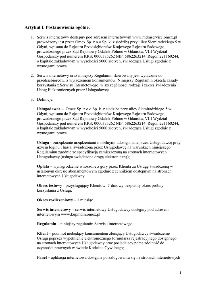 Artykuł I. Postanowienia ogólne. 1. Serwis internetowy dostępny pod adresem internetowym www.mdmservice.omex.pl prowadzony jest przez Omex Sp. z o.o Sp. k. z siedzibą przy ulicy Siemiradzkiego 5 w Gdyni, wpisana do Rejestru Przedsiębiorców Krajowego Rejestru Sadowego, prowadzonego przez Sąd Rejonowy Gdańsk Północ w Gdańsku, VIII Wydział Gospodarczy pod numerem KRS: 0000375262 NIP: 5862263214, Regon 221160244, o kapitale zakładowym w wysokości 5000 złotych, świadcząca Usługi zgodnie z wymogami prawa. 2. Serwis internetowy oraz niniejszy Regulamin skierowany jest wyłącznie do przedsiębiorców, z wyłączeniem konsumentów. Niniejszy Regulamin określa zasady korzystania z Serwisu Internetowego, w szczególności rodzaje i zakres świadczenia Usług Elektronicznych przez Usługodawcę. 3. Definicje. Usługodawca – Omex Sp. z o.o Sp. k. z siedzibą przy ulicy Siemiradzkiego 5 w Gdyni, wpisana do Rejestru Przedsiębiorców Krajowego Rejestru Sadowego, prowadzonego przez Sąd Rejonowy Gdańsk Północ w Gdańsku, VIII Wydział Gospodarczy pod numerem KRS: 0000375262 NIP: 5862263214, Regon 221160244, o kapitale zakładowym w wysokości 5000 złotych, świadcząca Usługi zgodnie z wymogami prawa. Usługa – zarządzanie urządzeniami mobilnymi udostępniane przez Usługodawcę przy użyciu loginu i hasła, świadczona przez Usługodawcę na warunkach niniejszego Regulaminu zgodnie ze specyfikacją zamieszczoną na stronach internetowych Usługodawcy (usługa świadczona drogą elektroniczną); Opłata – wynagrodzenie wnoszone z góry przez Klienta za Usługę świadczoną w ustalonym okresie abonamentowym zgodnie z cennikiem dostępnym na stronach internetowych Usługodawcy. Okres testowy - przysługujący Klientowi 7-dniowy bezpłatny okres próbny korzystania z Usługi. Okres rozliczeniowy – 1 miesiąc Serwis internetowy – serwis internetowy Usługodawcy dostępny pod adresem internetowym www.kupmdm.omex.pl Regulamin – niniejszy regulamin Serwisu internetowego, Klient – podmiot niebędący konsumentem zlecający Usługodawcy świadczenie Usługi poprzez wypełnienie elektronicznego formularza rejestracyjnego dostępnego na stronach internetowych Usługodawcy oraz posiadający pełną zdolność do czynności prawnych w świetle Kodeksu Cywilnego; Panel – aplikacja internetowa dostępna po zalogowaniu się na stronach internetowych 1 4. przepisy zawarte w niniejszym Regulaminie określają zakres i warunki korzystania z Usługi przez Klienta. 5. Zamawiając Usługę Klient oświadcza, iż akceptuje w całości niniejszy Regulamin. 6. Klient wyraża zgodę na otrzymywanie na podany przy rejestracji adres e-mail, informacji handlowych dotyczących produktów i usług Usługodawcy. 7. Usługodawca zastrzega sobie prawo do zmiany Regulaminu w dowolnym momencie. 8. Do umów zawieranych między Usługodawcą, a Klientem przepisy art. 66[1] § 1-3 Kodeksu Cywilnego nie mają zastosowania. Artykuł II. Sposób realizacji Usługi. 1. Usługa umożliwia zarządzanie urządzeniami mobilnymi takimi jak telefony komórkowe i tablety. 2. Usługa zapewnia co najmniej zlokalizowanie urządzenia mobilnego, sprawdzenie parametrów urządzenia mobilnego, blokadę urządzenia mobilnego. 3. W czasie realizacji Usługi nie są gromadzone dane podlegające Ustawie z dnia 29 sierpnia 1997 r. o ochronie danych osobowych (Dz.U. 1997 nr 133 poz. 883). 4. Wymagania techniczne niezbędne do współpracy z systemem teleinformatycznym, którym posługuje się Usługodawca: a) dostęp do Internetu (http) b) aktualna wersja wybranej przeglądarki internetowej c) zarządzane urządzenia mobilne muszą mieć dostęp do Internetu oraz zainstalowane, zgodne z nimi oprogramowanie dostępne poprzez Panel Artykuł III. Prawa i obowiązki Klienta. 1. Klient ma prawo do bezpłatnej pomocy korespondencyjnej za pomocą formularza kontaktowego znajdującego się na stronach internetowych Usługodawcy. 2. Klient zobowiązany jest do podania prawdziwych danych w trakcie zamawiania Usługi oraz aktualizacji tych danych w Panelu. 3. Klient w każdej chwili może zrezygnować z Usługi bez prawa zwrotu części Opłaty za niewykorzystany pozostały okres ważności Usługi. 4. Klient obowiązany jest do korzystania z Serwisu internetowego w sposób zgodny z prawem i dobrymi obyczajami mając na uwadze poszanowanie dóbr osobistych, ochronę danych osobowych i praw osób trzecich. Zabronione są bezprawne działania 2 mogące utrudniać funkcjonowanie Serwisu internetowego lub narazić Usługodawcę na odpowiedzialność karną lub utratę renomy. Artykuł IV. Prawa i obowiązki Usługodawcy. 1. Usługodawca zobowiązuje się do nieprzerwanego i starannego świadczenia Usługi, za którą Klient wniósł Opłatę. 2. Usługodawca nie odpowiada za zakłócenia w realizacji Usługi spowodowane nieprawidłową konfiguracją Usługi przez Klienta lub wynikające z niepoprawnego działania lub konfiguracji zarządzanych urządzeń mobilnych. 3. Usługodawca nie odpowiada za skutki spowodowane ujawnieniem przez Klienta hasła dostępowego do Panelu osobom trzecim. 4. Usługodawca zastrzega sobie prawo do zaprzestania świadczenia Usługi i zablokowania dostępu do Panelu w przypadku: a) podania przez Klienta nieprawdziwych danych w trakcie zamawiania Usługi lub później; b) skonfigurowania Usługi do zarządzania urządzeniami mobilnymi, które nie należą do klienta lub którymi z innych powodów klient nie miał prawa zarządzać; c) nie uiszczenia opłat za Usługę; d) naruszenia przez Klienta któregokolwiek z punktów niniejszego Regulaminu; 5. Usługodawca ma prawo dokonywać uaktualnień zasobów technologicznych służących do realizacji Usługi i zablokować dostęp do Panelu w soboty w godzinach nocnych (22.00 – 6.00) na czas nie dłuższy niż 2 godziny tygodniowo. 6. Usługodawca ma prawo do zablokowania Usług używanych przez Klienta niezgodnie z ich przeznaczeniem. 7. Usługodawca ma prawo do