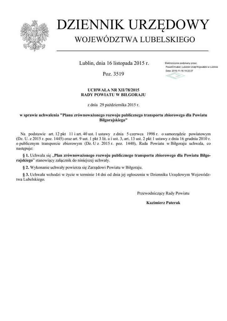 DZIENNIK URZĘDOWY WOJEWÓDZTWA LUBELSKIEGO Lublin, dnia 16 listopada 2015 r. Elektronicznie podpisany przez: Paweł Chruściel; Lubelski Urząd Wojewódzki w Lublinie Data: 2015-11-16 14:22:27 Poz. 3519 UCHWAŁA NR XII/78/2015 RADY POWIATU W BIŁGORAJU z dnia 29 października 2015 r. w sprawie uchwalenia "Planu zrównoważonego rozwoju publicznego transportu zbiorowego dla Powiatu Biłgorajskiego" Na podstawie art. 12 pkt 11 i art. 40 ust. 1 ustawy z dnia 5 czerwca 1998 r. o samorządzie powiatowym (Dz. U. z 2015 r. poz. 1445) oraz art. 9 ust. 1 pkt 3 lit. a i ust. 3, art. 13 ust. 2 pkt 1 ustawy z dnia 16 grudnia 2010 r. o publicznym transporcie zbiorowym (Dz. U z 2015 r. poz. 1440), Rada Powiatu w Biłgoraju uchwala, co następuje: § 1. Uchwala się „Plan zrównoważonego rozwoju publicznego transportu zbiorowego dla Powiatu Biłgorajskiego” stanowiący załącznik do niniejszej uchwały. § 2. Wykonanie uchwały powierza się Zarządowi Powiatu w Biłgoraju. § 3. Uchwała wchodzi w życie w terminie 14 dni od dnia jej ogłoszenia w Dzienniku Urzędowym Województwa Lubelskiego. Przewodniczący Rady Powiatu Kazimierz Paterak Dziennik Urzędowy Województwa Lubelskiego –2– Poz. 3519 Załącznik do Uchwały Nr XII/78/2015 Rady Powiatu w Biłgoraju z dnia 29 października 2015 r. Plan zrównoważonego rozwoju publicznego transportu zbiorowego dla Powiatu Biłgorajskiego Wstęp Powiat biłgorajski położony jest w południowej części województwa lubelskiego. Od zachodu sąsiaduje z powiatem niżańskim i janowskim, od północnego-zachodu z powiatem lubelskim, od północnego-wschodu z powiatem krasnostawskim, od wschodu z powiatem zamojskim, od południowego-wschodu z tomaszowskim, a od południa z powiatami lubaczowskim, leżajskim i przeworskim przynależnymi do województwa podkarpackiego. Celem planu zrównoważonego rozwoju publicznego transportu zbiorowego jest zapewnienie możliwości organizacji efektywnych przewozów o charakterze użyteczności publicznej, realizowanych na obszarze powiatu biłgorajskiego, przy zachowaniu zasad zrównoważonego rozwoju publicznego transportu zbiorowego. Bazują one na podniesieniu znaczenia mobilności komunikacyjnej dla rozwoju społeczno-gospodarczego, przy uniknięciu negatywnych skutków niekontrolowanego rozwoju transportu indywidualne- go. Dodatkowymi celami planu jest zapewnienie odpowiedniego standardu usług transportowych, poprzez: dostosowanie ich do rzeczywistych potrzeb pasażerów, jednolity system informacji pasażerskiej, redukcję negatywnego oddziaływania na środowisko, redukcję zagrożenia dla zdrowia i bezpieczeństwa mieszkańców, zwiększenie efektywności ekonomicznej transportu osób. Wychodząc z analiz zapotrzebowania na usługi transportu publicznego, jak również biorąc pod uwagę możliwości finansowe samorządu, plan zrównoważonego rozwoju publicznego transportu zbiorowego przedstawia gwarantowane standardy usług publicznego transportu zbiorowego, sposoby zarządzania nim oraz możliwości dalszego rozwoju. Dziennik Urzędowy Województwa Lubelskiego –3– Poz. 3519 Plan zrównoważonego rozwoju publicznego transportu zbiorowego dla Powiatu Biłgorajskiego został przygotowany w horyzoncie czasowym na lata 2015 – 2029. Dokument poddany został pod konsultacje społeczne, które zostały przeprowadzone w dniach 19.08.2015 – 08.09.2015. Uwzględnione zostały uzasadnione uwagi do projektu dokumentu. Zakres Planu Plan zrównoważonego rozwoju publicznego transportu zbiorowego opracowuje powiat: w zakresie linii komunikacyjnej albo sieci komunikacyjnej w powiatowych przewozach pasażerskich, a także powiat, któremu powierzono zadanie organizacji publicznego transportu zbiorowego na mocy porozumienia między powiatami, których obszar liczy łącznie co najmniej 120 000 mieszkańców — w zakresie linii komunikacyjnej albo sieci komunikacyjnej na danym obszarze. Zakres rzeczowy planu obejmuje teren powiatu biłgorajskiego, składającego się z 14 gmin. Przedmiotowo zaś niniejszy dokument obejmuje: 1) sieć komunikacyjną, na której jest planowane wykonywanie przewozów w publicznym transporcie zbiorowym, 2) ocenę i prognozy potrzeb przewozowych z uwzględnieniem lokalizacji obiektów użyteczności publicznej, gęstości zaludnienia oraz zapewnienia dostępu do transportu zbiorowego osobom niepełnosprawnym oraz osobom o ograniczonej zdolności ruchowej, 3) preferencje dotyczące wyboru rodzaju środków transportu, 4) planowaną ofertę przewozową oraz pożądany standard usług przewozowych, uwzględniający poziom jakościowy i wymagania środowiskowe usług przewozowych, 5) zasady organizacji rynku przewozów, 6) organizację systemu informacji dla pasażera, 7) przewidywane finansowanie usług przewozowych, 8) planowane kierunki rozwoju transportu publicznego. Opracowując plan uwzględniono: 1) stan zagospodarowania przestrzennego obszaru objętego planem, 2) jego sytuację społeczno-gospodarczą, 3) stan systemu transportowego i jego wpływ na środowisko, 4) potrzeby zrównoważonego rozwoju publicznego transportu zbiorowego, w tym potrzeby przewozowe osób niepełnosprawnych i osób o ograniczonej zdolności ruchowej, 5) rentowność linii komunikacyjnych. Zagadnienia przedstawione w Planie obrazują aktualną sytuację w publicznym transporcie zbiorowym w powiecie biłgorajskim, charakterystykę funkcjonującego systemu transportowego i jego infrastruktury oraz zapotrzebowanie na usługi przewozowe. Bazując na powyższej diagnozie dla powiatu biłgorajskiego określono standard komunikacyjnej obsługi pasażerów, który powinien być gwarantowany przez organizatora, zasady organizacji rynku przewozów i systemu informacji pasażerskiej oraz finansowanie publicznego transportu zbiorowego. Przedstawione propozycje kierunków rozwoju publicznego transportu zbiorowego na obszarze powiatu biłgorajskiego, mają na celu poprawę i uatrakcyjnienie tego transportu, względem tra