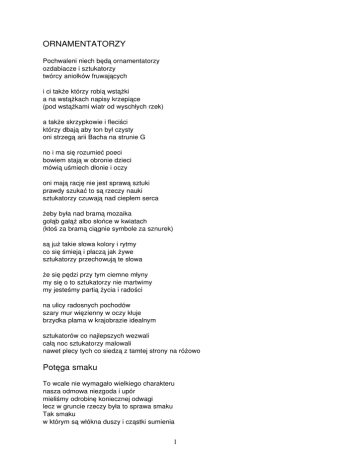 ORNAMENTATORZY Pochwaleni niech będą ornamentatorzy ozdabiacze i sztukatorzy twórcy aniołków fruwających i ci także którzy robią wstążki a na wstążkach napisy krzepiące (pod wstążkami wiatr od wyschłych rzek) a także skrzypkowie i fleciści którzy dbają aby ton był czysty oni strzegą arii Bacha na strunie G no i ma się rozumieć poeci bowiem stają w obronie dzieci mówią uśmiech dłonie i oczy oni mają rację nie jest sprawą sztuki prawdy szukać to są rzeczy nauki sztukatorzy czuwają nad ciepłem serca żeby była nad bramą mozaika gołąb gałąź albo słońce w kwiatach (ktoś za bramą ciągnie symbole za sznurek) są już takie słowa kolory i rytmy co się śmieją i płaczą jak żywe sztukatorzy przechowują te słowa że się pędzi przy tym ciemne młyny my się o to sztukatorzy nie martwimy my jesteśmy partią życia i radości na ulicy radosnych pochodów szary mur więzienny w oczy kłuje brzydka plama w krajobrazie idealnym sztukatorów co najlepszych wezwali całą noc sztukatorzy malowali nawet plecy tych co siedzą z tamtej strony na różowo Potęga smaku To wcale nie wymagało wielkiego charakteru nasza odmowa niezgoda i upór mieliśmy odrobinę koniecznej odwagi lecz w gruncie rzeczy była to sprawa smaku Tak smaku w którym są włókna duszy i cząstki sumienia 1 Kto wie gdyby nas lepiej i piękniej kuszono słano kobiety różowe płaskie jak opłatek lub fantastyczne twory z obrazów Hieronima Boscha lecz piekło w tym czasie było jakie mokry dół zaułek morderców barak nazwany pałacem sprawiedliwości samogonny Mefisto w leninowskiej kurtce posyłał w teren wnuczęta Aurory chłopców o twarzach ziemniaczanych bardzo brzydkie dziewczyny o czerwonych rękach Zaiste ich retoryka była aż nazbyt parciana (Marek Tulliusz obracał się w grobie) łańcuchy tautologii parę pojęć jak cepy dialektyka oprawców żadnej dystynkcji w rozumowaniu składnia pozbawiona urody koniunktiwu Tak więc estetyka może być pomocna w życiu nie należy zaniedbywać nauki o pięknie Zanim zgłosimy akces trzeba pilnie badać kształt architektury rytm bębnów i piszczałek kolory oficjalne nikczemny rytuał pogrzebów Nasze oczy i uszy odmówiły posłuchu książęta naszych zmysłów wybrały dumne wygnanie To wcale nie wymagało wielkiego charakteru mieliśmy odrobinę niezbędnej odwagi lecz w gruncie rzeczy była to sprawa smaku Tak smaku który każe wyjść skrzywić się wycedzić szyderstwo choćby za to miał spaść bezcenny kapitel ciała głowa Co myśli Pan Cogito o piekle Najniższy krąg piekła. Wbrew powszechnej opinii nie zamieszkują go ani despoci, ani matkobójcy, ani także ci, którzy chodzą za ciałem innych. Jest to azyl artystów pełen luster, instrumentów i obrazów. Na pierwszy rzut oka najbardziej komfortowy dział infernalny, bez smoły, ognia i tortur fizycznych. Cały rok odbywają się tutaj konkursy, festiwale i koncerty. Nie ma pełni sezonu. Pełnia jest permanentna i niemal absolutna. Co kwartał powstają nowe kierunki i nic, jak się zdaje, nie jest w stanie zahamować triumfalnego pochodu awangardy. 2 Belzebub kocha sztukę. Chełpi się, że jego chóry, jego poeci i jego malarze przewyższają już prawie niebieskich. Kto ma lepszą sztukę, ma lepszy rząd to jasne. Niedługo będą się mogli zmierzyć na Festiwalu Dwu światów. I wtedy zobaczymy, co zostanie z Dantego, Fra Angelico i Bacha. Belzebub popiera sztukę. Zapewnia swym artystom spokój, dobre wyżywienie i absolutną izolację od piekielnego życia. Dawni Mistrzowie Dawni Mistrzowie obywali się bez imion ich sygnaturą były białe palce Madonny albo różowe wieże di citta sul mare a także sceny z życia della Beata Umilita roztapiali się w sogno miracolso crocifissione znajdowali schronienie pod powieką aniołów za pagórkami obłoków w gęstej trawie raju tonęli bez reszty w złotych nieboskłonach bez krzyku przerażenia bez wołania o pamięć powierzchnię ich obrazów są gładkie jak lustro nie są to lustra dla nas są to lustra wybranych wzywam was Starzy Mistrzowie w ciężkich chwilach zwątpienia 3 sprawcie niech spadnie ze mnie wężowa łuska pychy niech pozostanę głuchy na pokuszenie sławy wzywam was Dawni Mistrzowie Malarzu Deszczu Manny Malarzu Drzew Haftowanych Malarzu Nawiedzenia Malarzu Świętej Krwi 4