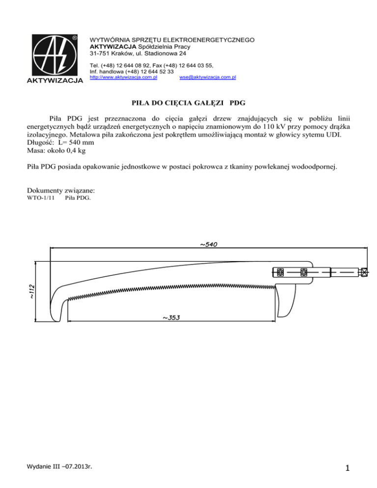 WYTWÓRNIA SPRZĘTU ELEKTROENERGETYCZNEGO AKTYWIZACJA Spółdzielnia Pracy 31-751 Kraków, ul. Stadionowa 24 Tel. (+48) 12 644 08 92, Fax (+48) 12 644 03 55, Inf. handlowa (+48) 12 644 52 33 http://www.aktywizacja.com.pl [email protected] PIŁA DO CIĘCIA GAŁĘZI PDG Piła PDG jest przeznaczona do cięcia gałęzi drzew znajdujących się w pobliżu linii energetycznych bądź urządzeń energetycznych o napięciu znamionowym do 110 kV przy pomocy drążka izolacyjnego. Metalowa piła zakończona jest pokrętłem umożliwiającą montaż w głowicy sytemu UDI. Długość: L= 540 mm Masa: około 0,4 kg Piła PDG posiada opakowanie jednostkowe w postaci pokrowca z tkaniny powlekanej wodoodpornej. Dokumenty związane: WTO-1/11 Piła PDG. Wydanie III –07.2013r. 1