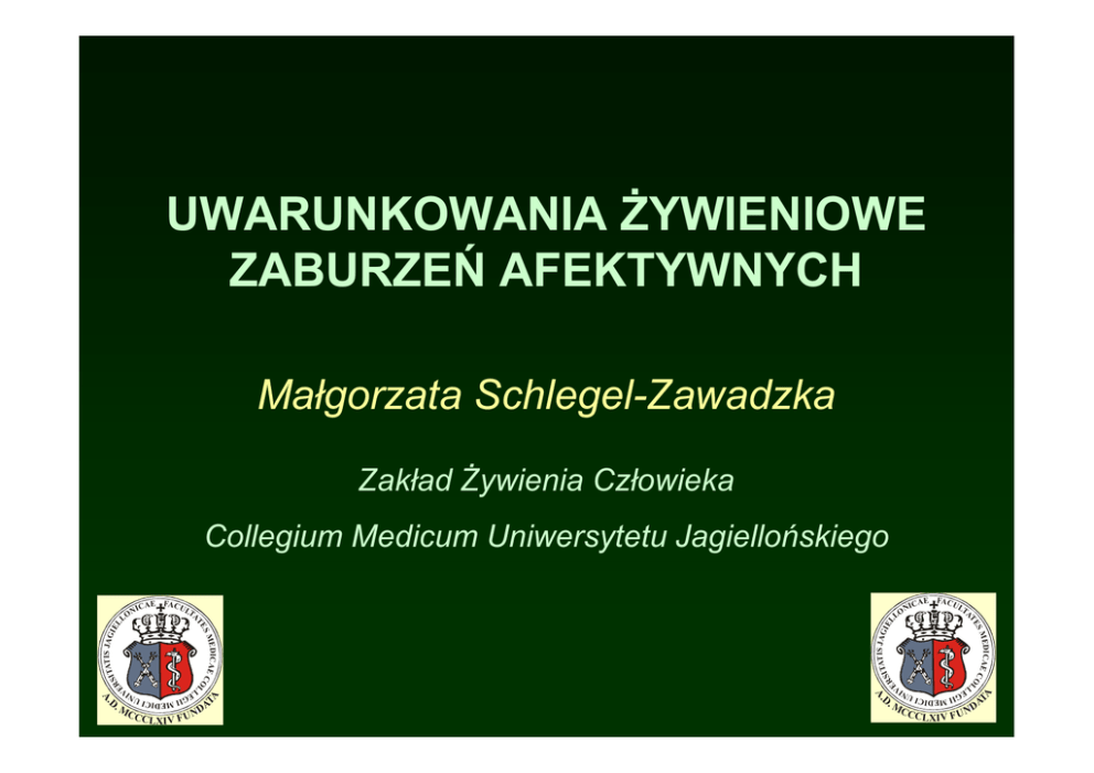 UWARUNKOWANIA śYWIENIOWE ZABURZEŃ AFEKTYWNYCH Małgorzata Schlegel-Zawadzka Zakład śywienia Człowieka A ER ATIS JA GI EL SI T LT A NI V T MC DA CCLXI V F U N E D IC I U .D . A A E FACU OL OL G LE ER CA NI E D I CA E C E D I CA E C II M NI V T MC DA CCLXI V F U N LO SM SM E D IC I U A .D . LT A II M E FACU G LE CA NI TE LO TE ATIS JA GI EL SI T Collegium Medicum Uniwersytetu Jagiellońskiego Vincent van Gogh – „Jedzący kartofle”, 1885, Rijksmuseum Van Gogh, Amsterdam MSZ Vincent van Gogh – „Słoneczniki”, 1888, Neue Pinakothek, Monachium MSZ Śniadanie wioślarzy – Renoir 1881 MSZ Choroby afektywne – pojęcie niejednoznaczne zaburzenia zachowań Główne objawy – zaburzenia nastroju, emocji i aktywności I. Zaburzenia afektywne jednobiegunowe - depresje II. Zaburzenia afektywne dwubiegunowe – depresyjno-maniakalne, schizoafektywne Charakteryzują się nawrotami obniŜenia nastroju, spadkiem energii i aktywności, naprzemiennie z podwyŜszeniem nastroju, wzmoŜonej energii oraz aktywności. MSZ 2 systemy kwalifikacyjne: DSM – IV – klasyfikacja Amerykańskiego Towarzystwa Psychiatrycznego IV wersja 1994 r. ICD – 10 – Wersja Międzynarodowej Klasyfikacji Chorób – WHO 1993 r. MSZ Depresja to cięŜkie schorzenie psychiczne prowadzące w znacznym procencie przypadków do samobójczej śmierci chorego. Choroby o cięŜkim przebiegu wywołujące cierpienia i będące przyczyną przedwczesnej umieralności i kalectwa na świecie. • • • • • • ZakaŜenia dolnych dróg oddechowych. Choroby biegunkowe. Zaburzenia okołoporodowe. Depresja. Choroba niedokrwienna serca. Choroby naczyń mózgowych. WHO – w 2020 r. depresja na drugim miejscu. MSZ Wg DSM IV kryteria rozpoznawania duŜej depresji Współwystępowanie w tym samym czasie przynajmniej 5 spośród wymienionych niŜej objawów (w tym nastroju depresyjnego lub/i spadku zainteresowania lub satysfakcji z wykonywanych czynności) Objawy te utrzymują się przez co najmniej dwa tygodnie. MSZ Wg DSM IV kryteria rozpoznawania duŜej depresji A. Nastrój depresyjny – Czuję się przygnębiony. B. Spadek zainteresowań – Nic nie daje mi przyjemności. 1. Poczucie winy i małej wartości – Wszystko jest z mojej winy. 2. Pobudzenie lub zahamowanie psychoruchowe – Poruszam się z trudnością. 3. Zmęczenie – Czuję się zmęczony. 4. Zaburzenie apetytu – Nie mam przyjemności w jedzeniu. 5. Zaburzenie w koncentracji – Nie mogę się skoncentrować. 6. Zaburzenia w spaniu – Mam problemy w zasypianiu. 7. Myśli i tendencje samobójcze – śycie jest okrutne dla mnie. MSZ Mania lub stan maniakalny jest zaburzeniem afektywnym, będącym przeciwieństwem depresji. Charakteryzuje się uczuciem podwyŜszonego nastroju i wzmoŜonym poczuciem własnej wartości oraz przesadną oceną swoich rzeczywistych moŜliwości. Aktywność ruchowa jest wzmoŜona, towarzyszy jej poczucie niespoŜytej energii i braku męczliwości. Chorzy podejmują liczne pochopne działania, dąŜąc do natychmiastowej realizacji pomysłów, np. zbędne zakupy, przypadkowe podróŜe. Przeszkody ze strony otoczenia powodują rozdraŜnienie oraz agresję słowną lub fizyczną. MSZ Liczba samobójstw pacjentów chorych na depresję - 70% Leki przeciwdepresyjne - skuteczność u 60% pacjentów MSZ 2,5 1,88 2,02 1,68 2 W artości % 1,45 1,5 1 0,398 0,456 0,461 0,498 0,5 0 1 1990 2 1995 1998/97 1999/98 1 – osoby zarejestrowane w poradniach zdrowia psychicznego. 2 - nowo zarejestrowane zachorowania na zaburzenia psychiczne i zaburzenia zachowania. (GUS) MSZ Depresja – powikłanie niektórych innych schorzeń układu nerwowego depresja po udarze mózgu w przebiegu choroby Parkinsona Alzheimera stwardnienia rozsianego Depresja - powikłania schorzeń somatycznych choroby narządu krąŜenia narządów miąŜszowych choroby układowe nowotwory zaburzenia hormonalne nieuleczalne choroby przewlekłe MSZ Powikłania farmakoterapii leki hipotensyjne (np. Rezerpina)* neuroleptyki (np. Chloropromazyna) antagoniści kanału wapniowego (np. Werapamil) leki o działaniu dopaminergicznym (np. L-dopa) Wydarzenia Ŝyciowe i sytuacje utrata osób bliskich izolacja społeczna zły stan finansowy zmiana miejsca pobytu MSZ Schorzenia ośrodkowego układu nerwowego jako przyczyny depresji (PuŜyński,1996) Procesy zwyrodnieniowo-zanikowe mózgu choroba Alzheimera pląsawica Huntingtona zwyrodnienie wątrobowo-soczewkowe choroba Parkinsona stwardnienie rozsiane Guzy mózgu, zwłaszcza płata czołowego Choroby naczyniowe mózgu miaŜdŜyca naczyń mózgowych niewydolność krąŜenia mózgowego stany poudarowe krwiak nadoponowy, podtwardówkowy Padaczka, zwłaszcza ognisko o płacie skroniowym Stany pourazowe, zwłaszcza uszkodzenie płata skroniowego płatów czołowych Inne schorzenia - wodogłowie, defekty genetyczne MSZ Śmiertelność chorych z depresją po przebyciu zawału mięśnia sercowego w ciągu 6 miesięcy od opuszczenia szpitala MSZ (Frasure-Smith i wsp. 1993). Niedobory białkowo-energetyczne Nie powodują zaniku tkanki nerwowej, ale głównie opóźnienie jej rozwoju. Zredukowane: mokra i sucha masa mózgu; zawartość białka ogółem; RNA; całkowity cholesterol; fosfolipidy; DNA. Słaby rozwój móŜdŜku i hipokampa. MSZ ZAWARTOŚĆ PIERWIASTKÓW W LUDZKIEJ TKANCE MÓZGOWEJ µg / 100 g Magnez Wapń śelazo Cynk Miedź Glin Mangan Chrom Ołów Cyna Kobalt Rtęć 13 800 8 000 6 500 1 300 400 47 26 13 <10 <6 0,9 1,8 MSZ Klasyfikacja pierwiastków (II, III) w centralnym systemie nerwowym wg ich wartości Ŝywieniowej i toksycznej Niezbędne dla mózgu Prawdopodobnie Toksyczne niezbędne dla mózgu Wapń Magnez śelazo Miedź Cynk Mangan Kobalt Molibden Chrom Nikiel Cyna Wanad za Smith, 1990 Ołów Rtęć Glin Kadm Arsen Niska toksyczność: nieznany status Bar German Srebro Stront Tytan Cyrkon Bizmut Gal Złoto Ind Tal MSZ Uran Zn i Mg a receptor NMDA (receptor glutaminianergiczny) Receptor NMDA – nazwa od specyficznego agonisty