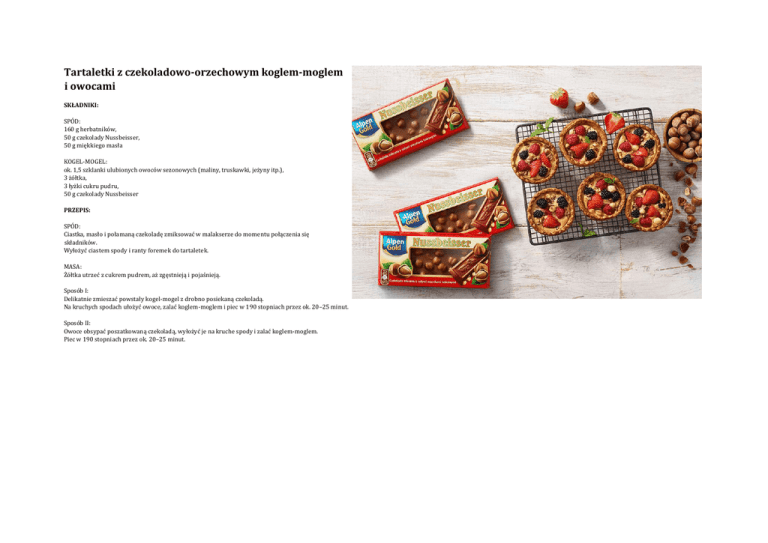 Tartaletki z czekoladowo-orzechowym koglem-moglem i owocami SKŁADNIKI: SPÓD: 160 g herbatników, 50 g czekolady Nussbeisser, 50 g miękkiego masła KOGEL-MOGEL: ok. 1,5 szklanki ulubionych owoców sezonowych (maliny, truskawki, jeżyny itp.), 3 żółtka, 3 łyżki cukru pudru, 50 g czekolady Nussbeisser PRZEPIS: SPÓD: Ciastka, masło i połamaną czekoladę zmiksować w malakserze do momentu połączenia się składników. Wyłożyć ciastem spody i ranty foremek do tartaletek. MASA: Żółtka utrzeć z cukrem pudrem, aż zgęstnieją i pojaśnieją. Sposób I: Delikatnie zmieszać powstały kogel-mogel z drobno posiekaną czekoladą. Na kruchych spodach ułożyć owoce, zalać koglem-moglem i piec w 190 stopniach przez ok. 20–25 minut. Sposób II: Owoce obsypać poszatkowaną czekoladą, wyłożyć je na kruche spody i zalać koglem-moglem. Piec w 190 stopniach przez ok. 20–25 minut.