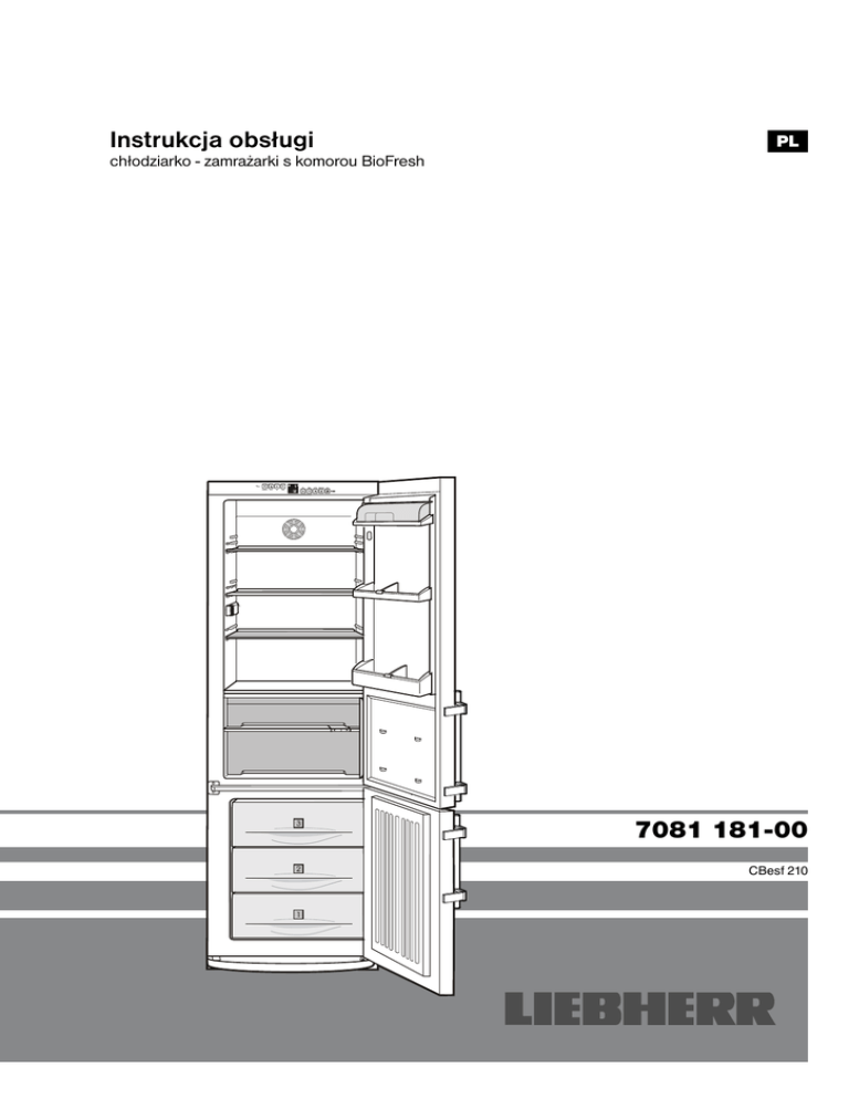 Instrukcja obsługi PL chłodziarko - zamrażarki s komorou BioFresh 7081 181-00 CBesf 210 CZ 11 Wskazówka dot. usuwania odpadów Opakowanie produkowane jest z materiałów nadających się do ponownego użycia. - tektury falistej/tektury - elementów z piankowanego polistyrenu - z folii polietylenowych - taśm bindujących z polipropylenu • Nie wolno dopuszczać, aby dzieci bawiły się materiałami opakowaniowymi - niebezpieczeństwo uduszenia pod folią! • Opakowanie należy dostarczyć do oficjalnego skupu makulatury. Urządzenie wyłączone z użytkowania: zawiera nadal wartościowe materiały i nie powinna być wyrzucana razem z innymi, nie sortowanymi odpadami osiedlowymi. • Unieruchomić zużyte urządzenie. Wyciągnąć wtyczkę, przeciąć kabel przyłączeniowy i zabezpieczyć zamek, aby dzieci nie mogły się zamknąć we wnętrzu urządzenia. • Należy zwrócić uwagę na to, aby podczas odtransportowywania zużytego urządzenia nie uszkodzić układu obiegu czynnika chłodniczego. • Dane zastosowanego czynnika chłodniczego znajdują się na tabliczce znamionowej. • Zagospodarowanie zużytych urządzeń w ramach systemu utylizacji winno nastąpić w sposób fachowy, zgodnie z lokalnie obowiązującymi przepisami i uregulowaniami prawnymi. Przeznaczenie W Urządzenie jest przystosowane do pracy w określonym przedziale temperatur otoczenia zgodnie z klasą klimatyczna podaną na tabliczce znamionowej. Granice temperatur dla danej klasy klimatycznej nie powinny być przekraczane: Klasa klimatyczna Przedział temperatur __________________________________________________ SN +10 °C do +32 °C N +16 °C do +32 °C ST +16 °C do +38 °C T +16 °C do +43 °C Urz¹dzenie jest zgodne z odnośnymi przepisami bezpieczeństwa oraz z Dyrektywami UE 2004/108/WE i 2006/95/WE. Zakres zastosowania urządzenia Urządzenie jest przeznaczone wyłącznie do chłodzenia produktów spożywczych. W przypadku wykorzystania do chłodzenia produktów spożywczych w związku z prowadzoną działalnością gospodarczą, przestrzegać obowiązujących norm i przepisów prawnych. Urządzenie nie jest przeznaczone do przechowywania i chłodzenia leków, plazmy krwi, preparatów laboratoryjnych oraz innych materiałów i produktów wymienianych w dyrektywie dotyczącej produktów medycznych 2007/47/EG. Użytkowanie urządzenia niezgodne z przeznaczeniem może doprowadzić do uszkodzenia lub zepsucia przechowywanych towarów. Ponadto urządzenie nie jest przeznaczone do pracy w obszarach zagrożonych wybuchem. Charakterystyka urządzenia i wyposażenia elementy obsługi i kontroli pojemnik na masło i sery regulowana półka Przekładana pó³eczka na drzwiach oświetlenie wewnętrzne półki na drzwiach (na duże butelki) szuflady na suchą lub opakowaną żywność szuflady z regulacją wilgotności na warzywa i owoce tabliczka znamionowa szuflady regulowane nóżki z przodu kółka z tyłu, uchwyty transportowe 12 PL Wskazówki bezpieczeñstwa i ostrze¿enia Wskazówki dotyczące ustawienia W Lodówka powinna być transportowana w opakowaniu przy udziale dwóch osób. W Zastosowane chłodziwo R 600a jest przyjazne dla środowiska, ale łatwopalne. W Nie wolno uszkodzić przewodów chłodziwa. Chłodziwo w przypadku wydostania się na zewnątrz może spowodować uszkodzenia oczu lub ulec samozapaleniu. WJeśli dojdzie do wydostania się chłodziwa na zewnątrz należy jak najszybciej usunąć źródła iskrzenia, nie zbliżać się z otwartym płomieniem, wyciągnąć wtyczkę z sieci, a pomieszczenie dokładnie przewietrzyć. WEwentualne uszkodzenia lodówki stwierdzone przed podłączeniem do sieci zgłosić do dostawcy. WDla zapewnienia sprawnego funkcjonowania lodówkę należy podłączać i montować zgodnie z zaleceniami instrukcji obsługi. W W przypadku awarii lodówkę wyłączyć z sieci: wyciągnąć wtyczkę z gniazdka (nie wolno ciągnąć za przewód, lecz za wtyczkę) lub wyłączyć bezpiecznik. W Naprawy i modyfikacje mogą być dokonywane tylko przez uprawnione punkty serwisowe. Niefachowe naprawy i inne czynności grożą niebezpieczeństwem dla użytkownika. Dotyczy to również wymiany przewodu przyłączeniowego. W Nie wolno przechowywać w lodówce materiałów wybuchowych lub pojemników typu „spray” z gazami łatwopalnymi jak np. propan, butan, pentan itp. Wydzielające się gazy mogą ulec zapłonowi od części elektrycznych lodówki. Pojemniki takie można rozpoznać po nadruku określającym zawartość lub nadruku ostrzegawczym (symbol płomienia). W Wysokoprocentowe alkohole przechowywać szczelnie zamknięte w pozycji pionowej. W Nie wolno operować wewnątrz lodówki otwartym płomieniem lub źródłem iskrzenia. W Nie używać we wnętrzu lodówki urządzeń elektrycznych (np. do czyszczenia parą, grzejników, wytwornic lodu itp.) W Nie używać szuflad, podstawy ani drzwi jako stopni do wchodzenia. W Urządzenie to nie jest przeznaczone do użytkowania przez osoby upośledzone fizycznie lub umysłowo, a także przez osoby z upośledzeniami zmysłów (ale także przez dzieci), nie dysponujące dostatecznym doświadczeniem i wiedzą, chyba, że zostaną one przyuczone i w pierwszym okresie użytkowania będą nadzorowane przez osobę odpowiedzialną za ich bezpieczeństwo. Dzieci nie należy pozostawiać bez opieki, aby zapewnić, że urządzenie nie będzie przedmiotem zabawy. WNależy unikać przedłużonego kontaktu skóry z zimnymi powierzchniami lub oziębionymi/zamrożonymi produktami. Może to być przyczyną bólu, utraty czucia skórnego oraz odmrożeń. W przypadku długotrwałego kontaktu ze skórą należy stosować odpowiednie środki ochronne, np. rękawice. W Nie wolno spożywać lodów lub kostek lodu bezpośrednio po wyjęciu z zamrażarki. Z powodu bardzo niskiej temperatury może wystąpić tzw. efekt poparzenia. W Nie wolno spożywać przeterminowanych, zbyt długo przechowywanych produktów spożywczych – grozi to zatruciem. W Urz