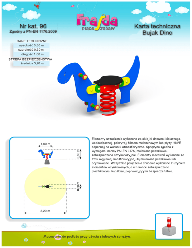 Karta techniczna Bujak Dino Nr kat. 96 Zgodny z PN-EN 1176:2009 DANE TECHNICZNE wysokość 0,80 m szerokość 0,30 m długość 1,00 m STREFA BEZPIECZEŃSTWA średnica 3,20 m 0,30 m 0,80 m 1,00 m Elementy urządzenia wykonane ze sklejki drewna liściastego, wodoodpornej, pokrytej filmem melaminowym lub płyty HDPE odpornej na warunki atmosferyczne. Sprężyna zgodna z wymogami normy PN-EN 1176, malowana proszkowo, zabezpieczona antykorozyjnie. Elementy mocowań wykonane ze stali węglowej konstrukcyjnej są malowane proszkowo lub ocynkowane. Wszystkie połączenia śrubowe wykonane z użyciem elementów ocynkowanych, a ich końce zabezpieczone plastikowymi kapslami, poprawiającymi bezpieczeństwo. 3,20 m Mocowanie do podłoża przy użyciu stalowych sprężyn.