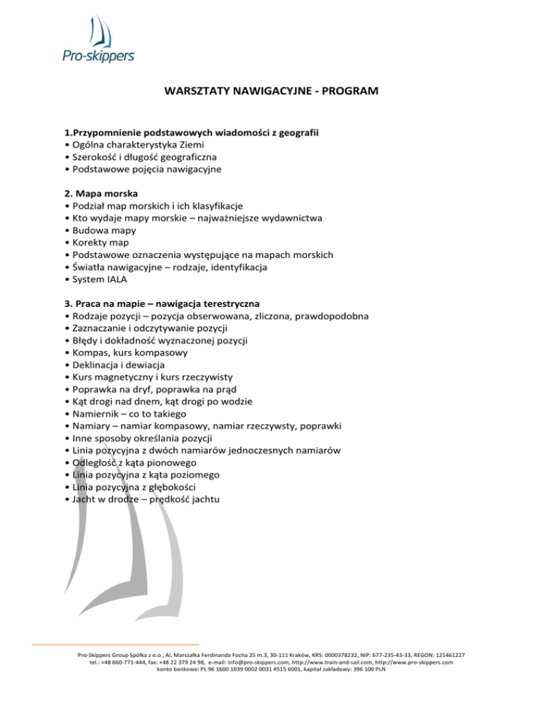 WARSZTATY NAWIGACYJNE - PROGRAM 1.Przypomnienie podstawowych wiadomości z geografii • Ogólna charakterystyka Ziemi • Szerokość i długość geograficzna • Podstawowe pojęcia nawigacyjne 2. Mapa morska • Podział map morskich i ich klasyfikacje • Kto wydaje mapy morskie – najważniejsze wydawnictwa • Budowa mapy • Korekty map • Podstawowe oznaczenia występujące na mapach morskich • Światła nawigacyjne – rodzaje, identyfikacja • System IALA 3. Praca na mapie – nawigacja terestryczna • Rodzaje pozycji – pozycja obserwowana, zliczona, prawdopodobna • Zaznaczanie i odczytywanie pozycji • Błędy i dokładność wyznaczonej pozycji • Kompas, kurs kompasowy • Deklinacja i dewiacja • Kurs magnetyczny i kurs rzeczywisty • Poprawka na dryf, poprawka na prąd • Kąt drogi nad dnem, kąt drogi po wodzie • Namiernik – co to takiego • Namiary – namiar kompasowy, namiar rzeczywsty, poprawki • Inne sposoby określania pozycji • Linia pozycyjna z dwóch namiarów jednoczesnych namiarów • Odległość z kąta pionowego • Linia pozycyjna z kąta poziomego • Linia pozycyjna z głębokości • Jacht w drodze – prędkość jachtu Pro-Skippers Group Spółka z o.o., Al. Marszałka Ferdinanda Focha 25 m.3, 30-111 Kraków, KRS: 0000378232, NIP: 677-235-43-33, REGON: 121461227 tel.: +48 660-771-444, fax: +48 22 379 24 98, e-mail: [email protected], http://www.train-and-sail.com, http://www.pro-skippers.com konto bankowe: PL 96 1600 1039 0002 0031 4515 6001, kapitał zakładowy: 396 100 PLN 4. Nawigacja na wodach pływowych • Definicja pływu • Jak powstają pływy • Rodzaje pływów • Pływ kwadraturowy i syzygijny • Tablice pływów • Wysokości wody na mapie, porty standardowe i dołączone • Jacht w drodze na wodach pływowych • Kurs i prędkość jachtu po uwzględnieniu prądu – „rombiki” 5. Nawigacja satelitarna z użyciem GPS • Teoretyczne podstawy nawigacji satelitarnej • System WGS-84 • GPS w praktyce • Systemy alternatywne dla GPS 6. Nawigacja meteorologiczna • Znaczenie prognozy pogody podczas planowania trasy • Prognoza krótkoterminowa i długoterminowa • Źródła prognozy pogody • Rodzaje prognoz pogody • Mapy synoptyczne – układ wyżów i niżów • Skala Beauforta • Bryza dzienna i nocna • Jak sobie radzić przy silnym wietrze • Sztorm – jak go uniknąć, metody sztormowania • Mgła – jak się w niej odnaleźć • Sposoby przewidywania pogody na podstawie własnych obserwacji • Planowanie trasy w oparciu o pogodę, prądy pływowe i akwen Omawiane zagadnienia obrazowane są przykładami oraz utrwalane ćwiczeniami. Pro-Skippers Group Spółka z o.o., Al. Marszałka Ferdinanda Focha 25 m.3, 30-111 Kraków, KRS: 0000378232, NIP: 677-235-43-33, REGON: 121461227 tel.: +48 660-771-444, fax: +48 22 379 24 98, e-mail: [email protected], http://www.train-and-sail.com, http://www.pro-skippers.com konto bankowe: PL 96 1600 1039 0002 0031 4515 6001, kapitał zakładowy: 396 100 PLN