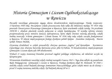 Historia Gimnazjum i Liceum Ogólnokształcącego w Rawiczu Początki rawickiego gimnazjum sięgają okresu dwudziestolecia międzywojennego. Naukę rozpoczęto 15 kwietnia 1920 roku. Początkowo szkoła przeznaczona była tylko dla młodzieży męskiej. W 1924 roku powstało Towarzystwo Prywatnego Gimnazjum w Rawiczu, które uruchomiło szkołę żeńską. Na przełomie 1929/30 r. obydwie placówki zostały połączone w szkołę koedukacyjną. W wyniku reformy oświaty przeprowadzonej przez ministra Janusza Jędrzejewicza, która objęła również rawicką placówkę, szkołę średnią tworzyły: 4-letnie gimnazjum i 2-letnie liceum. W 1936 roku taka szkoła zaczęła funkcjonować w Rawiczu. W okresie międzywojennym funkcję dyrektora pełnili kolejno: Stanisław Sutkowski, Marcin Gołąb, Tomasz Maślak. Ożywioną działalność w szkole prowadziły: drużyna sportowa „Sagitta” pod kierunkiem Kazimierza Cepurskiego oraz drużyna harcerska kierowana przez phm K.Fabisia. W dwudziestoleciu międzywojennym Gimnazjum i Liceum ukończyło 309 absolwentów. Wybuch II wojny światowej brutalnie przerwał ciągłość polskiego szkolnictwa, ale młodzież uczyła się konspiracyjnie. Wznowienie działalności rawickiej szkoły średniej nastąpiło 8 marca 1945 r. Tego dnia odbyło się posiedzenie Rady Pedagogicznej Gimnazjum i Liceum w Rawiczu. Funkcję dyrektora objął M. Heimrath. W 1948 r. siedzibą szkoły został budynek dawnego Seminarium Nauczycielskiego, gdzie szkoła mieści się do dzisiaj – przed II wojną światową siedzibą szkoły był budynek obecnej SP nr 3. W roku szkolnym 1948/49 dokonano reformy systemu szkolnictwa, która polegała na stworzeniu jednolitej szkoły stopnia podstawowego i licealnego. Jedenastoletnia szkoła ogólnokształcąca obejmowała 7-letnią obowiązkową szkołę powszechną i 4-letnie liceum, oparte na zasadzie dobrowolności. W pierwszych latach po wojnie funkcję dyrektora pełnili kolejno: M. Heimrath, T. Maślak, K. Jankowska. Wprowadzenie bezpłatnego nauczania oraz migracje ludności powodowały zwiększenie się liczby uczniów, w tym pochodzących z okolic Rawicza. W trosce o dobro młodzieży uruchomiono internat w budynku dawnej szkoły niemieckiej przy obecnej ulicy Wały Jarosława Dąbrowskiego 2. W latach sześćdziesiątych, przy stałym wzroście liczby uczniów i tych samych warunkach lokalowych, utrzymanie szkoły stopnia podstawowego i licealnego okazało się niemożliwe. Z początkiem roku szkolnego 1964/65 dokonano oddzielenia klas podstawowych od licealnych. Klasy podstawowe przeniesiono do Szkoły Podstawowej nr 4. Licea, w tym rawickie, rozpoczęły realizację własnego programu na podbudowie 8-letniej szkoły podstawowej. Dyrektorem Liceum w Rawiczu była wówczas mgr Krystyna Jankowska. Dynamiczne zmiany zaszły w latach siedemdziesiątych. W roku szkolnego 1973/74 dyrektorem Liceum Ogólnokształcącego został mgr Eugeniusz Kopczyński. Ten rok, okazał się szczytowym pod względem liczby uczniów. Uczęszczało wówczas do szkoły 735 uczniów i pracowało 36 nauczycieli. Poziom wyposażenia szkoły w pomoce i środki dydaktyczne był na tyle wystarczający, że umożliwił wprowadzenie nauczania w klasach profilowanych. Dodatkowo młodzież mogła rozwijać się poprzez uczestnictwo w zajęciach kół przedmiotowych oraz pracę w różnych organizacjach. Ważną rolę w rozwoju kultury szkolnej spełniała „Koniugacja”. Nazwę tę przyjęła najpierw Grupa Teatralna prowadzona wspólnie przez Mariana Przybyła i Henryka Pawłowskiego, później – zespoły poezji śpiewanej, grupa redakcyjna, obecnie – stowarzyszenie Ruch Artystyczny „Koniugacja”. Wytężona praca nauczycieli i uczniów przełożyła się na sukcesy odniesione w Olimpiadzie Literatury i Języka Polskiego, Astronomicznej, Artystycznej i Języka Francuskiego. Nowością pracy wychowawczej rawickiego liceum stał się udział w pracach UNESCO, agendy ONZ do spraw oświaty, nauki i kultury. W 1980 r. odbyła się uroczystość nadania szkole imienia połączona z obchodami 60-lecia jej funkcjonowania. Pod koniec lat siedemdziesiątych, w związku z zapowiedzianą reformą i niżem demograficznym, władze oświatowe zalecały tworzenie zespołów szkół ogólnokształcących. Taki zespół powstał 01 sierpnia 1980 roku również w Rawiczu. Obejmował 16 klas Liceum Ogólnokształcącego i 9 klas Szkoły Podstawowej nr 6. Obowiązki dyrektora nowej placówki objął dotychczasowy dyrektor liceum - mgr Eugeniusz Kopczyński. W latach osiemdziesiątych, mimo trudności z jakimi borykało się polskie szkolnictwo, determinacja dyrekcji i nauczycieli przyczyniła się do efektywnej realizacji programu dydaktycznego, czego wyrazem były m.in. sukcesy w Olimpiadzie Biologicznej. Dnia 27 kwietnia 1985 roku odbyła się w Liceum Ogólnokształcącym doniosła uroczystość wręczenia szkole sztandaru. W roku 1989 dokonały się w naszym kraju wielkie zmiany polityczne i społeczne, które nie pozostały bez wpływu na rozwój szkolnictwa. Pod kierunkiem dyrekcji szkoły, najpierw mgr Andrzeja Maya, następnie mgr Barbary Igielskiej i mgr Piotra Domanieckiego wprowadzono nowe rozwiązania - m.in. w miejsce dotychczas obowiązujących profili kształcenia wprowadzono zajęcia fakultatywne, wybierane przez uczniów w trzecim i czwartym roku nauki. Do zadań stałych realizowanych w liceum należały wykłady pracowników naukowych wyższych uczelni, udział młodzieży w konkursach i imprezach proponowanych przez UNESCO oraz olimpiadach. Rezultatem tych działań były wysokie wyniki osiągane przez uczniów w pracy lekcyjnej oraz sukcesy w Olimpiadzie Języka Rosyjskiego, Historycznej, Wiedzy o Polsce i Świecie Współczesnym, Biologicznej oraz licznych konkursach przedmiotowych, tematycznych i artystycznych. 31 sierpnia 1991 r. nastąpiła likwidacja Zespołu Szkół Ogólnokształcących w Rawiczu i od 1 1 września ponownie zaczęły f