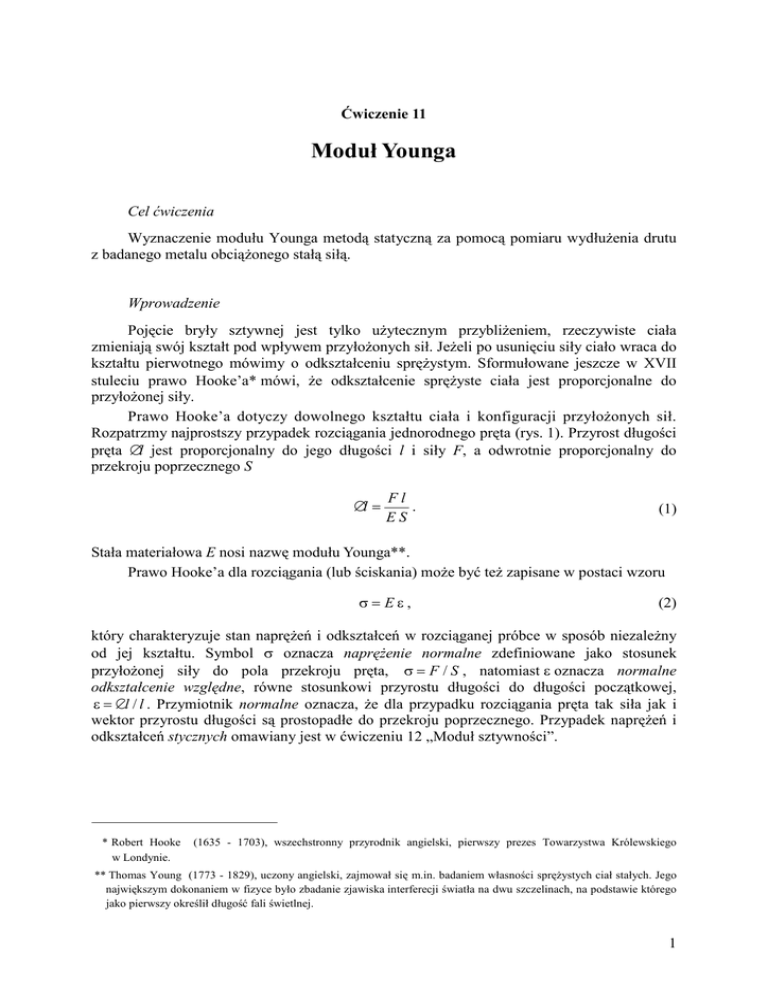 Ćwiczenie 11 Moduł Younga Cel ćwiczenia Wyznaczenie modułu Younga metodą statyczną za pomocą pomiaru wydłużenia drutu z badanego metalu obciążonego stałą siłą. Wprowadzenie Pojęcie bryły sztywnej jest tylko użytecznym przybliżeniem, rzeczywiste ciała zmieniają swój kształt pod wpływem przyłożonych sił. Jeżeli po usunięciu siły ciało wraca do kształtu pierwotnego mówimy o odkształceniu sprężystym. Sformułowane jeszcze w XVII stuleciu prawo Hooke’a* mówi, że odkształcenie sprężyste ciała jest proporcjonalne do przyłożonej siły. Prawo Hooke’a dotyczy dowolnego kształtu ciała i konfiguracji przyłożonych sił. Rozpatrzmy najprostszy przypadek rozciągania jednorodnego pręta (rys. 1). Przyrost długości pręta ∆l jest proporcjonalny do jego długości l i siły F, a odwrotnie proporcjonalny do przekroju poprzecznego S ∆l = Fl . ES (1) Stała materiałowa E nosi nazwę modułu Younga**. Prawo Hooke’a dla rozciągania (lub ściskania) może być też zapisane w postaci wzoru σ= Eε, (2) który charakteryzuje stan naprężeń i odkształceń w rozciąganej próbce w sposób niezależny od jej kształtu. Symbol σ oznacza naprężenie normalne zdefiniowane jako stosunek przyłożonej siły do pola przekroju pręta, σ = F / S , natomiast ε oznacza normalne odkształcenie względne, równe stosunkowi przyrostu długości do długości początkowej, ε = ∆l / l . Przymiotnik normalne oznacza, że dla przypadku rozciągania pręta tak siła jak i wektor przyrostu długości są prostopadłe do przekroju poprzecznego. Przypadek naprężeń i odkształceń stycznych omawiany jest w ćwiczeniu 12 „Moduł sztywności”. * Robert Hooke w Londynie. (1635 - 1703), wszechstronny przyrodnik angielski, pierwszy prezes Towarzystwa Królewskiego ** Thomas Young (1773 - 1829), uczony angielski, zajmował się m.in. badaniem własności sprężystych ciał stałych. Jego największym dokonaniem w fizyce było zbadanie zjawiska interferecji światła na dwu szczelinach, na podstawie którego jako pierwszy określił długość fali świetlnej. 1 Rys. 1. Charakterystyka rozciągania typowa dla większości metali. Znaczenie punktów A-D i symboli σm i σs objaśniono w tekście. Wstawka pokazuje wygląd próbki wykorzystywanej w profesjonalnej aparaturze do badania pełnej zależności σ ( ε) Wartość modułu Younga można by określić jako naprężenie, przy którym długość rozciąganego ciała ulega podwojeniu. W rzeczywistości prawo Hooke’a przestaje obowiązywać (może za wyjątkiem gumy) przy znacznie mniejszych odkształceniach. Rysunek 1 pokazuje doświadczalną zależność naprężenie – odkształcenie typową dla większości metali. (Uwaga: zgodnie ze zwyczajem przyjętym w inżynierii materiałowej naprężenie σ jest odkładane na osi pionowej, a odkształcenie − na poziomej). Na krzywej σ(ε) odcinek liniowy kończy się na tzw. granicy proporcjonalności (punkt A na rys. 1). Po przekroczeniu granicy sprężystości (punkt B) rozpoczyna się nieodwracalne odkształcenie materiału. Wreszcie po przekroczeniu maksymalnego naprężenia (punkt C) materiał ulega zerwaniu (punkt D). W przypadku materiałów określonych jako kruche przebieg rozciągania jest prostszy – prawo Hooke’a obowiązuje do określonego naprężenia, po przekroczeniu którego materiał pęka. Wartości modułu Younga i przybliżone wartości naprężenia σs odpowiadającego granicy sprężystości podano w tabeli 1. W ćwiczeniu badamy tylko początkową część zależności liniowej σ( ε) , nie przekraczając naprężenia maksymalnego σm (rys. 1), znacznie mniejszego od σs . Wy z n a c z e n i e m o d u ł u Yo u n g a m e t o d ą s t a t y c z n ą Zastosowana metoda polega na bezpośrednim pomiarze wielkości wchodzących do wzoru definicyjnego (1). Do pomiarów skonstruowano statyw (rys. 2), do którego przymocowuje się badany drut w górnym uchwycie A. Drugi koniec drutu uchwytem B połączono sztywno z szalką znajdującą się poniżej poprzeczki statywu. Średnicę drutu mierzymy mikrometrem. 2 Rys. 2. Urządzenie do pomiaru modułu Younga metodą statyczną Do pomiaru wydłużenia drutu wykorzystano czujnik mikrometryczny D (niepewność pomiaru 0,01 mm), sprzężony z badanym prętem przy użyciu dźwigni C. Dźwignia podpiera się na wsporniku związanym sztywno ze statywem. Pręt i szalka zamocowane są w połowie odległości między osią obrotu a punktem styku z czujnikiem. Wydłużenie drutu ∆l jest zatem dwukrotnie mniejsze od wartości wskazywanej przez czujnik. Badany drut powinien być prosty. Siła F rozciągająca drut jest siłą ciężkości odważników o masie m. Zatem F = m g, gdzie g = 9,81 m/s2 jest przyspieszeniem ziemskim. Zgodnie z prawem Hooke’a zależność ∆l(F) winna być linią prostą ∆l = aF + b. Porównanie równania prostej ∆l = aF + b z wzorem (1) pokazuje, że współczynnik l l nachylenia a jest tożsamy z czynnikiem , zatem E = . Uwzględniając ponadto fakt, że ES aS pole przekroju drutu S obliczamy ze średnicy d jako S = πd 2 / 4 , roboczy wzór na moduł Younga przyjmuje postać E= 4l . πd2 a (3) Niepewność złożoną uc(E) obliczamy przy pomocy prawa propagacji niepewności względnej na podstawie niepewności l, d oraz a. (Niepewność współczynnika nachylenia u(a) pochodzi od błędu przypadkowego pomiaru ∆l, gdyż niepewność masy m jest pomijalna). Zgodnie z wzorem (1.15) „Opracowania danych pomiarowych” otrzymujemy: 2 2 uc ( E ) u ( d ) u (a) u (l ) = + − 2 + − E d a l 2 (4) 3 Tabela 1. Wartości modułu Younga E, modułu sztywności G (do ćwiczeń 12 i 7) i granicy sprężystości σs na rozciąganie dla wybranych materiałów. Podawane w literaturze wartości E i G wykazują rozrzut rzędu 10%, wartości σs mają charakter orientacyjny, gdyż silnie zależą od składu i sposobu obróbki materiałów MATERIAŁ E [GPa] G [GPa] σs [GPa] guma 0,001 0,00
