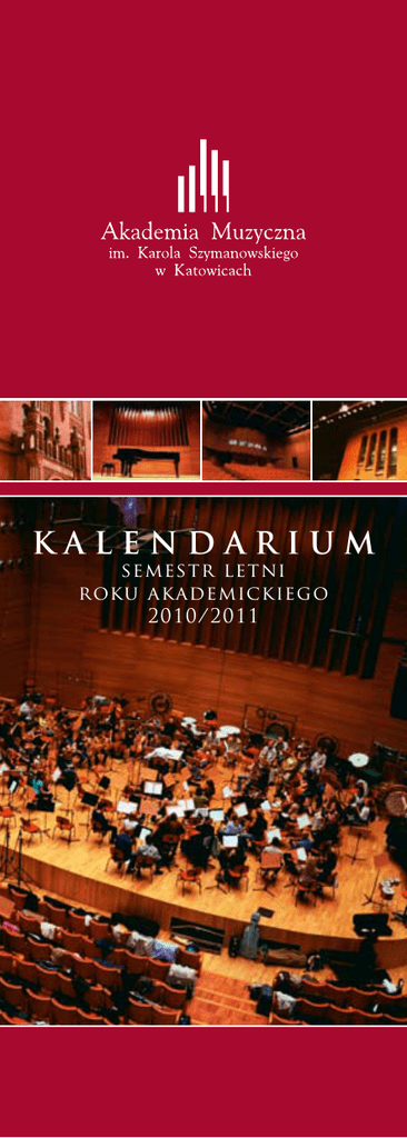 KALENDARIUM semestr letni roku akademickiego 2010/2011 1 Szanowni Państwo, Oddajemy w Państwa ręce kalendarz koncertowy Akademii Muzycznej im. Karola Szymanowskiego w Katowicach. Ten pilotażowy projekt obejmuje semestr letni roku akademickiego 2010/2011, skupiając większość wydarzeń artystycznych i aukowych, które będą miały miejsce w naszej Uczelni. Dwie formy jego prezentowania: tradycyjna – drukowana, a także elektroniczna – publikowana na stronie internetowej Akademii, powinny dać okazję do łatwego zapoznania się z naszą ofertą. Zdawaliśmy sobie sprawę, że ilość wydarzeń jest spora, jednak dopiero takie zestawienie pokazuje nam w sposób oczywisty ich liczbę, która nawet na nas, organizatorach, robi wrażenie. Bezsprzecznie jednak naszą największą radością są melomani i osoby zainteresowane działaniami Akademii, a ilość gości mile zaskakuje. Nie zwalnia to oczywiście z obowiązku dalszej troski o docieranie naszej oferty do wszystkich odbiorców. Stąd też ta właśnie inicjatywa która, mam taką nadzieję, spotka się z Państwa życzliwością. Katowicka Akademia Muzyczna jest ważną częścią obrazu muzycznego Polski, a aktywność koncertowa i naukowa stanowi szczególnie ważny element naszego funkcjonowania, wpisując się w budowanie społeczeństwa otwartego na kulturę wysoką. Nasza działalność koncertowa znalazła sobie już stałe miejsce w życiu kulturalnym miasta Katowice, ale także aglomeracji Śląsko-Dąbrowskiej. To oczywiste, że każdy koncert Akademickiej Orkiestry Symfonicznej, Dętej czy Barokowej, ściąga mnóstwo melomanów. Zależy nam jednak na tym, by reklamować i namawiać także do uczestnictwa w koncertach kameralnych i estradach studenckich. Jestem przekonany, że obserwowanie i słuchanie młodych muzyków – studentów potrafi sprawić bardzo wiele przyjemności, a nasza Aula im. Bolesława Szabelskiego, czy sale kameralne niosą wiele wspaniałej atmosfery w takim muzycznym kontekście. Z istoty naszego działania, a także przyjętych reguł wszystkie warsztaty, konferencje i sympozja są zawsze spotkaniami otwartymi. Bardzo zachęcam do wybierania również z tej części naszej oferty. Towarzyszenie takim wydarzeniom, prowadzonym przez muzyczne i naukowe autorytety, wzbogaca nasze odbieranie muzyki, odkrywając niejednokrotnie wiele fascynujących szczegółów, które w odbiorze koncertowym potrafią nam umknąć. Życzę, aby był to dla nas wszystkich kolejny bogaty w wielkie wydarzenia semestr, by każdy znalazł w naszej ofercie coś, co będzie potrafiło wywołać w nim głębszy rezonans w doświadczaniu piękna i młodości. Rektor Prof. Tomasz Miczka Akademicka Orkiestra Symfoniczna Zespół powstał 1 października 2002 roku i jest spadkobiercą oraz kontynuatorem wieloletniej działalności studenckiej Orkiestry Symfonicznej, której kierownikami i dyrygentami byli Karol Stryja, Napoleon Siess i Jan Wincenty Hawel. Dyrektorem Akademickiej Orkiestry Symfonicznej im. Karola Szymanowskiego jest adt dr Szymon Bywalec. Zespół pracuje w systemie sesyjnym, dając nie mniej niż pięć koncertów rocznie. W okresie swej działalności orkiestra gościła wielu wybitnych dyrygentów, wśród nich Gabriela Chmurę, Larry’ego Livingstona, Krzysztofa Pendereckiego, Arturo Tamayo, Takuo Yuasę, Jacka Kaspszyka, Michała Klauzę, Nicolasa Cleobury, Klausa Arpa, czy Andreasa Weissa. Pracując i koncertując pod ich kierunkiem, a także pod batutą rodzimych dyrygentów Jana Wincentego Hawela i Mirosława Jacka Błaszczyka, młodzi muzycy zdobywali cenne doświadczenia. Do ważnych wydarzeń w kalendarzu orkiestry zaliczyć można koncert w Filharmonii Narodowej (2007) oraz udział w Festiwalu „Warszawska Jesień” (2007) gdzie Akademicka Orkiestra Symfoniczna wykonała po raz pierwszy w Polsce Nommos Gamma Yannisa Xenakisa. W repertuarze orkiestry znajdują się takie pozycje jak: Ognisty Ptak i Pietruszka Igora Strawińskiego, Szecherezada Mikołaja RimskiegoKorsakowa, II Symfonia Sergiusza Rachmaninowa, III Symfonia Karola Szymanowskiego, La Mer Claude Debussy’ego, La Valse Maurice Ravela, Romeo i Julia Sergiusza Prokofiewa i wiele innych. Oprócz dzieł symfonicznych orkiestra może poszczycić się 4 również doświadczeniami w repertuarze operowym. Przy współpracy z Operą Śląską oraz studentami i pedagogami zaprzyjaźnionej uczelni muzycznej w Louisville zrealizowano 2 projekty: Cyganerię Giacomo Pucciniego i Wesele Figara Wolfganga Amadeusza Mozarta. Znaczna część koncertów została utrwalona w albumach płytowych dokumentujących działalność zespołu w latach 2002-2007. Działalność artystycznokoncertowa Akademickiej Orkiestry Symfonicznej jest wizytówką uczelni i ważnym uzupełnieniem życia muzycznego miasta i regionu. Akademicka Orkiestra Dęta W roku 2003 Dziekan Wydziału Wokalno – Instrumentalnego prof. AM Zygmunt Tlatlik, przy znaczącej pomocy ówczesnego Rektora naszej uczelni prof. zw. Eugeniusza Knapika oraz Prorektora – a obecnie Rektora prof. Tomasza Miczki, rozpoczął działania mające na celu założenie orkiestry dętej, która została powołana w październiku 2006 roku. Skład Akademickiej Orkiestry Dętej tworzą studenci Katedry Instrumentów Dętych i Perkusji. Dla realizacji celu dydaktycznego konstruowane są programy o wysokich walorach artystycznych, stylistycznie bardzo zróżnicowanych. Repertuar orkiestry obejmuje szerokie spektrum gatunków muzycznych od opracowań muzyki poważnej, filmowej, operowej, poprzez muzykę taneczną oraz polskie i światowe przeboje muzyki rozrywkowej. Do prowadzenia koncertów zapraszani są wybitni polscy i zagraniczni dyrygenci. Opiekę artystyczną i organizacyjną sprawuje Kierownik Katedry Instru- 5 mentów Dętych i Perkusji. Od początku istnienia Akademickiej Orkiestry Dętej wszystkie koncerty cieszą się ogromnym zainteresowaniem i powodzeniem słuchaczy. Akademicka Orkiestra Barokowa