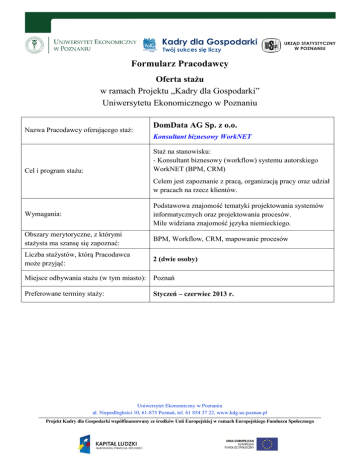 Formularz Pracodawcy Oferta stażu w ramach Projektu „Kadry dla Gospodarki” Uniwersytetu Ekonomicznego w Poznaniu Nazwa Pracodawcy oferującego staż: DomData AG Sp. z o.o. Konsultant biznesowy WorkNET Staż na stanowisku: - Konsultant biznesowy (workflow) systemu autorskiego WorkNET (BPM, CRM) Cel i program stażu: Celem jest zapoznanie z pracą, organizacją pracy oraz udział w pracach na rzecz klientów. Wymagania: Podstawowa znajomość tematyki projektowania systemów informatycznych oraz projektowania procesów. Mile widziana znajomość języka niemieckiego. Obszary merytoryczne, z którymi stażysta ma szansę się zapoznać: BPM, Workflow, CRM, mapowanie procesów Liczba stażystów, którą Pracodawca może przyjąć: 2 (dwie osoby) Miejsce odbywania stażu (w tym miasto): Poznań Preferowane terminy staży: Styczeń – czerwiec 2013 r. Uniwersytet Ekonomiczny w Poznaniu al. Niepodległości 10, 61-875 Poznań, tel. 61 854 37 22, www.kdg.ue.poznan.pl Projekt Kadry dla Gospodarki współfinansowany ze środków Unii Europejskiej w ramach Europejskiego Funduszu Społecznego
