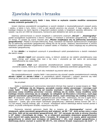 Zjawiska świtu i brzasku Poniżej wyjaśniamy pory fadżr i isza, które w wykazie czasów modlitw oznaczone zostały znakiem gwiazdki (*). Uczeni islamscy powiadomili szczegółowo w swoich dziełach o nieukształtowanych czasach postu i salatu, a także o tym, które z nich w jaki sposób powinno się używać. Z tego względu, że dla każdego miejsca na ziemi łącznie z biegunami podane zostały w książkach sposoby obliczenia i ich zasady i są one od 1400 lat stosowane, konieczne jest dokładnie tak samo je używać. Islamscy astronomowie w swoich książkach o astronomii zwanych „He’yet” i „Kozmografya” podali szczegółowe wyjaśnienia o świcie i brzasku w miastach o szerokości geograficznej 47 stopni 33 minut. Te miasta są znane również jako „Miasta znajdujące się na północnej szerokości geograficznej”. Miasta w Europie Północnej, Rosji, Kanadzie lub Stanach Zjednoczonych znajdujące się na północnej szerokości geograficznej należą też do tej grupy. Islamscy astronomowie w swoich książkach podali dokładne wyjaśnienia o czasach salatu w miastach, które znajdują się na północnej szerokości geograficznej. W Ibni Abidin i w książkach uczonych 4 prawidłowych szkół powiadomiono o dwóch metodach dla takich miast: • Akrab-i lejali czyli używanie czasu, w którym został po raz ostatni ukształtowany czas fadżr, biorąc pod uwagę czas isza z tej nocy i używanie go tak samo do ponownego ukształtowania się czasu fadżr, • Akrab-i bilad czyli używanie ukształtowanych czasów najbliższego miejsca, czyli używanie czasów, które są w obliczeniach i należą do najbliższej szerokości geograficznej. Czasy fadżr i isza używane w tych obu metodach są prawie takie same. Dla nieukształtowanych czasów fadżr i isza powinno się używać czasów powiadomionych metodą akrab-i lejlali lub akrab-i bilad i w pozostałych takich miejscach i czasach powinno się robić intencję do poszczenia i wykonania salatu jak w ukształtowanych czasach fadżr i isza. Na przykład: Jeden z wartościowych astronomów islamskich Ahmed Zija napisał w swojej książce pt. “Ilmi hey’et”: „Zbliżając się do bieguna, początek czasów salatu porannego i nocnego czyli czasy fadżr i isza oddalają się od czasów wschodu i zachodu słońca. Innymi słowy, pierwsze czasy modlitwy porannej i nocnej zbliżają się do siebie. Czasy modlitwy salat każdego miasta zmieniają się ze względu na odległość od Ekwadoru (równika), czyli jego stopnia szerokości geograficznej i deklinacji słońca, czyli zmieniają się według miesięcy i dni”. W miejscach, gdzie szerokość geograficzna jest ponad (90 - deklinacja), nie ma w ogóle dnia i nocy. Jeśli suma stopni szerokości geograficznych jest mniejsza niż (deklinacja +19), czyli w miejscach i czasie, gdy suma stopni szerokości geograficznej i deklinacji słońca wynosi (90 -19 = 71) lub więcej, inaczej mówiąc, gdy w innych miesiącach letnich deklinacja słońca wynosi ponad 5 stopni, to przed zniknięciem brzasku rozpoczyna się świt. Ponownie islamski astronom Hasib Bej w książce pt. „Kozmografya” napisał: „W miejscach, gdzie szerokość geograficzna jest większa od 66 ° 33' dnie są bez nocy a noce bez dnia. Jeśli od tej szerokości geograficznej 66 ° 33' narysuje się koło w stronę równika o 19° dalej i równolegle do niego, to w miejscach pomiędzy stopniami geograficznymi tych dwóch kół zajdą zjawiska świtu i brzasku. W miejscach i w czasie, gdzie szerokość geograficzna w całości jest mniejsza od (deklinacji + 19), czyli stopień geograficzny z deklinacją słońca wynosi w sumie 90-19=71, nim zniknie brzask rozpoczyna się świt”. W miejscach, gdzie 66 ° 33' – 19 ° 00' = 47° 33' , tj. w miejscach o szerokości geograficznej większej od 47 ° 33' nim zniknie brzask (zniknie zaczerwienienie w miejscu zachodu słońca) rozpoczyna się świt. Z tego wynika, że w miejscach o szerokości geograficznej od 47 ° 33' do 66 ° 33' (razem z 66 ° 33') zachodzą zjawiska świtu i brzasku. Dla miast znajdujących się w pasie koła pomiędzy tymi dwoma szerokościami geograficznymi w dniach przypadających przed i po 22 czerwca, tzn. w miesiącach letnich, nim zniknie brzask (nim zniknie zaczerwienienie w miejscu zachodu słońca), rozpoczyna się świt, nie rozpoczynają się czasy fadżr i isza (czyli nie ma nocnej ciemności). Z tego względu, że uczeni sunniccy oznajmili: „Gdy te czasy się nie rozpoczynają, dobrze jest wykonywać salat w czasie, który zaszedł w ostatnim dniu”, te czasy oznaczono znakiem z gwiazdką. W ten sposób w wykazie czasów modlitw dla takich miast użyto wyjaśnienia dla „znaku gwiazdki”, że: „czasy fadżr i isza są czasami, w których fadżr zaszedł w ostatnim dniu”. Liczba dni, w które fadżr i isza zostały oznaczone „znakiem gwiazdki”, wzrasta proporcjonalnie w stosunku do zbliżenia się do bieguna, czyli im większa jest szerokość geograficzna jakiegoś miejsca od 47° 33' tym więcej jest dni przed o po 22 czerwca. Jeśli w jakimś miejscu nie ma czasu fadżr, to nie ma też tam czasu isza, tzn. jeśli nie ukształtuje się czas fadżr, to nie zachodzi czas isza. W takim czasie używa się czasu fadżr, który zaszedł ostatniego dnia razem z czasem isza z tego dnia aż do ponownego ukształtowania się czasu fadżr. W dni, w które „czas fadżr” nie zachodzi, w ten sposób podany czas i „oznaczony gwiazdką” czas jest czasem fadżr. Używa się go jako czas fadżr jak w innych dniach. Podobnie czas isza jest też jak w pozostałych dniach czasem isza. Oznaczone gwiazdką czasy fadżr i isza są jak pozostałe czasy fadżr i isza i tak jak w pozostałych czasach, które nie są „oznaczone gwiazdkami”, robi się w nie intencję do postu i wykonuje salat. Choć w szkole Hanefi czas salatu jest warunkiem i powodem, to gdy nie znajdzie się powodu, czyli gdy nie rozpocznie się czas, to 