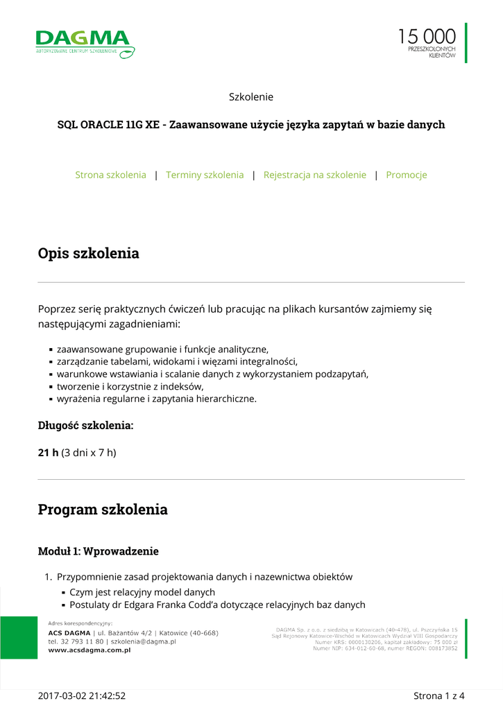 Szkolenie SQL ORACLE 11G XE - Zaawansowane użycie języka zapytań w bazie danych Strona szkolenia | Terminy szkolenia | Rejestracja na szkolenie | Promocje Opis szkolenia Poprzez serię praktycznych ćwiczeń lub pracując na plikach kursantów zajmiemy się następującymi zagadnieniami: zaawansowane grupowanie i funkcje analityczne, zarządzanie tabelami, widokami i więzami integralności, warunkowe wstawiania i scalanie danych z wykorzystaniem podzapytań, tworzenie i korzystnie z indeksów, wyrażenia regularne i zapytania hierarchiczne. Długość szkolenia: 21 h (3 dni x 7 h) Program szkolenia Moduł 1: Wprowadzenie 1. Przypomnienie zasad projektowania danych i nazewnictwa obiektów Czym jest relacyjny model danych Postulaty dr Edgara Franka Codd’a dotyczące relacyjnych baz danych 2017-03-02 21:42:52 Strona 1 z 4 Kiedy baza jest „normalna”, czyli definicja trzech postaci normalnych relacyjnej bazy danych Zasady nazewnictwa tabel, kolumn oraz więzów integralności 2. Przypomnienie podstawowych cech oraz składni języka SQL Polecenia wybierające dane Polecenia modyfikujące dane Polecenia definiujące obiekty 3. Przypomnienie zasad korzystania ze słownika danych Moduł 2: Zarządzanie uprawnieniami bazy danych za pomocą języka SQL 1. Typy uprawnień w serwerze bazodanowym Uprawnienia obiektowe Uprawnienia systemowe 2. Skąd wiedzieć co mi wolno a co nie, czyli słownik danych po raz setny 3. Nadawanie i odbieranie przywilejów Składnia polecenia GRANT Składnia polecenia REVOKE Moduł 3: Zaawansowana transakcyjność 1. Przypomnienie podstaw, związanych z transakcjami w bazie danych Mechanizmy ochrony danych Typy izolacji transakcji Polecenia COMMIT oraz ROLLBACK 2. Zagrożenia płynące z nieprawidłowego wykorzystania transakcji Niekończące się transakcje Blokowanie obiektów Hazard danych 3. Kto blokuje drogę, czyli mechanizmy LOCK w serwerze bazodanowym Identyfikacja blokad Radzenie sobie ze zbyt długimi blokadami Moduł 4: Manipulowanie dużymi zbiorami danych 1. Kopiowanie wierszy z innej tabeli 2. Modyfikacja danych z wykorzystaniem podzapytań 3. Modyfikacja danych na podstawie złączenia z innymi tabelami 2017-03-02 21:42:52 Strona 2 z 4 4. Warunkowe wstawianie danych czyli przedstawienie polecenia MERGE 5. Jak sprawdzić co było a nie jest, czyli problem archiwizacji danych Moduł 5: Zarządzanie obiektami bazy danych 1. Przypomnienie podstawowych typów obiektów bazodanowych Tabele Indeksy Perspektywy Więzy integralności 2. Przypomnienie informacji na temat typów danych Typy znakowe Typy liczbowe Data i czas 3. Tworzenie i modyfikacja tabeli Definiowanie nowych tabel Dodawanie i usuwanie kolumn z istniejących obiektów Jak zdefiniować więzy integralności w bazie danych 4. Zasady tworzenia i używania indeksów Omówienie typów indeksów Kiedy warto indeksować, czyli książka telefoniczna vs. kilka wizytówek 5. Lepsze spojrzenie na dane, czyli kiedy korzystać z widoków Moduł 6: Generowanie raportów z wykorzystaniem zaawansowanych funkcji grupujących 1. Przypomnienie zasad grupowania Klauzula GROUP BY Kiedy i co grupować? Filtrowanie danych, czyli WHERE vs. HAVING Sortowanie pogrupowanych wyników 2. Grupowanie po wielu kolumnach oraz zbiorach kolumn 3. Wyliczanie dodatkowych podsumowań częściowych i ogólnych Przedstawienie klauzuli ROLLUP Przedstawienie klauzuli CUBE 2017-03-02 21:42:52 Strona 3 z 4 Moduł 7: Zaawansowane techniki pozyskiwania danych z użyciem podzapytań oraz funkcji analitycznych 1. Przypomnienie zasad korzystania z podzapytań Podzapytania w klauzuli SELECT Podzapytania w klauzuli FROM Podzapytania w klauzuli WHERE 2. Czym są podzapytania skorelowane? Wpływ zapytań skorelowanych na wydajność serwera bazodanowego Kiedy można, a kiedy trzeba korzystać z podzapytań skorelowanych? 3. Wprowadzenie do funkcji analitycznych w języku SQL Zastąpienie zapytań skorelowanych funkcjami analitycznymi Przedstawienie funkcji rankingowych Partycjonowanie wyników zapytania Wykorzystanie agregacji bez grupowania Moduł 8: Wsparcie wyrażeń regularnych oraz „chodzenie po drzewie“ 1. „Co jest podobne do...?”, czyli wprowadzenie do wyrażeń regularnych Zalety i wady korzystania z wyrażeń regularnych Funkcje bazodanowe wspierające używanie wyrażeń Wpływ wyrażeń regularnych na wydajność serwera bazodanowego 2. Nauka chodzenia po drzewie, czyli wsparcie SQL dla relacji typu RODZICDZIECKO Jak zidentyfikować dane w postaci drzewa? Kiedy budowanie hierarchii może być przydatne Funkcje wspierające „chodzenie po drzewie” 2017-03-02 21:42:52 Strona 4 z 4