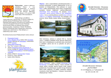 Mi dzyzdroje – miasto w pó nocnozachodniej Polsce, w woj. zachodniopomorskim, w powiecie kamie skim, po one na wyspie Wolin nad Morzem Ba tyckim. Wed ug danych z 30 czerwca 2009 miasto mia o 5502 mieszka ców. Mi dzyzdroje s o rodkiem wypoczynkowym i turystycznym. W mie cie znajduje si siedziba dyrekcji Woli skiego Parku Narodowego. Popularn letni imprez rozrywkow jest organizowany corocznie Europejski Festiwal Gwiazd. Walorami turystycznymi miasta s : po enie nad morzem, piaszczyste pla e, wzniesienia w Pa mie Woli skim, blisko Woli skiego Parku Narodowego, historyczne zabudowania uzdrowiskowe i Park Zdrojowy w nadmorskiej cz ci miasta. Wapnica - wie w województwie zachodniopomorskim, w powiecie kamie skim, w gminie Mi dzyzdroje, 5,5 km na po udnie od Mi dzyzdrojów. Wie po ona na wyspie Wolin, wzd po udniowego skraju Doliny Trzci gowskiej, pomi dzy le nymi Pagórkami Lubi sko-Wapnickimi Woli skiego Parku Narodowego. Na po udniu Jezioro Turkusowe i obszar ochrony cis ej im. prof. W adys awa Szafera. 1 km na wschód-pó nocny wschód obszar ochrony cis ej im. dr. Bogdana Dyakowskiego. Na zachodzie, nad jeziorem Wicko Wielkie (zatoka Zalewu Szczeci skiego) – port Wapnica. rodek Kolonijno - Wczasowy w Wapnicy k/ Mi dzyzdrojów Do atrakcji turystycznych Mi dzyzdrojów mo na zaliczy : Promenad Gwiazd molo o d ugo ci 395 m, b ce tak e przystani morsk , sk d rejsy do winouj cia i niemieckich portów Uznamu, gabinet figur woskowych , kino "Eva", otwarte w 2009 roku obiekty Woli skiego Parku Narodowego, w którym znajduj si : Zagroda Pokazowa ubrów oraz Muzeum Przyrodnicze z ywymi bielikami w wolierach, punkty widokowe: Kawcza Góra i Gosa , ko ció w. Piotra Aposto a, kaplica Stella Matutina. Wie letniskowa, za ona w po owie XVII w., dawniej znana z rozleg ych pok adów kredy (porwak lodowcowy), która by a tu wydobywana na potrzeby du ej cementowni w pobliskim Lubinie (0,5 km na po udnie od portu w Wapnicy). Jezioro Turkusowe - jedna z atrakcji Woli skiego Parku Narodowego, na po udniu Wapnicy. Jezioro powsta o na skutek zalania wyrobisk dawnej kopalni kredy wodami podskórnymi. Na po udniowym wysokim brzegu (Piaskowa Góra) punkt widokowy. W pobli u znakowany niebieski turystyczny Szlak Nad Ba tykiem i Zalewem Szczeci skim (Mi dzyzdroje Wolin). _________________________________________ rodek Wczasowo-Kolonijny „Z OTA RYBKA” 72-519 Wapnica, ul. Turkusowa 20 tel. (91) 32-84-101 ZIELONA SZKO A W OBRAZKACH Zwiedzanie okolicy Odpoczynek pora na lody Wycieczka do Fortu Gerharda i Latarni Morskiej Gabinet figur woskowych Spacery w Mi dzyzdrojach Maraton u miechu Mam talent Wypasiona Zielona Szko a Gitara, ognisko i piew Spacer wokó Jeziora Turkusowego Rejs statkiem po Morzu Ba tyckim W zwi zku tak bogatym programem oraz mi i rodzinn atmosfer osiemdziesi t procent uczestników wraca tu ponownie. SPRÓBUJ I TY !!!!!!! Konkurs rze b z piasku Karaoke Konkurs na odlotow fryzur Wycieczka do Rezerwatu ubrów Dyskoteki Wycieczka do winouj cia