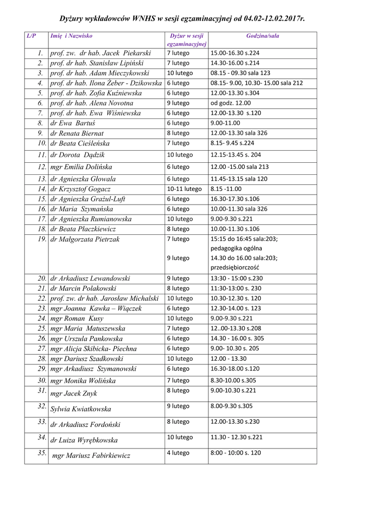 Dyżury wykładowców WNHS w sesji egzaminacyjnej od 04.02
