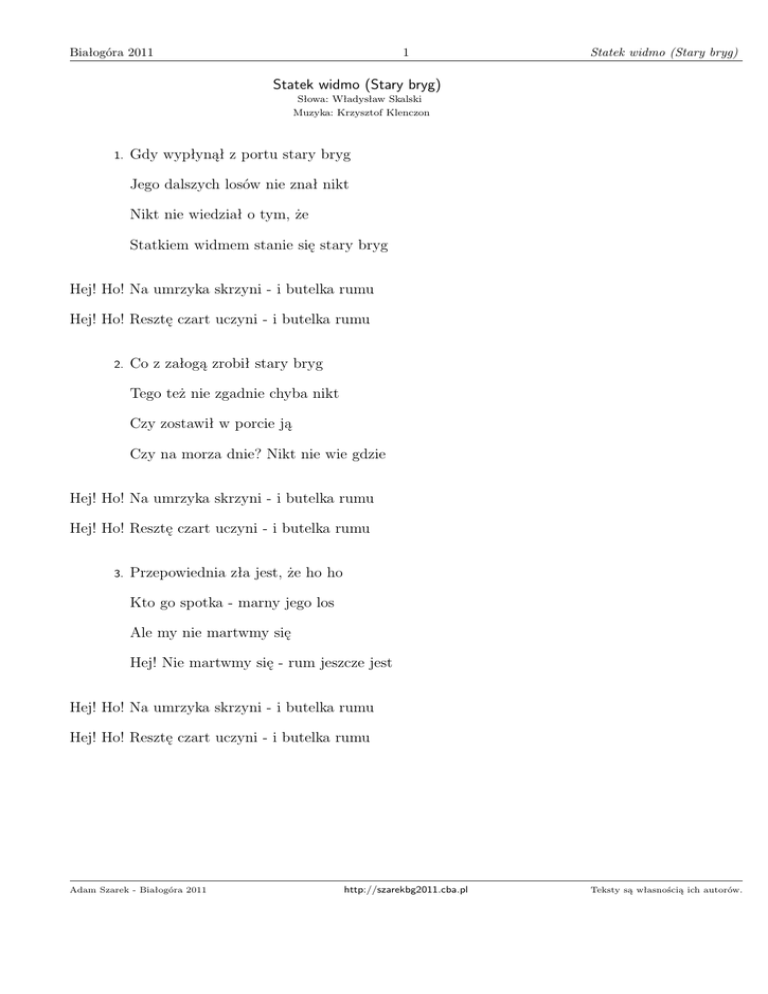 Białogóra 2011 1 Statek widmo (Stary bryg) Statek widmo (Stary bryg) Słowa: Władysław Skalski Muzyka: Krzysztof Klenczon 1. Gdy wypłynął z portu stary bryg Jego dalszych losów nie znał nikt Nikt nie wiedział o tym, że Statkiem widmem stanie się stary bryg Hej! Ho! Na umrzyka skrzyni - i butelka rumu Hej! Ho! Resztę czart uczyni - i butelka rumu 2. Co z załogą zrobił stary bryg Tego też nie zgadnie chyba nikt Czy zostawił w porcie ją Czy na morza dnie? Nikt nie wie gdzie Hej! Ho! Na umrzyka skrzyni - i butelka rumu Hej! Ho! Resztę czart uczyni - i butelka rumu 3. Przepowiednia zła jest, że ho ho Kto go spotka - marny jego los Ale my nie martwmy się Hej! Nie martwmy się - rum jeszcze jest Hej! Ho! Na umrzyka skrzyni - i butelka rumu Hej! Ho! Resztę czart uczyni - i butelka rumu Adam Szarek - Białogóra 2011 http://szarekbg2011.cba.pl Teksty są własnością ich autorów.