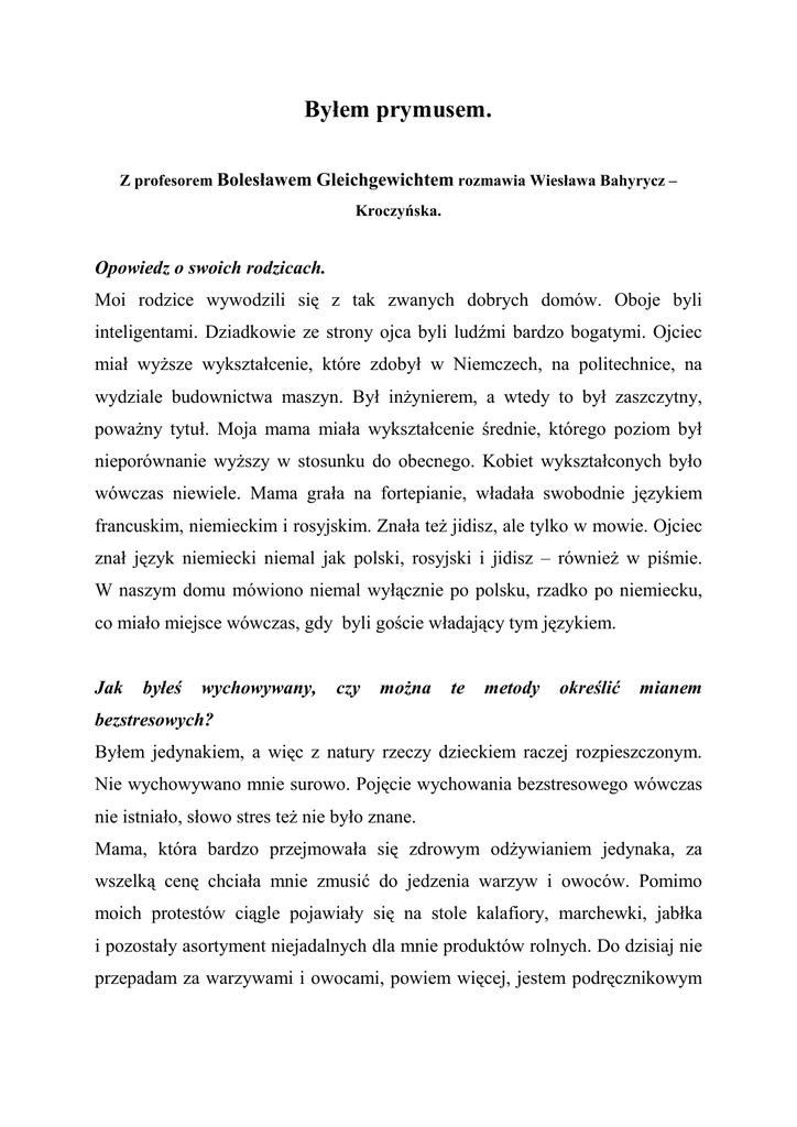 Byłem prymusem. Z profesorem Bolesławem Gleichgewichtem rozmawia Wiesława Bahyrycz – Kroczyńska. Opowiedz o swoich rodzicach. Moi rodzice wywodzili się z tak zwanych dobrych domów. Oboje byli inteligentami. Dziadkowie ze strony ojca byli ludźmi bardzo bogatymi. Ojciec miał wyŜsze wykształcenie, które zdobył w Niemczech, na politechnice, na wydziale budownictwa maszyn. Był inŜynierem, a wtedy to był zaszczytny, powaŜny tytuł. Moja mama miała wykształcenie średnie, którego poziom był nieporównanie wyŜszy w stosunku do obecnego. Kobiet wykształconych było wówczas niewiele. Mama grała na fortepianie, władała swobodnie językiem francuskim, niemieckim i rosyjskim. Znała teŜ jidisz, ale tylko w mowie. Ojciec znał język niemiecki niemal jak polski, rosyjski i jidisz – równieŜ w piśmie. W naszym domu mówiono niemal wyłącznie po polsku, rzadko po niemiecku, co miało miejsce wówczas, gdy byli goście władający tym językiem. Jak byłeś wychowywany, czy moŜna te metody określić mianem bezstresowych? Byłem jedynakiem, a więc z natury rzeczy dzieckiem raczej rozpieszczonym. Nie wychowywano mnie surowo. Pojęcie wychowania bezstresowego wówczas nie istniało, słowo stres teŜ nie było znane. Mama, która bardzo przejmowała się zdrowym odŜywianiem jedynaka, za wszelką cenę chciała mnie zmusić do jedzenia warzyw i owoców. Pomimo moich protestów ciągle pojawiały się na stole kalafiory, marchewki, jabłka i pozostały asortyment niejadalnych dla mnie produktów rolnych. Do dzisiaj nie przepadam za warzywami i owocami, powiem więcej, jestem podręcznikowym 2 przykładem, jak nie naleŜy się odŜywiać. I proszę, skończyłem niedawno 88 lat. Oczywiście nikogo nie namawiam do naśladowania mnie. A najmilszą zabawą było naśladowanie konduktów pogrzebowych. CzyŜ nie? Zapewne dziwi ciebie moja ulubiona zabawa z lat dziecięcych. Mieszkaliśmy przy ulicy, którą przemieszczały się kondukty. Często u nas przebywała moja kuzynka Janka, kilka lat młodsza (od długiego czasu mieszka w Stanach Zjednoczonych i gdyby ktoś zechciał spisać historię jej Ŝycia, miałby przebogaty materiał). I my, dwoje dzieciaków, z zaciekawieniem oglądaliśmy kondukty, a następnie „odgrywaliśmy” je w salonie. Ja robiłem za orkiestrę, a Janka, jako młodsza, wykonywała moje polecenia. Beztroskie czasy! Czas beztroskiego dzieciństwa szybko mijał i mały Boluś poszedł do szkoły... Do szkoły poszedłem w roku 1928, w wieku dziewięciu lat, do klasy wstępnej Gimnazjum im. Mikołaja Reja w Warszawie. Do tego czasu uczyłem się w domu, pod okiem doświadczonego pedagoga, mojej znacznie starszej kuzynki Marii Szejnman, która przygotowała mnie do egzaminu wstępnego. Wyboru szkoły dokonała moja matka, przy aprobacie ojca. Gimnazjum Reja było znakomitą szkołą niepaństwową, prowadzoną przez Zbór Ewangelicko – Augsburski ( luterański). Jak wyglądał przeciętny dzień ucznia w gimnazjum Reja? Typowy dzień ucznia, przynajmniej mój, był następujący: budzenie, pierwsze śniadanie ( w domu), droga do szkoły, którą przemierzałem tramwajem. Zajęcia w szkole trwały od 8 do 12, 13 lub 14. W szkole zjadałem drugie śniadanie. Do domu wracałem równieŜ tramwajem, w starszych klasach niekiedy pieszo. Jadłem obiad, odpoczywałem, jadłem podwieczorek (ale tylko wtedy, gdy byłem w młodszych klasach). Później odrabianie lekcji, które trwało do kolacji. Czytanie ksiąŜek, czasem kino z rodzicami. Sen. 3 Przedwojenna szkoła róŜniła się od obecnej. Na co zwracano szczególną uwagę? W gimnazjum zwracano uwagę na dobre przyswajanie materiału podczas lekcji, staranne odrabianie zadań domowych. Uczeń Reja musiał nienaganne się zachowywać w szkole i poza nią. Panowała dość surowa dyscyplina. Pamiętam, Ŝe jeden z uczniów zerwał kwiat w Łazienkach, ktoś to zauwaŜył, przekazał informację do szkoły i tego ucznia usunięto ze szkoły. Dzisiaj to brzmi zupełnie nierealnie, prawda? JuŜ widzę reakcje obecnych uczniów... Ale szkoła to nie tylko uczniowie, ale i nauczyciele. Jak, po latach, oceniasz swoich wykładowców? Byli to ludzie bardzo dobrze przygotowani merytorycznie i pedagogicznie, na ogół wymagający. Wielu wyróŜniało się szerokimi horyzontami myślowymi, niektórzy z nich mieli stopnie naukowe bądź byli autorami podręczników czy monografii. Szczególnych oryginałów wśród nich nie było. A moŜe to i dobrze? Lata szkolne to takŜe czas kształtowania młodych ludzi. Czego oczekiwali od was nauczyciele? Jakie wartości były cenne dla uczniów? Przez pedagogów najbardziej cenionymi były zdolności ucznia i jego pilność, uczciwość i prawdomówność, poszanowanie godności własnej i honoru. My ceniliśmy honor, koleŜeńskość, walory umysłu, no i fizyczne. Chyba jasne, dlaczego. KaŜdy ma w pamięci chwilę, którą wspomina, nawet po wielu latach. Co Ty zachowałeś w zakamarkach pamięci? To pozornie drugorzędne zdarzenie. Klasa była w naszym ośrodku - „Rejówce” koło Góry Kalwarii (kaŜda klasa spędzała tam dwa razy po tygodniu rocznie, nie 4 był to czas beztroskiego wypoczynku, odbywały się lekcje). Po kolacji poszliśmy na spacer, w szyku parami. Szliśmy pod lasem, było pięknie. Panował jakiś niepowtarzalny nastrój. Powiedziałem do idącego ze mną w parze Genia Szulca, Ŝe tego spaceru nie zapomnę do końca Ŝycia. Odparł, Ŝe Ŝycie przynosi tyle niespodzianek, Ŝe moŜe być wojna, Ŝe na pewno zapomnę. Nie zapomniałem. Chciałem mu to powiedzieć, ale nie doszło do naszego spotkania. Zmarł jakiś czas temu. Jak spędzałeś wakacje w latach przedszkolnych i szkolnych? Od najwcześniejszego dzieciństwa aŜ do 1930 roku razem z matką wyjeŜdŜaliśmy na letnisko koło Warszawy lub nad morze (ojciec dojeŜdŜał później, miał obowiązki związane z pracą). Pamiętam ustalanie zapłaty za pokój w Zoppocie (dzisiejszy Sopot oczywi