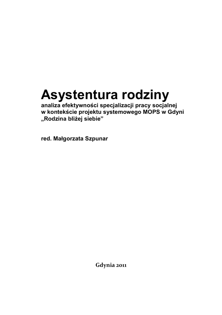 Asystentura rodziny analiza efektywności specjalizacji pracy socjalnej w kontekście projektu systemowego MOPS w Gdyni „Rodzina bliżej siebie” red. Małgorzata Szpunar Gdynia 2011 Wykorzystywanie w części lub całości materiałów zawartych w tym opracowaniu możliwe jest jedynie na prawach cytatu, zgodnie z ustawą o prawie autorskim i prawach pokrewnych z 1994 r. Właścicielem autorskich praw majątkowych do publikacji jest Miejski Ośrodek Pomocy Społecznej w Gdyni. Redakcja: Recenzent: dr Małgorzata Szpunar prof. dr hab. Jerzy Krzyszkowski Skład i łamanie: Wydawnictwo Historyczne Tabularium, tel. 502 504 709, [email protected] Małgorzata Szumna Tomasz Bogdanowicz Sowa-Druk na Życzenie www.sowadruk.pl tel 22 431 81 40 Korekta językowa: Zdjęcie na okładce: Druk i oprawa: Wydawca: Miejski Ośrodek Pomocy Społecznej w Gdyni 81-265 Gdynia, ul. Grabowo 2 tel/fax: 58 782 01 20, 58 625 93 30, 58 625 93 37 www.mopsgdynia.pl www.rodzinablizejsiebie.pl Współpraca: Uniwersytet Gdański 80-952 Gdańsk, ul. Bażyńskiego 1a (Rektorat) tel.: 523 24 00, fax. 58 552 03 11 www.ug.edu.pl ISBN 978-83-932137-4-0 Wydanie pierwsze, Gdynia 2011 Publikacja współfinansowana ze środków Unii Europejskiej w ramach Europejskiego Funduszu Społecznego i nie jest przeznaczona do sprzedaży. Spis treści Część pierwsza – Rozwój specjalizacji pracy socjalnej w MOPS Gdynia Jarosław Józefczyk Perspektywy rozwoju pracy socjalnej w Miejskim Ośrodku Pomocy Społecznej w Gdyni . . . . . . . . . . . . . . . . . . . . . . . . . . . . . . 3 Aleksandra Dębska-Cenian Gdyński model profilaktyki bezdomności jako przejaw innowacji w pomocy społecznej . . . . . . . . . . . . . . . . . . . . . . . . . . . . . . . . . . . 19 Katarzyna Łangowska, Aleksandra Pakólska Projekt systemowy „Rodzina bliżej siebie” - impuls do samozmiany klientów gdyńskiego MOPS . . . . . . . . . . . . . . . . . . . . . . . . . . . . . . . 41 Jarosław Józefczyk Analiza wariantów kontynuacji działań po zakończeniu dofinansowania projektu systemowego „Rodzina bliżej siebie” od 2014. . . . . . . . . . . . 53 Część druga – Odbiorca pomocy społecznej w przeprowadzonych badaniach Sylwiusz Retowski, Aleksandra Dębska-Cenian, Alicja Paracka Ogólna charakterystyka społeczna i psychologiczna odbiorców pogłębionej i intensywnej pracy socjalnej . . . . . . . . . . . . . . . . . . . . . . . . . 67 Małgorzata Szpunar Znaczenie asystentury rodzin i działań projektowych „Rodzina bliżej siebie” realizowanych w MOPS w Gdyni w recepcji jej beneficjentów. . . . . . . . . 87 Julita Wirkus-Ostrowska Asystentura rodziny w praktyce. Monografia rodziny. . . . . . . . . . . . . 137 Adam Miller Analiza sytuacji beneficjentów ostatecznych projektu „Rodzina bliżej siebie” po zakończeniu udziału w projekcie . . . . . . . . . . . . . . . . . . . . . 151 Izabela Krasiejko, Anna Imielińska Efektywność asystentury rodziny na podstawie badań przeprowadzonych w MOPS w Częstochowie . . . . . . . . . . . . . . . . . . . . . . . . . . 165 Część pierwsza Rozwój specjalizacji pracy socjalnej w MOPS Gdynia