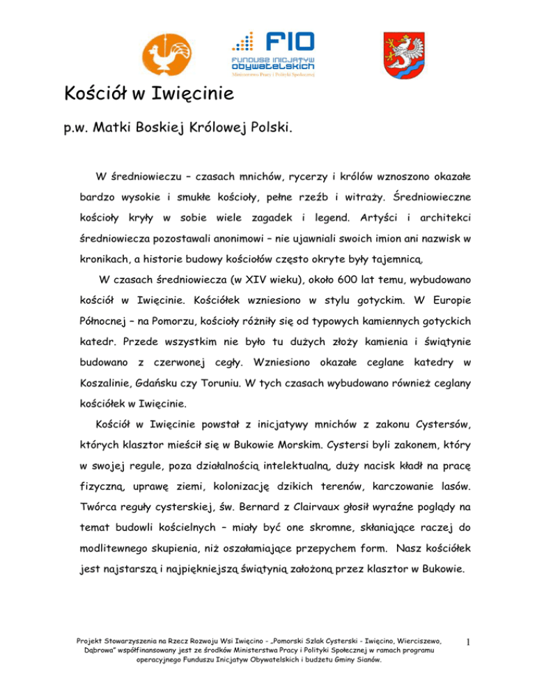 Kościół w Iwięcinie p.w. Matki Boskiej Królowej Polski. W średniowieczu – czasach mnichów, rycerzy i królów wznoszono okazałe bardzo wysokie i smukłe kościoły, pełne rzeźb i witraży. Średniowieczne kościoły kryły w sobie wiele zagadek i legend. Artyści i architekci średniowiecza pozostawali anonimowi – nie ujawniali swoich imion ani nazwisk w kronikach, a historie budowy kościołów często okryte były tajemnicą. W czasach średniowiecza (w XIV wieku), około 600 lat temu, wybudowano kościół w Iwięcinie. Kościółek wzniesiono w stylu gotyckim. W Europie Północnej – na Pomorzu, kościoły różniły się od typowych kamiennych gotyckich katedr. Przede wszystkim nie było tu dużych złoży kamienia i świątynie budowano z czerwonej cegły. Wzniesiono okazałe ceglane katedry w Koszalinie, Gdańsku czy Toruniu. W tych czasach wybudowano również ceglany kościółek w Iwięcinie. Kościół w Iwięcinie powstał z inicjatywy mnichów z zakonu Cystersów, których klasztor mieścił się w Bukowie Morskim. Cystersi byli zakonem, który w swojej regule, poza działalnością intelektualną, duży nacisk kładł na pracę fizyczną, uprawę ziemi, kolonizację dzikich terenów, karczowanie lasów. Twórca reguły cysterskiej, św. Bernard z Clairvaux głosił wyraźne poglądy na temat budowli kościelnych – miały być one skromne, skłaniające raczej do modlitewnego skupienia, niż oszałamiające przepychem form. Nasz kościółek jest najstarszą i najpiękniejszą świątynią założoną przez klasztor w Bukowie. Projekt Stowarzyszenia na Rzecz Rozwoju Wsi Iwięcino - „Pomorski Szlak Cysterski - Iwięcino, Wierciszewo, Dąbrowa” współfinansowany jest ze środków Ministerstwa Pracy i Polityki Społecznej w ramach programu operacyjnego Funduszu Inicjatyw Obywatelskich i budżetu Gminy Sianów. 1 Watro zwrócić uwagę na charakterystyczne dla gotyckiej architektury ostre łuki nad drzwiami i oknami oraz na ślepe, jakby zamurowane okna (które nazywają się „blendy”). Kościół wybudowano na wzniesieniu w centrum wsi. Podstawą kościoła są masywne kamienne fundamenty. Kamień na fundamenty zwieziono z różnych stron – ze wsi Bukowo, Osieki i z Suchej. Charakterystycznym elementem kościoła jest wysoka na 32 metry wieża, która przez wiele stuleci była znakiem nawigacyjnym dla wracających z morza rybaków. Wieża pochylona jest w kierunku zachodnim, ze względu na wiejące od zachodu silne wiatry1. W dawnych czasach wokół świątyni znajdował się cmentarz. Cmentarz Dookoła kościoła znajdował się cmentarz. Do dziś zachowały się trzy cmentarne bramy – każda przeznaczona była dla mieszkańców innej wsi: Iwięcina, Wierciszewa i Belkowa. Każdą z cmentarnych bram zdobił rzeźbiony napis: Belkowo „Tu Mors, Eris Porta Coeli” („O śmierci. Ty staniesz się bramą do nieba”); Wierciszewo „Gehet Zu Seinem Troen Ein Mit Danken” (Przestępujcie jego bramy z wdzięcznością”); napis z Iwięcińskiej bramy stał się z czasem nieczytelny. W dawnych czasach pilnowano, aby mieszkańcy każdej z wsi korzystali tylko i wyłącznie z przeznaczonej dla nich bramy. Przy bramie Wierciszewa i Belkowa pastor odprawiał uroczystości pogrzebowe, dlatego też były znacznie szersze od bramy Iwięcińskiej. W Iwięcinie uroczystości te odbywały się w domach umarłych mieszkańców, które pastor odwiedzał osobiście. 1 Wieża – 32 metry wysokości. Kościół pierwotnie posiadał cztery wieżyczki, jednak w 1732 roku piorun zniszczył dwie z nich, odbudowano zatem jedną wieżę i nadano jej pochylenie w kierunku zachodnim (by uchronić przed silnymi wiatrami zachodnimi). Projekt Stowarzyszenia na Rzecz Rozwoju Wsi Iwięcino - „Pomorski Szlak Cysterski - Iwięcino, Wierciszewo, Dąbrowa” współfinansowany jest ze środków Ministerstwa Pracy i Polityki Społecznej w ramach programu operacyjnego Funduszu Inicjatyw Obywatelskich i budżetu Gminy Sianów. 2 Wnętrze. Kościół w Iwięcinie, podobnie jak większość średniowiecznych kościołów, jest „orientowany” – oznacza to, iż prezbiterium wybudowane jest od wschodu. Wiąże się to z traktowaniem światła jako przejawu boskości – wpadające do kościoła słońce podczas porannych mszy sprawiało, iż ołtarz był świetlisty, zgodnie z biblijnym przekazem, iż Bóg jest światłością. Z czasów średniowiecza (z 1417 roku) pochodzi najmniejszy dzwon kościoła, sakramentarium gotyckie z XVI wieku i krucyfiks z przełomu XV/XVI wieku. Sakramentarium jest drewnianą szafką, w której przechowywano Najświętszy Sakrament i oleje wykorzystywane podczas mszy. Sakramentarium posiada ozdobny zamek, kołatkę i dekoracyjną rozetkę w centrum płyciny drzwiczek. W górnej części ozdobione jest krenelażem (ozdobne kwadratowe „ząbki”), u dołu wyciętym trójliściem, w głębi którego widoczny jest łuk listkowy. Drewniany późnogotycki krucyfiks – w kwadratowych zakończeniach ramion krzyża posiada wizerunki czterech skrzydlatych symboli, atrybutów Ewangelistów. Są to: wół (św. Łukasz), lew (św. Marek), orzeł (św. Jan) i człowiek-Anioł (św. Mateusz). Te symbole w sztuce łączono z Ewangelistami już od IV wieku (wg Ezechiela I,5-14, opisany jest w tej wizji skrzydlaty Tetramorf o czterech twarzach: orła, człowieka, woła i lwa). Ciekawostkę stanowią krzyże maltańskie na ścianach kościoła, zwane „zacheuszami”. Zachowało się pięć takich krzyży. W średniowieczu umieszczano takie krzyżyki na pamiątkę poświęcenia (konsekracji) kościoła. Bywało, iż w tych miejscach przytwierdzano świeczki. Tradycyjnie umieszczano 12 zacheuszy. Pozostałe elementy wyposażenia wnętrza, pochodzą już z czasów które nastały po średniowieczu. Projekt Stowarzyszenia na Rzecz Rozwoju Wsi Iwięcino - „Pomorski Szlak Cysterski - Iwięcino, Wierciszewo, Dąbrowa” współfinansowany jest ze środków Ministers