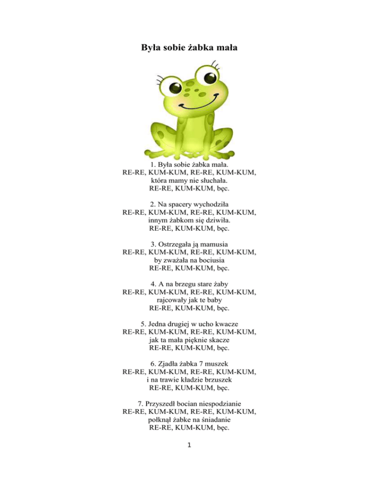Była sobie żabka mała 1. Była sobie żabka mała. RE-RE, KUM-KUM, RE-RE, KUM-KUM, która mamy nie słuchała. RE-RE, KUM-KUM, bęc. 2. Na spacery wychodziła RE-RE, KUM-KUM, RE-RE, KUM-KUM, innym żabkom się dziwiła. RE-RE, KUM-KUM, bęc. 3. Ostrzegała ją mamusia RE-RE, KUM-KUM, RE-RE, KUM-KUM, by zważała na bociusia RE-RE, KUM-KUM, bęc. 4. A na brzegu stare żaby RE-RE, KUM-KUM, RE-RE, KUM-KUM, rajcowały jak te baby RE-RE, KUM-KUM, bęc. 5. Jedna drugiej w ucho kwacze RE-RE, KUM-KUM, RE-RE, KUM-KUM, jak ta mała pięknie skacze RE-RE, KUM-KUM, bęc. 6. Zjadła żabka 7 muszek RE-RE, KUM-KUM, RE-RE, KUM-KUM, i na trawie kładzie brzuszek RE-RE, KUM-KUM, bęc. 7. Przyszedł bocian niespodzianie RE-RE, KUM-KUM, RE-RE, KUM-KUM, połknął żabke na śniadanie RE-RE, KUM-KUM, bęc. 1 8. Teraz wszystkie żabki płaczą RE-RE, KUM-KUM, RE-RE, KUM-KUM, że jej więcej nie zobaczą RE-RE,KUM-KUM, bęc 9. Tej piosenki morał znamy RE-RE,KUM-KUM RE-RE,KUM-KUM trzeba zawsze słuchac mamy RE-RE,KUM-KUM, bęc 2