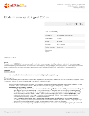 SK-FARM II Sp. z o.o. - Apteka Internetowa ul. Kleeberga 34, Białystok +48 42 279 40 05 Eloderm emulsja do kąpieli 200 ml Cena: 16,90 PLN Opis słownikowy Dostępność Dostępny w aptece w 24h Opakowanie 200 ml Postać Emulsje Producent POLPHARMA Rodzaj rejestracji Kosmetyk Substancja czynna - Opis produktu Wstęp Produkty z serii ELODERM to linia nowoczesnych emolientów przeznaczonych do pielęgnacji skóry nadmiernie suchej, swędzącej i nadwrażliwej na czynniki zewnętrzne. Ważnym warunkiem pielęgnacji skóry suchej jest unikanie czynników zaostrzających suchość i stosowanie odpowiednich preparatów przeznaczonych do mycia i pielęgnacji o działaniu nawilżającym i natłuszczającym. Składniki Składniki aktywne: Inca omega butter, olej macadamia, olej kukurydziany, trójglicerydy, olej parafinowy Charakterystyka Emulsja do kąpieli Eloderm to specjalistyczny preparat emoliencyjny do pielęgnacji całego ciała podczas kąpieli, który dogłębnie nawilża i natłuszcza nadmiernie suchą skórę łagodząc podrażnienia i odczucie świądu. Kompleks składników aktywnych delikatnie myje, nawilża i natłuszcza suchą skórę łagodząc podrażnienia i odczucie świądu. Skutecznie chroni przed czynnikami zewnętrznymi przywracając skórze jej naturalną funkcję ochronną. Jak działa emulsja do kąpieli Eloderm? Emulsja do kąpieli Eloderm zawiera w swoim składzie Inca Omega Butter -masło w 100% pochodzenia naturalnego. W jego skład wchodzi zimnotłoczony olej z nasion brazylijskiego drzewa Sacha Inchi oraz frakcja z toskańskiej oliwy z oliwek. Składnik ten charakteryzuje się najwyższą zawartością wielonienasyconych kwasów tłuszczowych (NNKT) pośród wszystkich olejów jadalnych. Zawiera zatem bogaty kompleks kwasów tłuszczowych Omega 3-6-9, które poprawiają nawilżenie skóry redukując transepidermalną utratę wody (TEWL). Wspomagają odbudowę bariery naskórkowej przywracając naturalną funkcję ochronną skóry. Razem z trójglicerydami kwasu kaprynowego i kaprylowego, olejem macadamia oraz olejem kukurydzianym uzupełniają niedobory lipidów międzykomórkowych i tworzą na powierzchni skóry film ochronny. Trójglicerydy oleju kukurydzianego wykazują również działanie zapobiegające pojawianiu się uczucia świądu. Składniki aktywne Emulsji do kąpieli Eloderm działają na skórę zarówno na powierzchni jak i w głębszych warstwach. Plik wygenerowano: 02-03-2017 Oprogramowanie sklepu: AptusShop SK-FARM II Sp. z o.o. - Apteka Internetowa ul. Kleeberga 34, Białystok +48 42 279 40 05 Skutecznie nawilżają i natłuszczają jednocześnie łagodząc podrażnienia. Zastosowanie: Codzienna higiena skóry nadmiernie suchej, swędzącej i nadwrażliwej na czynniki zewnętrzne. Do stosowania w kąpielach emoliencyjnych. HYPOALERGICZNY BEZ PARABENÓW BEZ BARWNIKÓW BEZ SUBSTANCJI ZAPACHOWYCH Stosowanie Przed użyciem zamieszać delikatnie płyn w butelce. Do wanny z wodą wlać odmierzoną ilość preparatu: dzieci i niemowlęta ok. 15 ml, dorośli ok. 30 ml i rozprowadzić dłonią w wodzie do uzyskania białej emulsji. Nie należy stosować dodatkowych środków myjących, gdyż mogą wywołać podrażnienia. Po kąpieli (ok. 15 min.) należy osuszyć skórę delikatnie dotykając ręcznikiem, tak aby nie zetrzeć ze skóry powstałego filmu ochronnego. Dodatkowo zaleca się zastosowanie Kremu, Kremu Aktywnego lub Balsamu do ciała Eloderm na wybrane partie ciała dla wzmocnienia efektu emoliencyjnego. Informacje dodatkowe W razie pytań lub wątpliwości służymy Państwu pomocą pod adresem [email protected]. Plik wygenerowano: 02-03-2017 Powered by TCPDF (www.tcpdf.org) Oprogramowanie sklepu: AptusShop