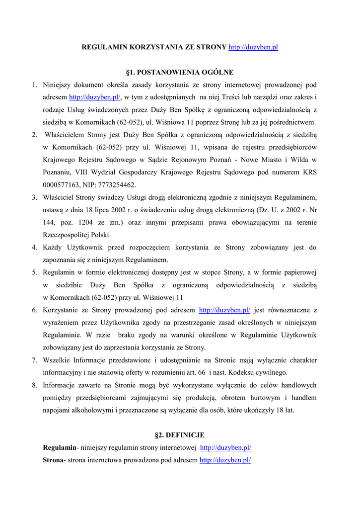 REGULAMIN KORZYSTANIA ZE STRONY http://duzyben.pl §1. POSTANOWIENIA OGÓLNE 1. Niniejszy dokument określa zasady korzystania ze strony internetowej prowadzonej pod adresem http://duzyben.pl/, w tym z udostępnianych na niej Treści lub narzędzi oraz zakres i rodzaje Usług świadczonych przez Duży Ben Spółkę z ograniczoną odpowiedzialnością z siedzibą w Komornikach (62-052), ul. Wiśniowa 11 poprzez Stronę lub za jej pośrednictwem. 2. Właścicielem Strony jest Duży Ben Spółka z ograniczoną odpowiedzialnością z siedzibą w Komornikach (62-052) przy ul. Wiśniowej 11, wpisana do rejestru przedsiębiorców Krajowego Rejestru Sądowego w Sądzie Rejonowym Poznań - Nowe Miasto i Wilda w Poznaniu, VIII Wydział Gospodarczy Krajowego Rejestru Sądowego pod numerem KRS 0000577163, NIP: 7773254462. 3. Właściciel Strony świadczy Usługi drogą elektroniczną zgodnie z niniejszym Regulaminem, ustawą z dnia 18 lipca 2002 r. o świadczeniu usług drogą elektroniczną (Dz. U. z 2002 r. Nr 144, poz. 1204 ze zm.) oraz innymi przepisami prawa obowiązującymi na terenie Rzeczpospolitej Polski. 4. Każdy Użytkownik przed rozpoczęciem korzystania ze Strony zobowiązany jest do zapoznania się z niniejszym Regulaminem. 5. Regulamin w formie elektronicznej dostępny jest w stopce Strony, a w formie papierowej w siedzibie Duży Ben Spółka z ograniczoną odpowiedzialnością z siedzibą w Komornikach (62-052) przy ul. Wiśniowej 11 6. Korzystanie ze Strony prowadzonej pod adresem http://duzyben.pl/ jest równoznaczne z wyrażeniem przez Użytkownika zgody na przestrzeganie zasad określonych w niniejszym Regulaminie. W razie braku zgody na warunki określone w Regulaminie Użytkownik zobowiązany jest do zaprzestania korzystania ze Strony. 7. Wszelkie Informacje przedstawione i udostępnianie na Stronie mają wyłącznie charakter informacyjny i nie stanowią oferty w rozumieniu art. 66 i nast. Kodeksu cywilnego. 8. Informacje zawarte na Stronie mogą być wykorzystane wyłącznie do celów handlowych pomiędzy przedsiębiorcami zajmującymi się produkcją, obrotem hurtowym i handlem napojami alkoholowymi i przeznaczone są wyłącznie dla osób, które ukończyły 18 lat. §2. DEFINICJE Regulamin- niniejszy regulamin strony internetowej http://duzyben.pl/ Strona- strona internetowa prowadzona pod adresem http://duzyben.pl/ Użytkownik- osoba fizyczna, która ukończyła 18 lat. Usługi- usługi elektroniczne udostępniane przez Właściciela Strony poprzez Stronę lub za jej pośrednictwem. Właściciel Strony i administrator danych osobowych - Duży Ben Spółka z ograniczoną odpowiedzialnością z siedzibą w Komornikach (62-052) przy ul. Wiśniowej 11, wpisana do rejestru przedsiębiorców Krajowego Rejestru Sądowego w Sądzie Rejonowym Poznań Nowe Miasto i Wilda w Poznaniu, VIII Wydział Gospodarczy Krajowego Rejestru Sądowego pod numerem KRS: 0000577163 NIP: 7773254462. Treści –wszelkiego rodzaju materiały udostępniane na Stronie, w tym materiały tekstowe, oprogramowanie, skrypty, grafika, zdjęcia, dźwięk, muzyka, nagrania wideo, materiały audiowizualne, elementy interaktywne i inne materiały, które Użytkownik może przeglądać lub do których może uzyskać dostęp. §3. WYMAGANIA TECHNICZNE Wymagania techniczne niezbędne dla prawidłowego działania Strony i korzystania z Usług świadczonych poprzez Stronę lub za jej pośrednictwem określone zostały poniżej: 1. Dostęp do Sieci Internet. 2. Przeglądarka internetowa: z obsługą Internet Explorer 10+, Google Chrome, Mozilla Firefox, Safari w wersjach aktualnych na dzień 17.11.2016 3. Włączona obsługa ciasteczek Właściciel strony nie odpowiada ani nie gwarantuje jednak, iż zapewnienie powyższych wymogów technicznych w każdym przypadku umożliwi korzystanie ze Strony lub z jego poszczególnych elementów w każdym przypadku i w pełnym zakresie. §4. ZASADY KORZYSTANIA ZE STRONY 1. Korzystanie ze Strony odbywa się za pośrednictwem ogólnodostępnej sieci Internet, która nie gwarantuje niezawodności ani poufności komunikacji pomiędzy Użytkownikiem a Właścicielem Strony, w tym w zakresie treści przesyłanych informacji oraz niejawności danych Użytkownika. 2. Użytkownik zobowiązuje się nie zmieniać żadnej części Strony, Treści udostępnianych na Stronie ani Usług świadczonych poprzez Stronę lub za jej pośrednictwem. 3. Użytkownik zobowiązuje się nie omijać, nie blokować ani w inny sposób nie zakłócać działania elementów zabezpieczenia Strony, ani nie podejmować działań, które uniemożliwiają lub ograniczają korzystanie ze Strony, czy Treści udostępnianych na Stronie. 4. Użytkownik ponosi wyłączną odpowiedzialność z tytułu naruszenia postanowień Regulaminu oraz z tytułu skutków takiego naruszenia 5. Właściciel Strony zastrzega sobie prawo prowadzenia prac konserwacyjnych, które mogą spowodować okresowy brak dostępności Strony oraz Usług świadczonych poprzez Stronę lub za jej pośrednictwem. 6. Właściciel Strony nie ponosi odpowiedzialności za przerwy w działaniu Strony wynikające z awarii spowodowanych wadliwym funkcjonowaniem sprzętu, oprogramowania lub łączy telekomunikacyjnych (systemów teleinformatycznych) po stronie Użytkownika. 7. Właściciel Strony nie ponosi odpowiedzialności za ograniczenie lub wyłączenie możliwości korzystania ze Strony lub Usług świadczonych poprzez Stronę lub za jej pośrednictwem spowodowane działaniem siły wyższej. 8. Właściciel Strony nie ponosi odpowiedzialności za prawne, finansowe i jakiekolwiek inne konsekwencje użycia przez Użytkownika informacji zamieszczonych na Stronie. Właściciel Strony nie odpowiada za szkody lub straty Użytkownika lub osób trzecich związane w jakikolwiek sposób z wykorzystaniem tych informacji. §5. ZASADY ŚWIADCZENIA USŁUG 1. Właściciel Strony za jej pośrednictwem będzie udostępniał następujące rodzaje Usług: a. Udostępnianie Tr
