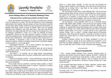Gazetka Parafialna Parafia p.w. św. Mikołaja w Wielu Wiele 15 marca 2015 r. Nr 11 (243) Ziarno Bożego Słowa na IV Niedzielę Wielkiego Postu Niebezpieczeństwo selektywnego podejścia do Bożej Prawdy Tak jak wąż miedziany był wywyższony na pustyni, na wysokim palu, tak samo Jezus był wywyższony na krzyżu. Tak samo jak spojrzenie na tego miedzianego węża ratowało życie Izraelitów, tak samo wiszący na krzyżu Chrystus jest ratunkiem dla ludzi, którzy odeszli od Boga. Wielki Post to jest czas stawiania sobie pytania: czy jesteśmy blisko Boga, czyśmy od Niego nie odeszli? Nasze czasy nie sprzyjają głębokiemu życiu religijnemu, życiu wiary, gdzie Jezus i Jego krzyż mają wiele do powiedzenia. Źle pojęta światowość bez trudu wdziera się do ludzkiego serca. Jedni nie praktykują uczestnictwa w liturgii, inni w ogóle nie przejmują się Bożymi przykazaniami. Jeszcze inni bez trudu rezygnują z przyjaźni z Jezusem za „kilka srebrników świętego spokoju”. Charakterystyczną cechą religijności naszych czasów jest tak zwana „selektywność”. Coraz częściej wybieramy sobie z Bożej nauki to, co nam odpowiada, a rezygnujemy z tego, co nam nie pasuje. Ktoś przedstawił obrazowo to zjawisko, mówiąc, że dzisiejszy człowiek bierze do ręki Biblię i długopis, a potem wykreśla to, co mu nie odpowiada. – Wspomaganie biednych? – Tak, to bardzo potrzebne, więc zgadzam się, ale wybaczyć 77 razy to już nieżyciowe, zatem odrzucam. – Czcić ojca i matkę? – To piękne i szlachetne, zatem tak, ale być wiernym w małżeństwie na dobre i na złe aż do śmierci, to za trudne i nie na dzisiejsze czasy, zatem nie zgadzam się. – Nie kradnij? – To oczywiste, ale nie zabijaj dziecka nienarodzonego, to nieludzkie i ograniczające prawo do wolności i realizacji siebie, zatem pod tym się nie podpisuję. – Troszczyć się i zabiegać o pokój? – To wyraz szlachetności, zatem tak, ale nie żyj na próbę przed ślubem, to brzmi jak średniowiecze, jak jakieś zacofanie, zatem z tym się nie identyfikuję. W ten sposób można by wymieniać i wymieniać kolejne przykłady, w których dokonuje się selekcji, dzieląc Boże prawdy na życiowe i nieżyciowe, na słuszne i niesłuszne, na dzisiejsze i niedzisiejsze... Tymczasem ukrzyżowany Chrystus przypomina nam, że Boże słowo przyjmuje się w całości, albo w ogóle się go nie przyjmuje. Tak jak nie można przyjąć tylko części Boga. Przyjmuje się Go albo całego, albo się Go w ogóle nie przyjmuje. Bo to, co Bóg chce nam ofiarować, nie jest w części dobre, a w części złe, nie jest w części zdrowe, a w części zatrute. Wszystko, co Jezus nam daje, jest potrzebne dla naszego ocalenia, zbawienia, życia wiecznego. Jezus oddał za nas całe swoje życie, poświęcił się do samego końca i tego także od nas oczekuje. Stawka jest nieprawdopodobna – jest nią niebo. Tyle razy patrzymy na Jego krzyż w czasie Wielkiego Postu. Tyle razy ten krzyż całujemy podczas kolędy, tyle razy przed tym krzyżem klękamy w naszych domach. Tylu spośród nas ten krzyż nosi na swoim sercu. On jest dla nas szczególnym ratunkiem, by to, co światowe, co czysto doczesne, co bezbożne, nie wypłukało nas z Boga. Warto na krzyż często spoglądać, warto przy nim często się zatrzymywać, warto przez niego patrzeć na nasze pomysły na szczęście i na nasze życie. Jest taka legenda o krzyżu wawelskim. Mówi ona, jak to młodziutka królowa Jadwiga miała poślubić księcia Jagiełłę. I trudno jej było się z tym zgodzić, kochała innego – Wilhelma Habsburga. Ale jednocześnie doskonale wiedziała, że to małżeństwo to niepowtarzalna szansa dla pogańskiej Litwy, by przyjąć chrzest. Mówi ta legenda, że Jadwiga w tym czasie często modliła się przed czarnym wawelskim krzyżem, pytając Jezusa, co ma zrobić. I Chrystus miał się do niej z tego krzyża odezwać, mówiąc: „Czyń, co widzisz”. A widziała Jadwiga ogromne Chrystusowe poświęcenie i ofiarę, którą złożył dla człowieka. I zrozumiała, że również ona musi ze swojego życia uczynić ofiarę, by ci, którzy Chrystusa jeszcze nie znają, mogli Go poznać i się zbawić. Dzisiejsza Ewangelia zachęca nas do takiego spoglądania na krzyż, jak spoglądała na niego św. Jadwiga. By ten krzyż nadawał sens wszystkiemu, co ma smak ofiary. Do takiego spoglądania, by świat, który krzyż chce wyrwać z naszego serca, nie zdołał tego uczynić. Bo tylko w znaku krzyża jest nasze zbawienie. Ks. Tomasz Bajer Ogłoszenia duszpasterskie 1. Dziś – czwarta niedziela Wielkiego Postu, nazywana niedzielą radości, od pierwszych słów antyfony mszalnej na wejście: „Raduj się, Jerozolimo”. Powodem tej radości wyrażonej we wspomnianych wyżej słowach, a także w różowym kolorze szat liturgicznych, ozdobieniu ołtarzy kwiatami i grze na organach nie tylko dla podtrzymania śpiewu, jest zbawienie w Chrystusie. Uczyńmy wszystko aby z niego w pełni skorzystać. 2. Jutro przypada wspomnienie dowolne św. Patryka, misjonarza i patrona Irlandii. Swoją modlitwą obejmijmy jutrzejszych solenizantów i Polaków którzy w poszukiwaniu pracy udali się na Zieloną Wyspę. 3.W środę o godz. 1700 nowenna do Matki Bożej Nieustającej Pomocy w łączności ze Mszą Świętą wieczorną. 4. W czwartek przypada uroczystość św. Józefa, oblubieńca Najświętszej Maryi Panny, patrona i opiekuna Kościoła, patrona ojców, a także wielu z nas noszących jego imię od chrztu i bierzmowania. Na Mszę Świętą o godz. 1700 serdecznie zapraszamy ojców naszej parafii a także wszystkich solenizantów i solenizantki. W czwartek też adoracja Najświętszego Sakramentu od zakończenia porannej Mszy świętej aż do wieczornej liturgii. O przewodniczenie prosimy grupę II. O godzinie 1500 Msza święta zbiorowa i Koronka do Bożego Miłosierdzia. Okazja do spowiedzi świętej od godziny 1600-1700. 5. Zachęcamy do