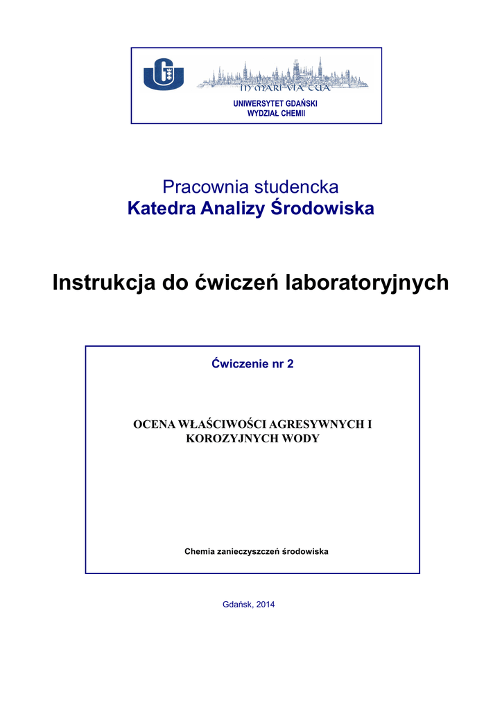 UNIWERSYTET GDAŃSKI WYDZIAŁ CHEMII Pracownia studencka Katedra Analizy Środowiska Instrukcja do ćwiczeń laboratoryjnych Ćwiczenie nr 2 OCENA WŁAŚCIWOŚCI AGRESYWNYCH I KOROZYJNYCH WODY Chemia zanieczyszczeń środowiska Gdańsk, 2014 2. Chemia zanieczyszczeń środowiska – ocena właściwości agresywnych i korozyjnych wody 2 1. CZĘŚĆ TEORETYCZNA Woda jako czysty związek wodoru i tlenu (H2O) w przyrodzie nie występuje. Jest zawsze bardzo rozcieńczonym roztworem soli, kwasów, zasad i gazów. Skład chemiczny wód zależy od ich pochodzenia. Wody opadowe zawierają niewielką ilość domieszek. Wody podziemne przesiąkające przez warstwy skorupy ziemskiej ulegają wzbogaceniu zarówno w składniki mineralne jak i związki organiczne. Wody powierzchniowe zawierają zwykle mniej składników mineralnych niż wody podziemne, ale charakteryzują się wyższą zawartością substancji organicznych pochodzenia naturalnego i przemysłowego. Wody do produkcji wody pitnej poddawane są różnym procesom uzdatniania w zależności od rodzaju i ilości usuwanych zanieczyszczeń. Efektywność stosowanych metod uzdatniania wody ma istotny wpływ na procesy zachodzące w systemie dystrybucji, w wyniku których jakość wody może ulec wtórnemu pogorszeniu. Jednym z takich niepożądanych procesów jest zjawisko korozji, którego skutkiem może być niszczenie instalacji wodociągowych i wtórne pogorszenie jakości wody. Korozja instalacji wodociągowych dotyczy w takim samym stopniu wody zimnej jak i ciepłej i jest zjawiskiem nieuniknionym, które może zostać spowolnione w zależności od charakterystyki wody oraz specyficznych technologii uzdatniania. W rzeczywistości zjawiska korozji rur są bardzo złożone i zależą od wielu czynników m.in. od składu chemicznego wody, rodzajów materiałów zastosowanych w instalacji, warunków hydraulicznych czy też przebiegu sieci. Zasadniczo wyróżnić można dwa rodzaje korozji instalacji wodociągowych: • elektrochemiczna wywołana działaniem elektrolitów • biologiczna jako efekt działania mikroorganizmów. Woda podawana do sieci powinna znajdować się w równowadze węglanowo-wapniowej (woda stabilna), a więc nie powinna rozpuszczać węglanu wapnia. Podstawowa reakcja w oparciu, o którą dokonywana jest ocena właściwości wody to równowagowa rekcja wytrącania lub rozpuszczania węglanu wapnia: Dwutlenek węgla występujący w wodzie w dużym stopniu odpowiedzialny jest za stabilność wody oraz jej korozyjność. Gazowy dwutlenek węgla rozpuszczony w wodzie nazywany wolnym dwutlenkiem węgla, tylko w niewielkim stopniu reaguje z wodą tworząc zdysocjowany kwas węglowy. Sumaryczna zawartość wolnego dwutlenku węgla oraz związanego dwutlenku węgla stanowi ogólny dwutlenek węgla. Związany dwutlenek węgla znajduje się w wodzie pod postacią wodorowęglanów HCO3– i węglanów CO32-. Postać, w jakiej dwutlenek węgla występuje w wodach naturalnych zależy od ich pH (Tabela 1). 2. Chemia zanieczyszczeń środowiska – ocena właściwości agresywnych i korozyjnych wody 3 Tabela 1. Występowanie różnych form dwutlenku węgla w zależności od pH wody Praktycznie można przyjąć, ze przy pH < 4 dwutlenek węgla w wodzie występuje całkowicie w postaci gazowej, a przy wzroście pH > 8,3 zanika wolny CO2 i pojawia się CO2 związany w postaci wodorowęglanowej i węglanowej. Schemat zależności pomiędzy różnymi formami dwutlenku węgla w wodzie przedstawiono na Rys. 1. Rys. 1. Formy występowania dwutlenku węgla Zwiększenie zawartości CO2 w wodzie spowoduje przesunięcie reakcji wytrącania lub rozpuszczania węglanu wapnia w prawą stronę (w kierunku rozpuszczania CaCO3), a zmniejszenie zawartości CO2 spowoduje wydzielanie osadu CaCO3. Wydzielający się osad powoduje powstanie warstwy chroniącej powierzchnię przed korozją. W takim przypadku mówimy o właściwościach inkrustacyjnych wody. Woda o skłonności do rozpuszczania osadu węglanu wapnia to woda o charakterze agresywnym mogąca powodować korodowanie konstrukcji metalowych i betonowych. W wąskim przedziale pomiędzy charakterem agresywnym, a inkrustacyjnym znajduje się woda stabilna, która nie wykazuje skłonności ani do rozpuszczania ani do wytrącania węglanu wapnia. W wyniku braku równowagi węglanowo-wapniowej woda może wykazywać właściwości agresywne, co z kolei powoduje jej korozyjność. Najważniejsze czynniki, które mają wpływ na korozyjność wody to: zawartość tlenu rozpuszczonego, obecność chloru, zawartość siarczanów i chlorków, pH, twardość wody, zawartość dwutlenku węgla, temperatura i obecność mikroorganizmów (wpływających na zmianę pH i obecność np. H2S). Własności korozyjne wody ocenia się na podstawie następujących parametrów: indeks nasycenia, zawartość agresywnego 2. Chemia zanieczyszczeń środowiska – ocena właściwości agresywnych i korozyjnych wody 4 dwutlenku węgla, zasadowość ogólną wody, twardość wapniową właściwą przewodność elektryczną, chemiczne zapotrzebowanie tlenu, zawartość tlenu rozpuszczonego, zawartość siarczanów, chlorków, azotanów, jonów amonowych, miedzi oraz siarkowodoru. Wstępnego zaklasyfikowania wody do wód korozyjnych lub niekorozyjnych można dokonać na podstawie znajomości dwóch spośród trzech parametrów wody: zawartości wolnego dwutlenku węgla (kwasowości ogólnej wody), pH, twardości węglanowej wody (parametr ten dla większości wód może zostać zastąpiony zasadowością ogólną wody). OCENA WŁASNOŚCI AGRESYWNYCH I KOROZYJNYCH WODY Do oceny własności agresywnych i korozyjnych wód wykorzystuje się głównie indeksy określające stan równowagi węglanowo-wapniowej badanej wody. Porównanie aktualnego pH wody z tym (pHn) jaki woda miałaby po osiągnięciu stanu równowagi pozwala określić charakter wody. W najprostszym przypadku wartość pHn można wyliczyć w oparciu o znaną zasadowoś
