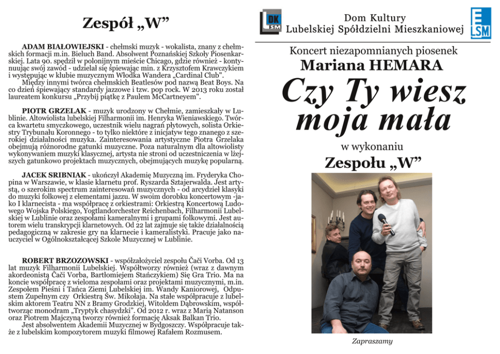 Zespół „W” Dom Kultury Lubelskiej Spółdzielni Mieszkaniowej ADAM BIAŁOWIEJSKI chełmski muzyk wokalista, znany z chełm skich formacji m.in. Bieluch Band. Absolwent Poznańskiej Szkoły Piosenkar skiej. Lata 90. spędził w polonijnym mieście Chicago, gdzie również konty nuując swój zawód udzielał się śpiewając min. z Krzysztofem Krawczykiem i występując w klubie muzycznym Włodka Wandera „Cardinal Club". Między innymi twórca chełmskich Beatlesów pod nazwą Beat Boys. Na co dzień śpiewający standardy jazzowe i tzw. pop rock. W 2013 roku został laureatem konkursu „Przybij piątkę z Paulem McCartneyem". Koncert niezapomnianych piosenek PIOTR GRZELAK muzyk urodzony w Chełmie, zamieszkały w Lu blinie. Altowiolista lubelskiej Filharmonii im. Henryka Wieniawskiego. Twór ca kwartetu smyczkowego, uczestnik wielu nagrań płytowych, solista Orkie stry Trybunału Koronnego to tylko niektóre z inicjatyw tego znanego z sze rokiej działalności muzyka. Zainteresowania artystyczne Piotra Grzelaka obejmują różnorodne gatunki muzyczne. Poza naturalnym dla altowiolisty wykonywaniem muzyki klasycznej, artysta nie stroni od uczestniczenia w lżej szych gatunkowo projektach muzycznych, obejmujących muzykę popularną. JACEK SRIBNIAK ukończył Akademię Muzyczną im. Fryderyka Cho pina w Warszawie, w klasie klarnetu prof. Ryszarda Sztajerwalda. Jest arty stą, o szerokim spectrum zainteresowań muzycznych od arcydzieł klasyki do muzyki folkowej z elementami jazzu. W swoim dorobku koncertowym ja ko I klarnecista ma współpracę z orkiestrami: Orkiestrą Koncertową Ludo wego Wojska Polskiego, Yogtlandorchester Reichenbach, Filharmonii Lubel skiej w Lublinie oraz zespołami kameralnymi i grupami folkowymi. Jest au torem wielu transkrypcji klarnetowych. Od 22 lat zajmuje się także działalnością pedagogiczną w zakresie gry na klarnecie i kameralistyki. Pracuje jako na uczyciel w Ogólnokształcącej Szkole Muzycznej w Lublinie. Mariana HEMARA Czy Ty wiesz moja mała w wykonaniu Zespołu „W” ROBERT BRZOZOWSKI współzałożyciel zespołu Čači Vorba. Od 13 lat muzyk Filharmonii Lubelskiej. Współtworzy również (wraz z dawnym akordeonistą Čači Vorba, Bartłomiejem Stańczykiem) Się Gra Trio. Ma na koncie współpracę z wieloma zespołami oraz projektami muzycznymi, m.in. Zespołem Pieśni i Tańca Ziemi Lubelskiej im. Wandy Kaniorowej, Odpu stem Zupełnym czy Orkiestrą Św. Mikołaja. Na stałe współpracuje z lubel skim aktorem Teatru NN z Bramy Grodzkiej, Witoldem Dąbrowskim, współ tworząc monodram „Tryptyk chasydzki”. Od 2012 r. wraz z Marią Natanson oraz Piotrem Majczyną tworzy również formację Aksak Balkan Trio. Jest absolwentem Akademii Muzycznej w Bydgoszczy. Współpracuje tak że z lubelskim kompozytorem muzyki filmowej Rafałem Rozmusem. Zapraszamy Marian Hemar w okresie międzywojennym był kierownikiem literackim kabaretu Qui Pro Quo. Napisał około dwóch tysięcy piosenek, był autorem dowcipów i skeczy, korespondencji prasowych, wielu przebojów kabaretowych. Był także tłumaczem. Zespół „W" powstał jesienią 2014 roku. Tworzy go trzech przyjaciół: dwóch rodowitych chełmian Adam Białowiejski (śpiew, gitary) i Piotr Grzelak (altówka) oraz warszawianin Jacek Sribniak (fortepian, śpiew). Od niedawna współpracuje z nimi Robert Brzozowski, kontrabasista z zespołu Čači Vorba. Impulsem do rozpoczęcia współpracy tych muzyków stały się wspólne zainteresowania i fascynacje polską i zagraniczną piosenką XX wieku. Pasja i radość ze wspólnego muzykowania to cechy charakterystyczne tego zespo łu. Ich repertuar obejmuje szerokie spektrum, od polskiej piosenki między wojennej, poprzez słynne songi takich bardów jak: Jaromir Nohavica, Wło dzimierz Wysocki, po bluesa i muzykę popową. Dom Kultury Lubelskiej Spółdzielni Mieszkaniowej Koncert niezapomnianych piosenek Mariana HEMARA Czy Ty wiesz moja mała w wykonaniu Zespołu „W” Program koncertu: To samo niebo muz. Joe Rixner 1938 Coquelicot kompozytor nieznany Może kiedyś innym razem muz. Władysław Daniłowski 1933 Daruj mi noc kompozytor nieznany Wspomnij mnie muz. Luigi Miagilia 1929 Nikt tylko Ty muz. Arthur Johnston 1921 Czy Ty wiesz moja mała muz. Fritz Rotter Walter Jurmann 1931 Upić się warto muz. Paweł Asłanowicz 1934 Ten wąsik muz. Leo Daniderff 1917 Nadejdą kiedyś takie dni muz. Arthur Johnston 1935 Piękny Gigolo muz. Leonello Casucci 1929 Po co, po co? muz. Władysław Daniłowski 1933 Rumba Fiesta muz. Walter G. Samuels 1931 Panna Maria gra na mandolinie muz. Hans May 1930 Tyle jest miast muz. Nacio Herb Brown 1926 Jacek Sribniak fortepian, śpiew Adam Białowiejski gitara, śpiew Piotr Grzelak altówka Robert Brzozowski kontrabas W programie m.in.: To samo niebo, Może kiedyś innym razem, Daruj mi noc, Wspomnij mnie, Nikt tylko Ty, Upić się warto, Tyle jest miast Koncert odbędzie się w poniedziałek 1 lutego 2016 r. o godz. 18.00 w sali widowiskowej Domu Kultury LSM w Lublinie, ul. K. Wallenroda 4a, tel. 81 743 48 29 www.domkulturylsm.pl Bilet 10 zł