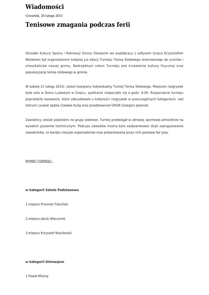 Wiadomości Czwartek, 26 lutego 2015 Tenisowe zmagania podczas ferii Ośrodek Kultury Sportu i Rekreacji Gminy Oświęcim we współpracy z sołtysem Grojca Krzysztofem Wolakiem był organizatorem kolejnej już edycji Turnieju Tenisa Stołowego skierowanego do uczniów i mieszkańców naszej gminy. Nadrzędnym celem Turnieju jest krzewienie kultury fizycznej oraz popularyzacja tenisa stołowego w gminie. W sobotę 21 lutego 2015r. został rozegrany Indywidualny Turniej Tenisa Stołowego. Miejscem rozgrywek była sala w Domu Ludowym w Grojcu, spotkanie rozpoczęło się o godz. 9:00. Rozpoczęcie turnieju poprzedziło losowanie, które zdecydowało o kolejności rozgrywek w poszczególnych kategoriach, nad którymi czuwali sędzia Czesław Kulig oraz przedstawiciel OKSiR Grzegorz Jaworski. Zawodnicy zostali podzieleni na grupy wiekowe. Turniej przebiegał w zdrowej, sportowej atmosferze na wysokim poziomie technicznym. Podczas zawodów można było zaobserwować duże zaangażowanie zawodników, co bardzo cieszyło organizatorów oraz prezentowaną przez nich postawę fair play. WYNIKI TURNIEJU : w kategorii Szkoła Podstawowa 1.miejsce Przemek Foksiński 2.miejsce Jakub Wieczorek 3.miejsce Krzysztof Wasilewski w kategorii Gimnazjum 1.Paweł Mitoraj 2.Jan Mitoraj 3.Dawid Czuwaj w kategorii Seniorzy 1.Kazimierz Pilszyk 2.Władysław Mitoraj 3.Grzegorz Smolarek w kategorii Open 1. Przemek Foksiński 2.Kazimierz Pilszyk 3.Grzegorz Wanat Walka w finale w kategorii Open przysporzyła wiele emocji, gdyż najlepszym zawodnikiem okazał się znów przedstawiciel OKSiR Przemek Foksiński. Najlepsi zawodnicy w każdej kategorii otrzymali z rąk Z-cy Wójta Gminy Oświęcim Mirosława Smolarka oraz sołtysa Grojca Krzysztofa Wolaka medale oraz nagrody rzeczowe, zakupione ze środków OKSiR. Podziękowania kierujemy również do KGW Grojec, które zaserwowało żurek oraz ciepłe napoje dla wszystkich uczestników. Dziękujemy sponsorowi – P. Stanisławowi Krawczykowi z Poręby Wielkiej za przekazanie kiełbasek i mięsa do przygotowania posiłku dla uczestników zawodów. Dziękujemy wszystkim zawodnikom za uczestnictwo w turnieju. Tym samym zapraszamy do wzięcia udziału w kolejnych edycjach.
