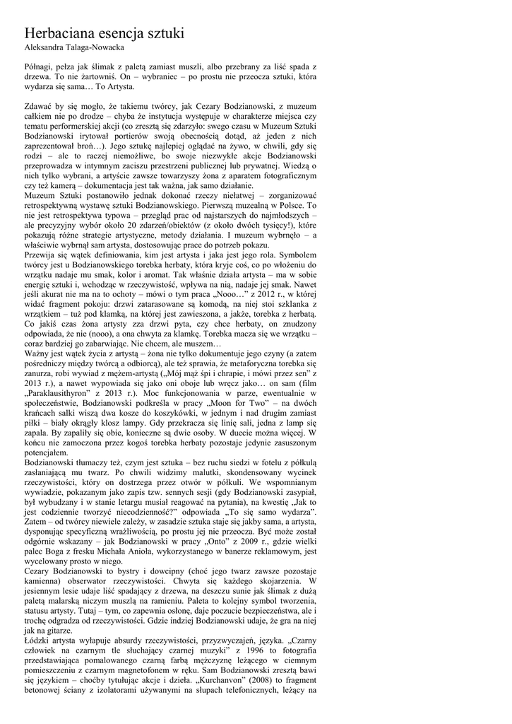 Herbaciana esencja sztuki Aleksandra Talaga-Nowacka Półnagi, pełza jak ślimak z paletą zamiast muszli, albo przebrany za liść spada z drzewa. To nie żartowniś. On – wybraniec – po prostu nie przeocza sztuki, która wydarza się sama… To Artysta. Zdawać by się mogło, że takiemu twórcy, jak Cezary Bodzianowski, z muzeum całkiem nie po drodze – chyba że instytucja występuje w charakterze miejsca czy tematu performerskiej akcji (co zresztą się zdarzyło: swego czasu w Muzeum Sztuki Bodzianowski irytował portierów swoją obecnością dotąd, aż jeden z nich zaprezentował broń…). Jego sztukę najlepiej oglądać na żywo, w chwili, gdy się rodzi – ale to raczej niemożliwe, bo swoje niezwykłe akcje Bodzianowski przeprowadza w intymnym zaciszu przestrzeni publicznej lub prywatnej. Wiedzą o nich tylko wybrani, a artyście zawsze towarzyszy żona z aparatem fotograficznym czy też kamerą – dokumentacja jest tak ważna, jak samo działanie. Muzeum Sztuki postanowiło jednak dokonać rzeczy niełatwej – zorganizować retrospektywną wystawę sztuki Bodzianowskiego. Pierwszą muzealną w Polsce. To nie jest retrospektywa typowa – przegląd prac od najstarszych do najmłodszych – ale precyzyjny wybór około 20 zdarzeń/obiektów (z około dwóch tysięcy!), które pokazują różne strategie artystyczne, metody działania. I muzeum wybrnęło – a właściwie wybrnął sam artysta, dostosowując prace do potrzeb pokazu. Przewija się wątek definiowania, kim jest artysta i jaka jest jego rola. Symbolem twórcy jest u Bodzianowskiego torebka herbaty, która kryje coś, co po włożeniu do wrzątku nadaje mu smak, kolor i aromat. Tak właśnie działa artysta – ma w sobie energię sztuki i, wchodząc w rzeczywistość, wpływa na nią, nadaje jej smak. Nawet jeśli akurat nie ma na to ochoty – mówi o tym praca „Nooo…” z 2012 r., w której widać fragment pokoju: drzwi zatarasowane są komodą, na niej stoi szklanka z wrzątkiem – tuż pod klamką, na której jest zawieszona, a jakże, torebka z herbatą. Co jakiś czas żona artysty zza drzwi pyta, czy chce herbaty, on znudzony odpowiada, że nie (nooo), a ona chwyta za klamkę. Torebka macza się we wrzątku – coraz bardziej go zabarwiając. Nie chcem, ale muszem… Ważny jest wątek życia z artystą – żona nie tylko dokumentuje jego czyny (a zatem pośredniczy między twórcą a odbiorcą), ale też sprawia, że metaforyczna torebka się zanurza, robi wywiad z mężem-artystą („Mój mąż śpi i chrapie, i mówi przez sen” z 2013 r.), a nawet wypowiada się jako oni oboje lub wręcz jako… on sam (film „Paraklausithyron” z 2013 r.). Moc funkcjonowania w parze, ewentualnie w społeczeństwie, Bodzianowski podkreśla w pracy „Moon for Two” – na dwóch krańcach salki wiszą dwa kosze do koszykówki, w jednym i nad drugim zamiast piłki – biały okrągły klosz lampy. Gdy przekracza się linię sali, jedna z lamp się zapala. By zapaliły się obie, konieczne są dwie osoby. W duecie można więcej. W końcu nie zamoczona przez kogoś torebka herbaty pozostaje jedynie zasuszonym potencjałem. Bodzianowski tłumaczy też, czym jest sztuka – bez ruchu siedzi w fotelu z półkulą zasłaniającą mu twarz. Po chwili widzimy malutki, skondensowany wycinek rzeczywistości, który on dostrzega przez otwór w półkuli. We wspomnianym wywiadzie, pokazanym jako zapis tzw. sennych sesji (gdy Bodzianowski zasypiał, był wybudzany i w stanie letargu musiał reagować na pytania), na kwestię „Jak to jest codziennie tworzyć niecodzienność?” odpowiada „To się samo wydarza”. Zatem – od twórcy niewiele zależy, w zasadzie sztuka staje się jakby sama, a artysta, dysponując specyficzną wrażliwością, po prostu jej nie przeocza. Być może został odgórnie wskazany – jak Bodzianowski w pracy „Onto” z 2009 r., gdzie wielki palec Boga z fresku Michała Anioła, wykorzystanego w banerze reklamowym, jest wycelowany prosto w niego. Cezary Bodzianowski to bystry i dowcipny (choć jego twarz zawsze pozostaje kamienna) obserwator rzeczywistości. Chwyta się każdego skojarzenia. W jesiennym lesie udaje liść spadający z drzewa, na deszczu sunie jak ślimak z dużą paletą malarską niczym muszlą na ramieniu. Paleta to kolejny symbol tworzenia, statusu artysty. Tutaj – tym, co zapewnia osłonę, daje poczucie bezpieczeństwa, ale i trochę odgradza od rzeczywistości. Gdzie indziej Bodzianowski udaje, że gra na niej jak na gitarze. Łódzki artysta wyłapuje absurdy rzeczywistości, przyzwyczajeń, języka. „Czarny człowiek na czarnym tle słuchający czarnej muzyki” z 1996 to fotografia przedstawiająca pomalowanego czarną farbą mężczyznę leżącego w ciemnym pomieszczeniu z czarnym magnetofonem w ręku. Sam Bodzianowski zresztą bawi się językiem – choćby tytułując akcje i dzieła. „Kurchanvon” (2008) to fragment betonowej ściany z izolatorami używanymi na słupach telefonicznych, leżący na usypanej ziemi jak nagrobek – sugestia możliwości kontaktu ze zmarłymi, nieobecnymi, przodkami, z jakąś drugą stroną… „Duchamtee” z 2012 r. to słuchawka prysznicowa, z której jak strużki wody wydobywają się nitki zakończone – oczywiście – torebkami herbaty. Readymade Marcela Duchampa przefiltrowane przez wrażliwość Bodzianowskiego. Na koniec – żarcik, który niełatwo dostrzec (można wypożyczyć lornetkę w portierni). Na budynku Muzeum Sztuki Cezary Bodzianowski umocował pędzelki. Pracę zatytułował „Drapacze chmur” – tyle że tutaj zamiast nieprzyjemnego drapania obłoki są delikatnie muskane, zapewne także – kolorowane. I jeszcze coś – w małym oddaleniu od muzeum, w ogrodzie Akademii Muzycznej przy Gdańskiej jest drzewo, które zaskakuje. Otóż na jego gałęziach wiszą… kolorowe kaski. To „Owoce pracy” Bodzianowskiego. Nawet od pożytecznego trudu warto odpocząć – chwila, w k